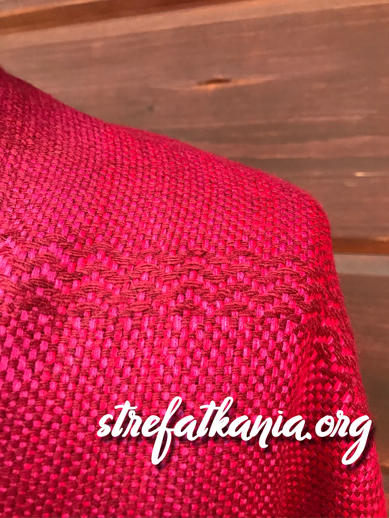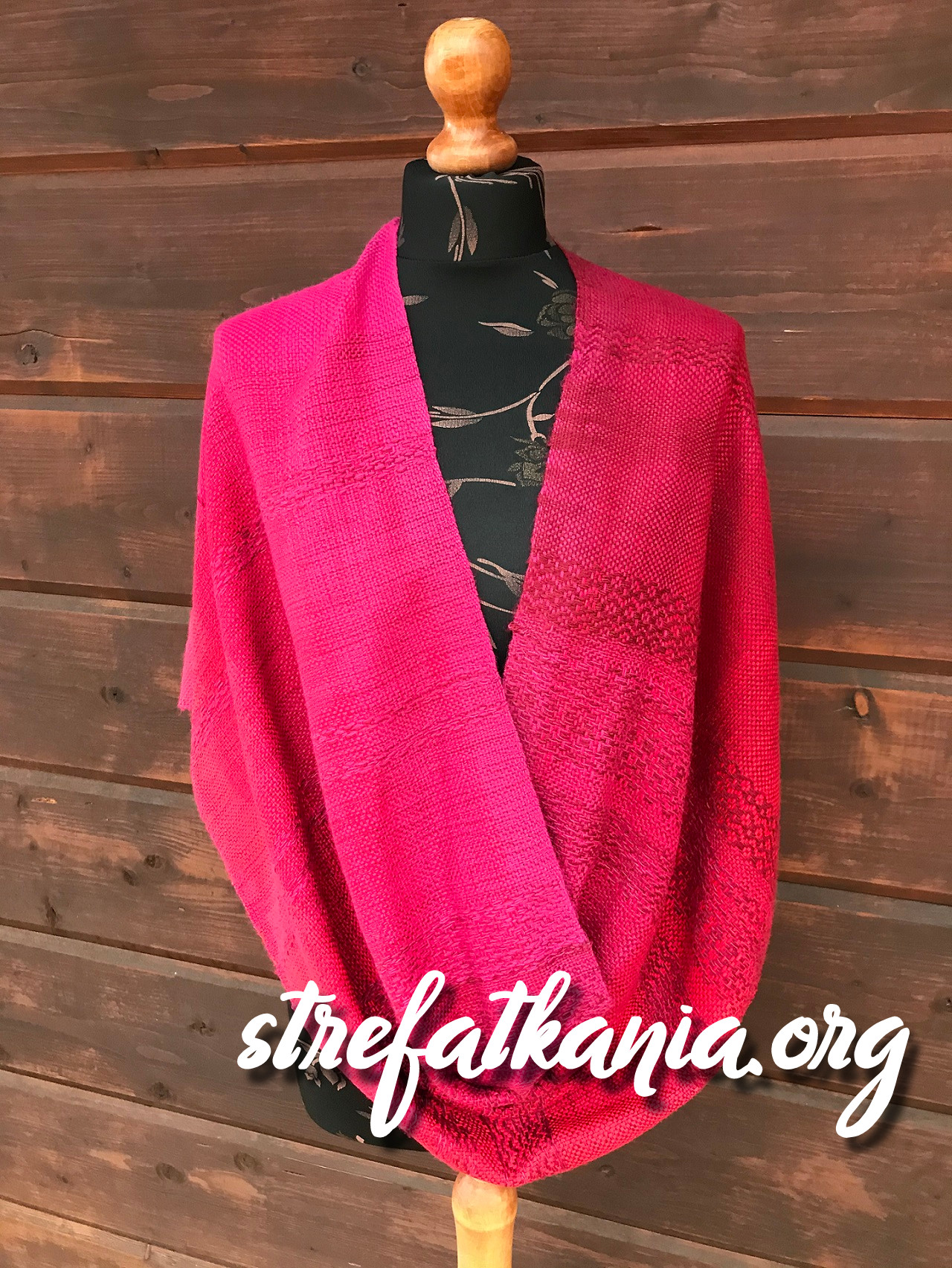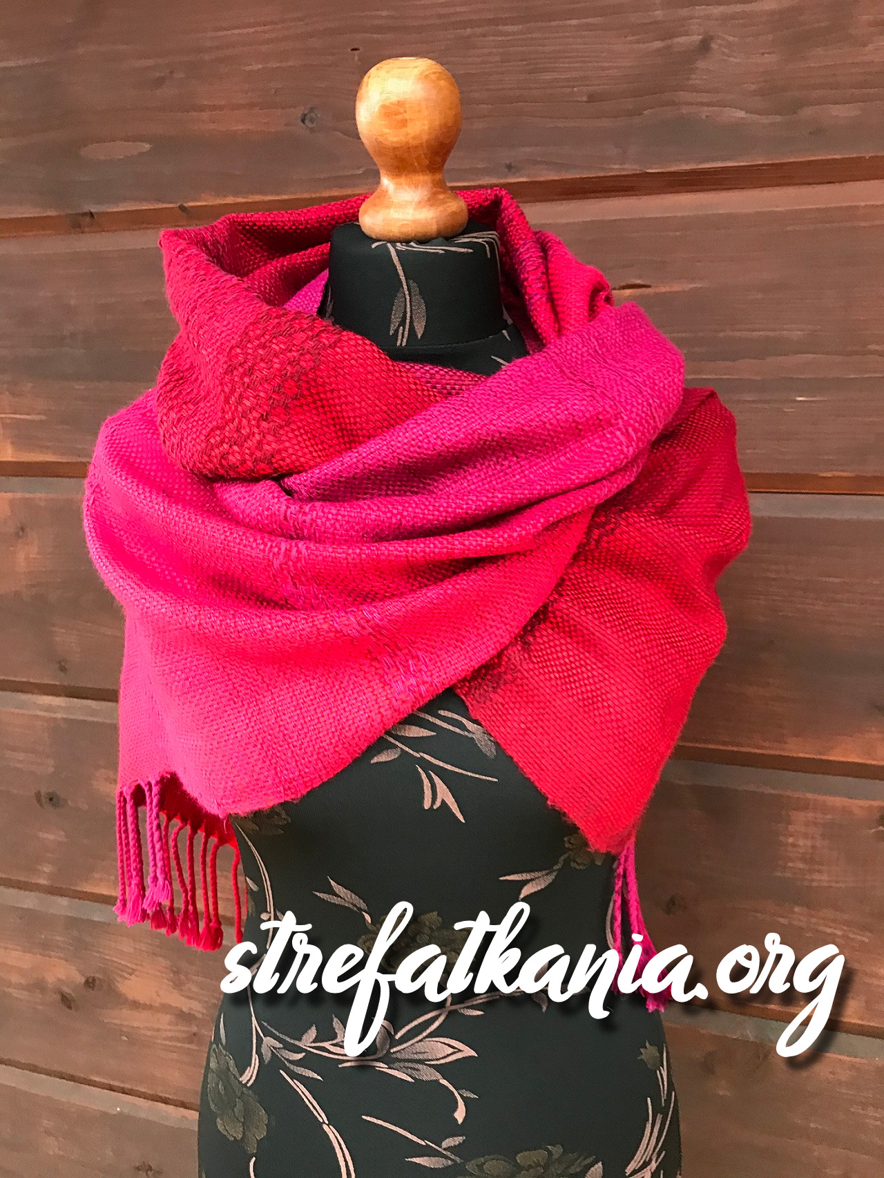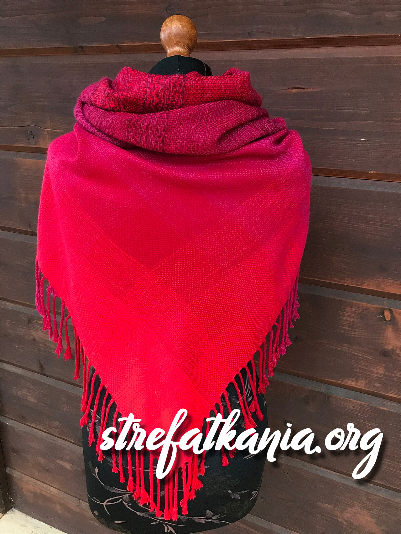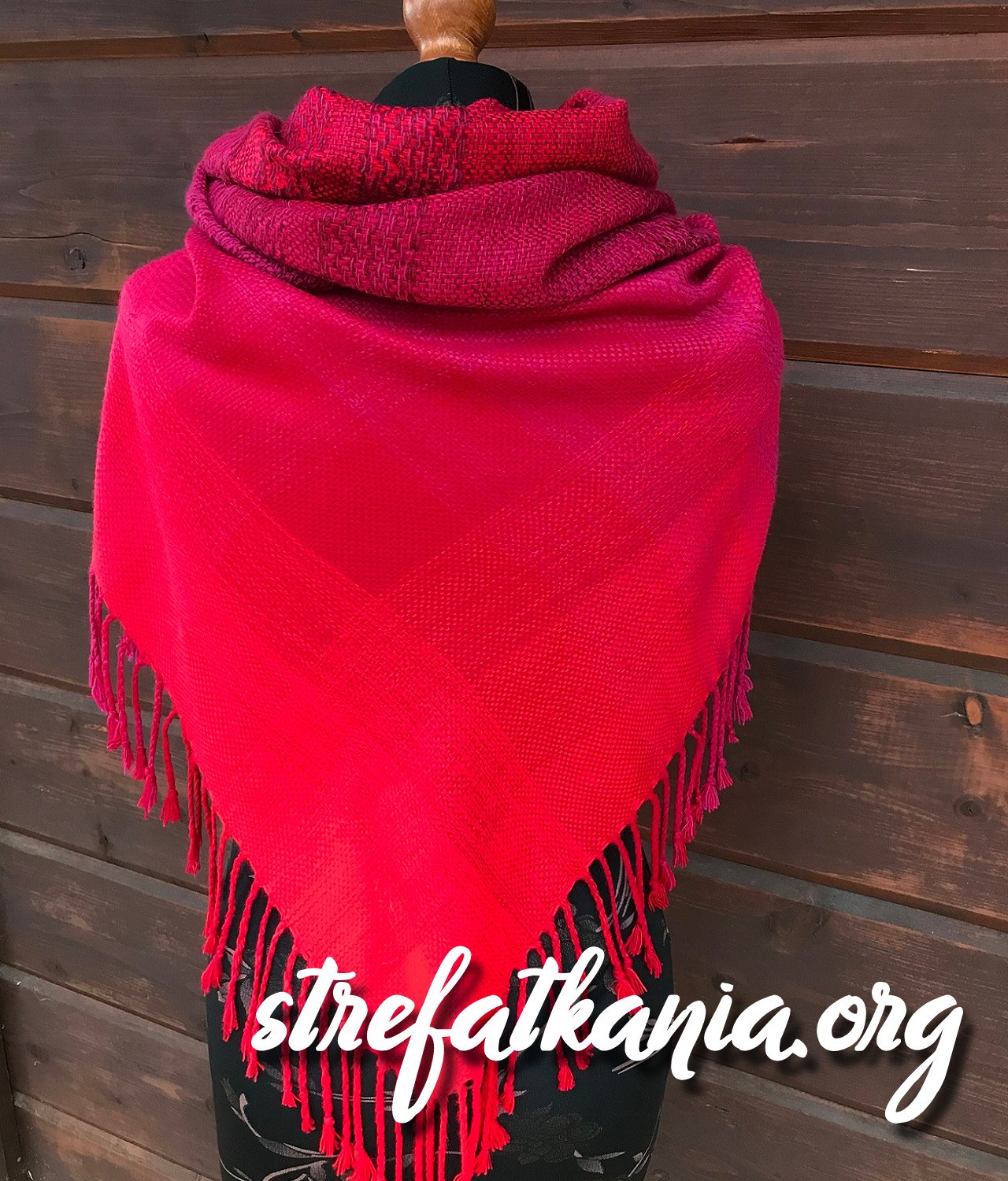 Szalo-chusta wykonana jest z włóczki z długimi przejściami kolorystycznymi z efektem ombre. Paleta barw bordo/piwonia/czerwień/intensywna czerwień.