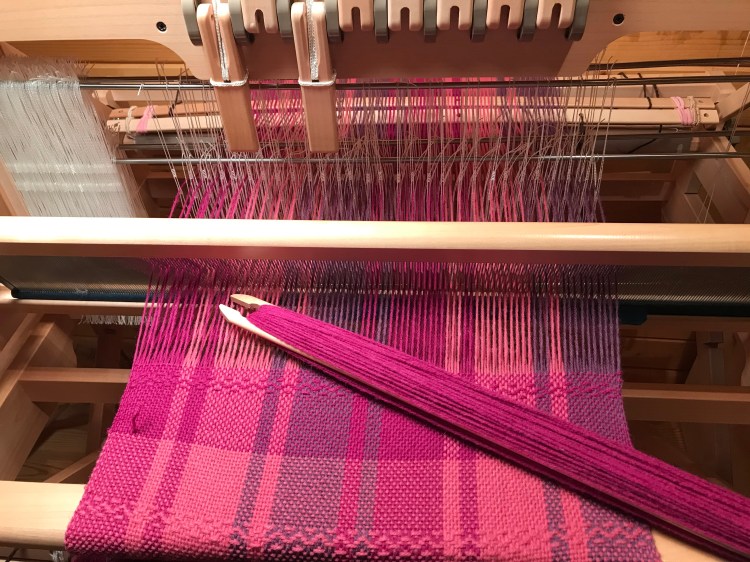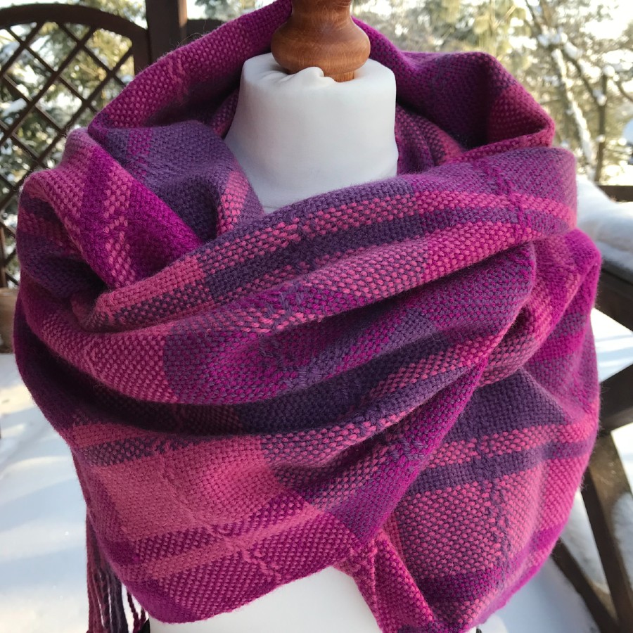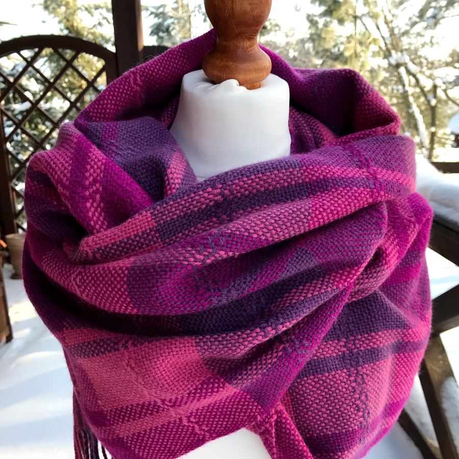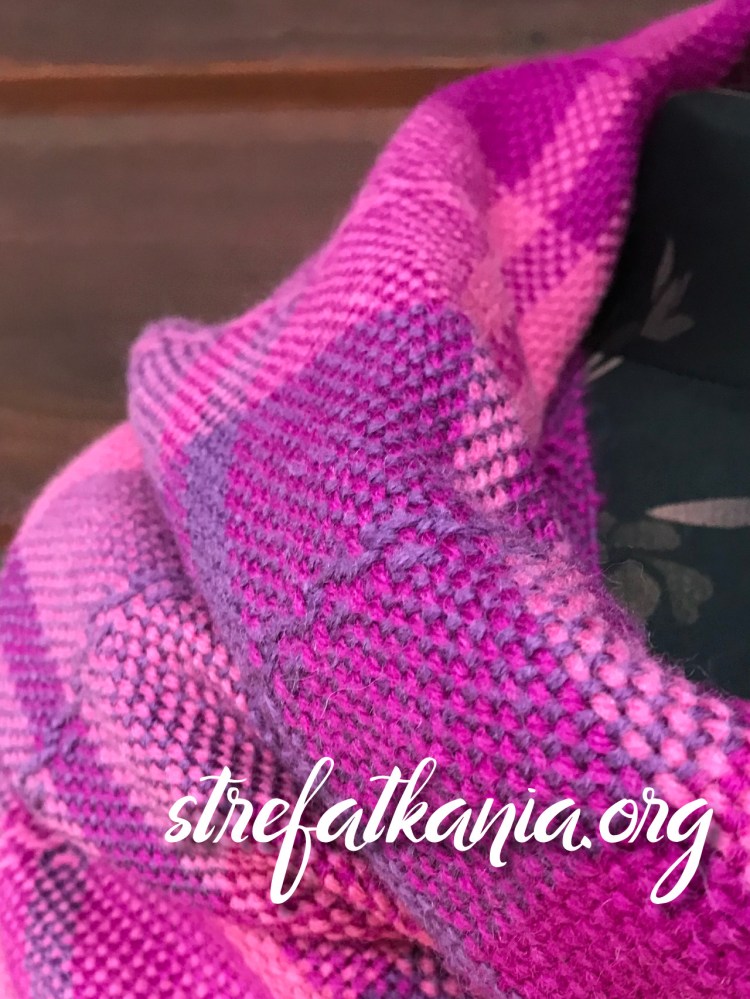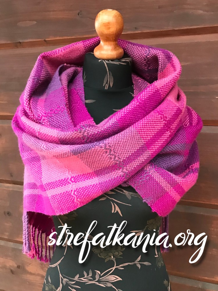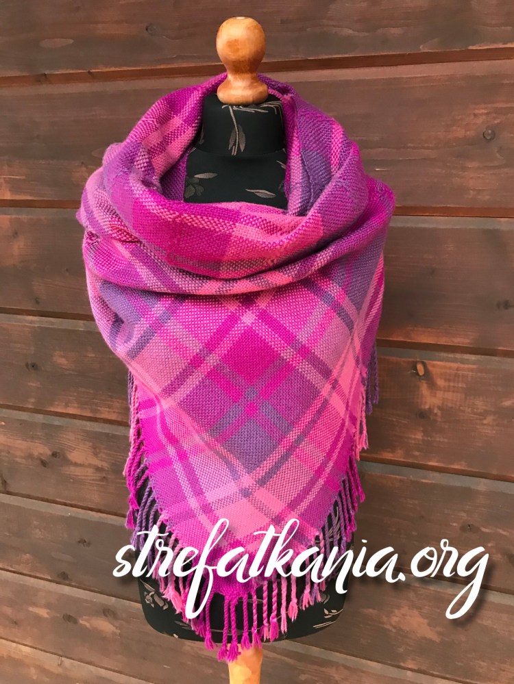 Śliwkowa kratka wytkana jest z ciepłej włóczki w składzie której znajduje się 40% wełny i 60% akrylu. Producent włóczki zaleca aby prać ręcznie w ciepłej wodzie, nie wyżymać, nie prasować. Ja wszystkie moje szale po wytkania piorę (czasami nawet w pralce, ale stosuję program pranie ręczne) potem suszę rozłożone i prasuję żelazkiem z parą.