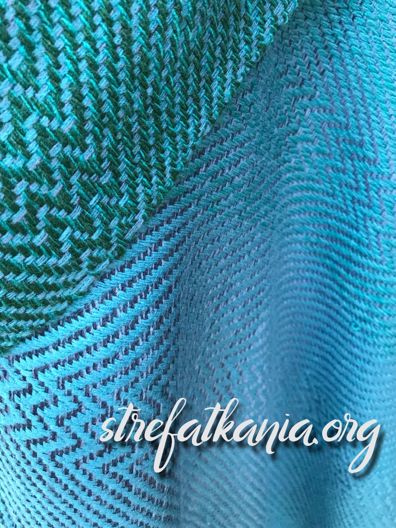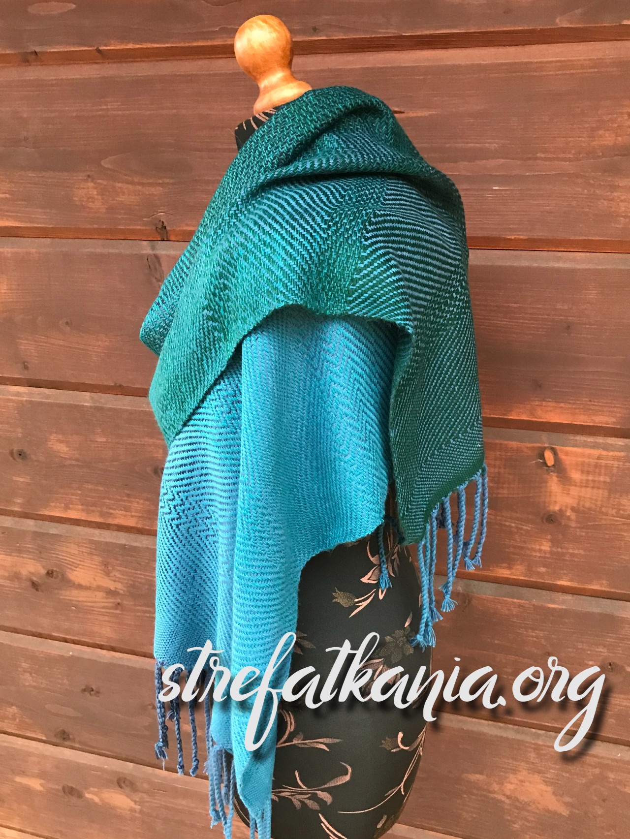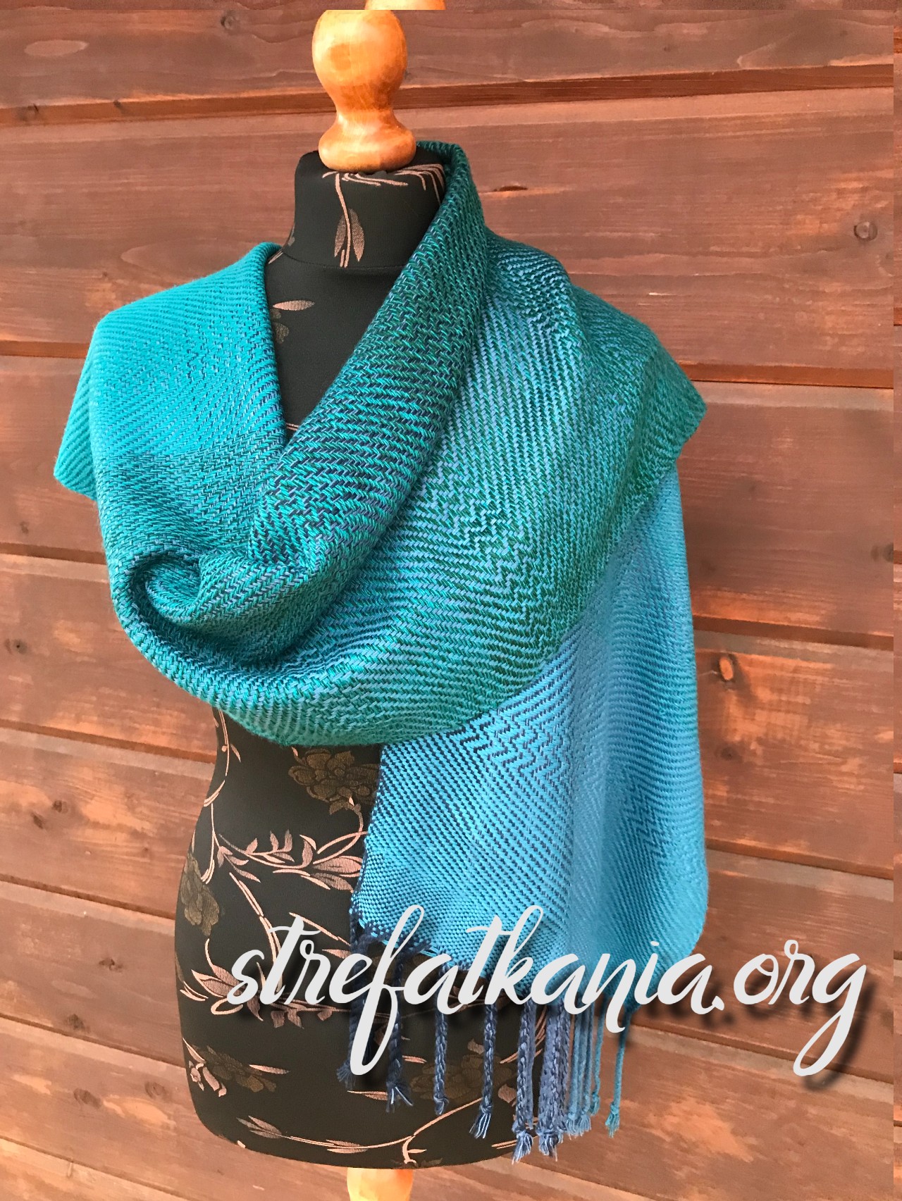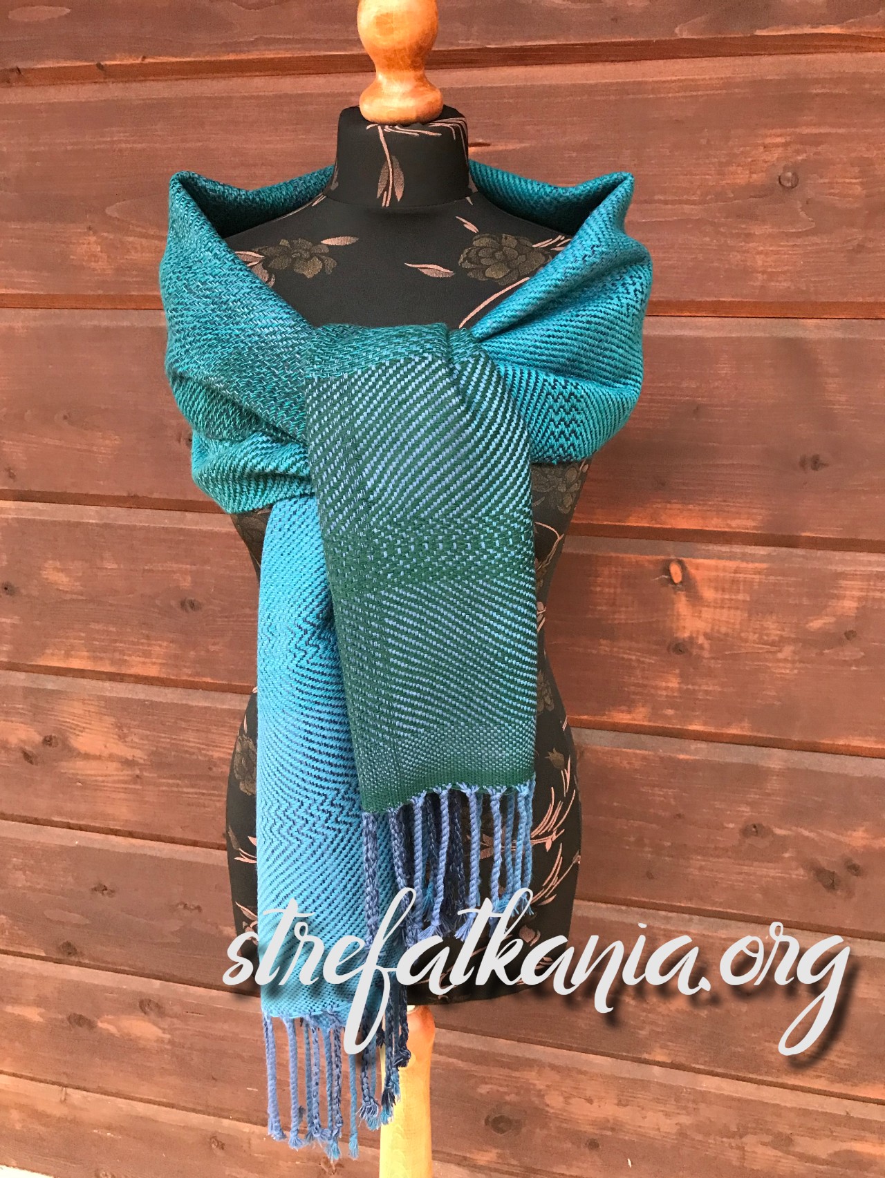 Szal „Głębia oceanu”:wykonany jest z włóczki z długimi przejściami kolorystycznymi z efektem ombre.