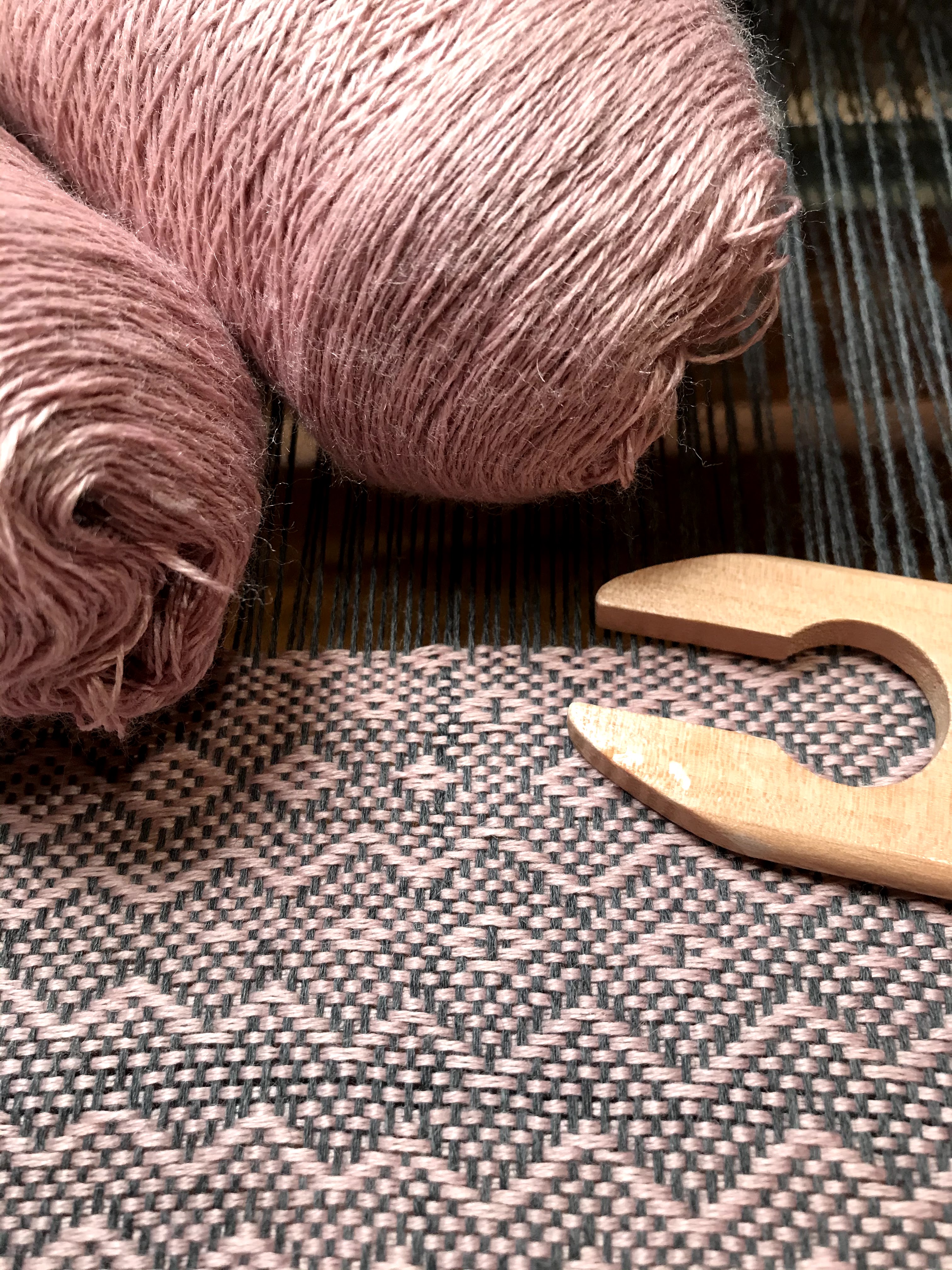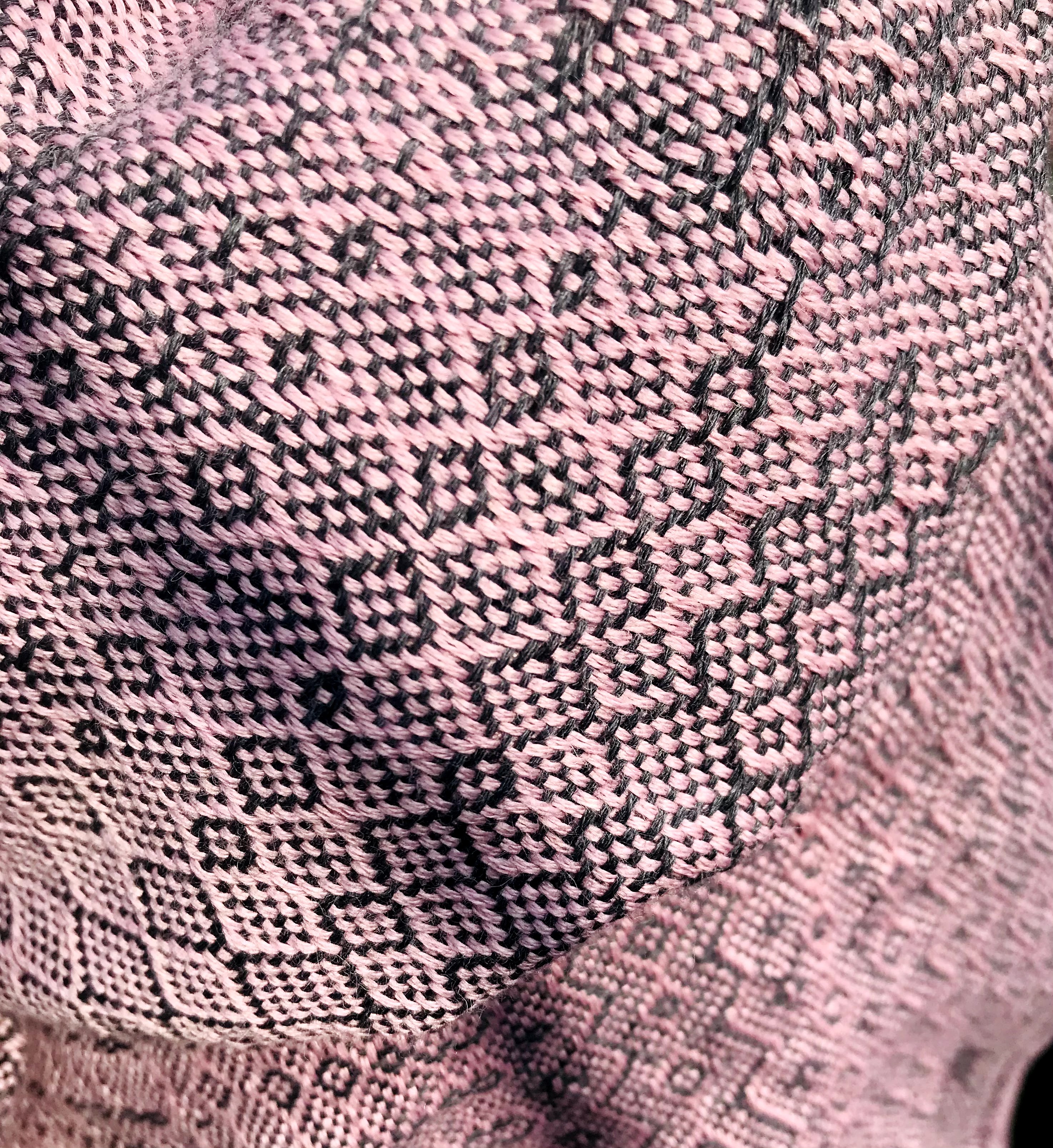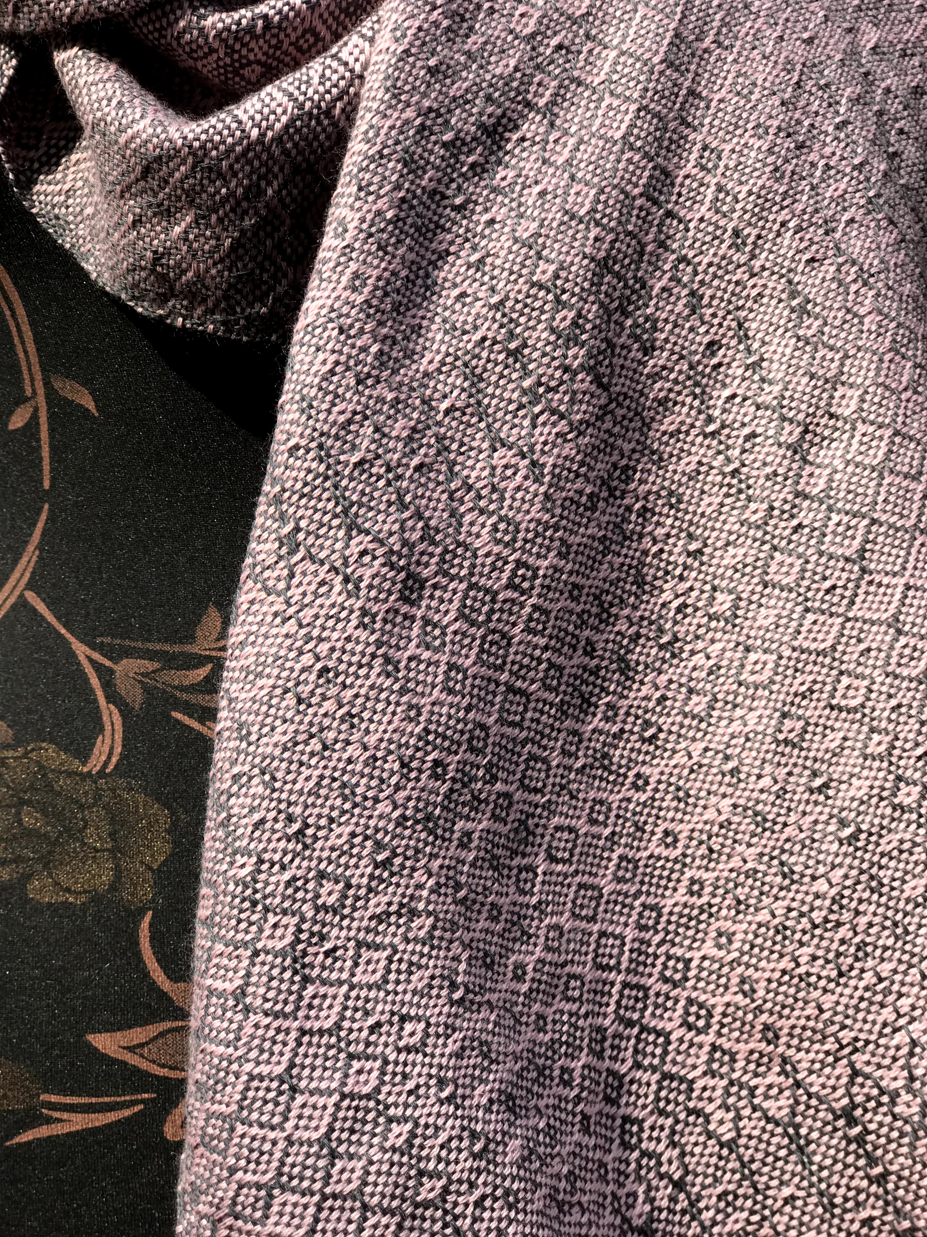 A sam szal jest cieniutki i zwiewny – na tyle na ile może buć zwiewny szal wytkany z merynosa. Przędza: osnowa to 100% szary merynos – superwash, wątek pudrowy róż.