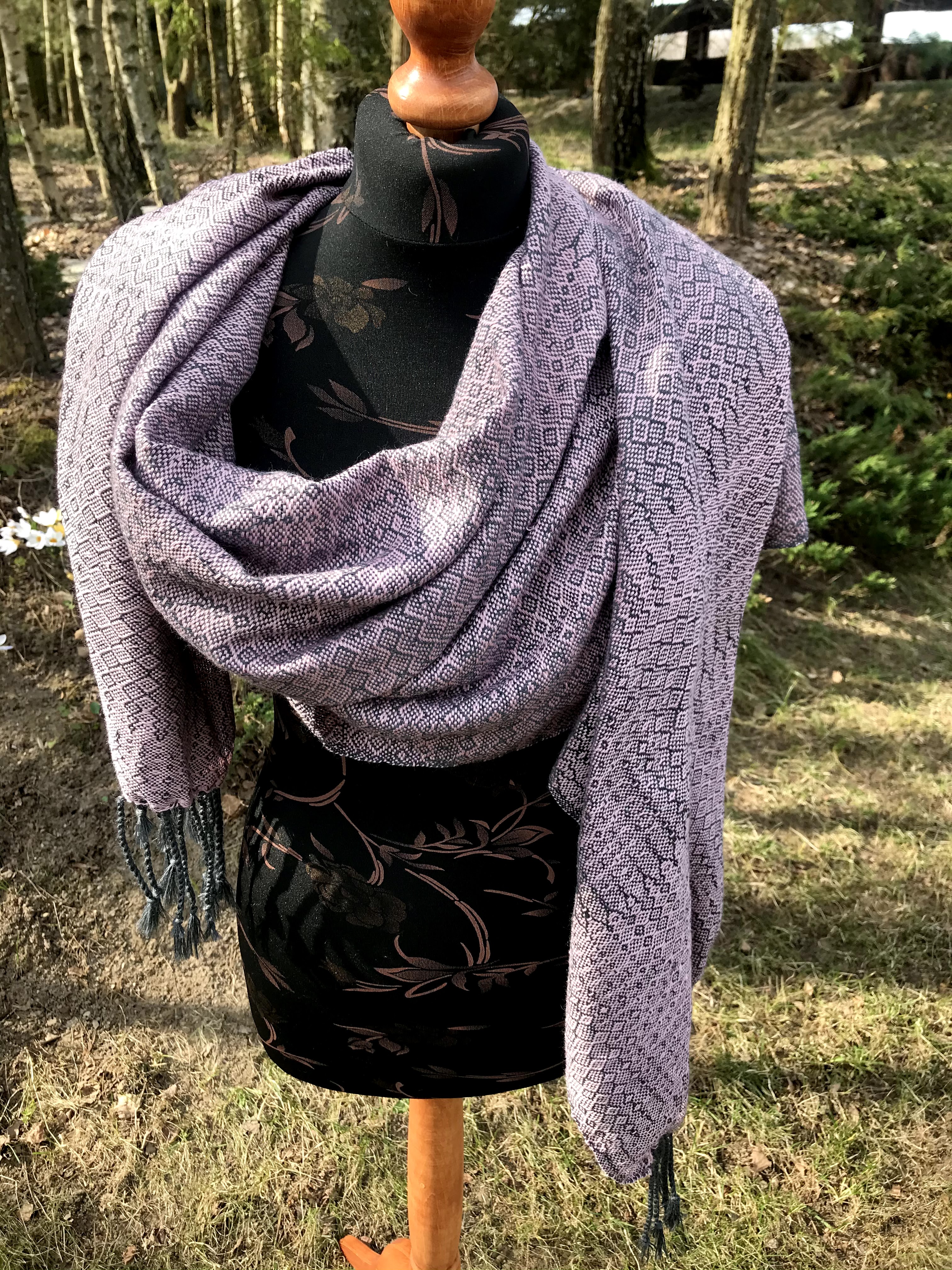 Ten szal to moja pierwsza praca, którą wytkałam na 8 nicielnicach. Wzór ujął mnie tak bardzo, że postanowiłam przekonfigurować moje krosna. Może kiedyś o tym napiszę.