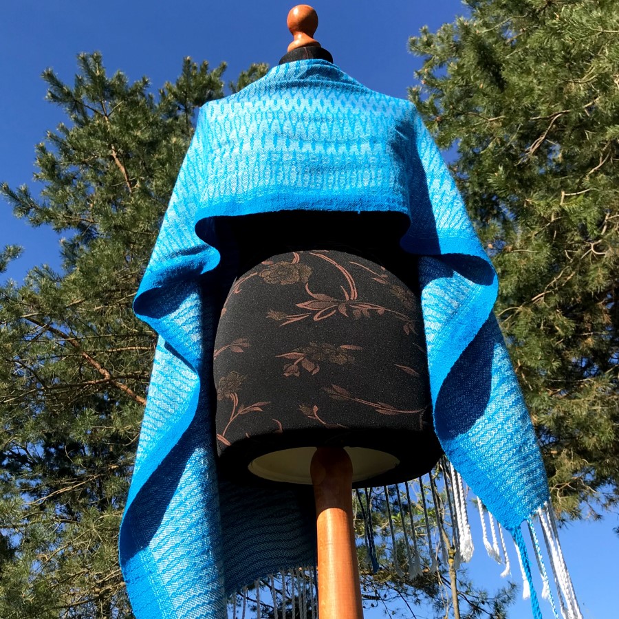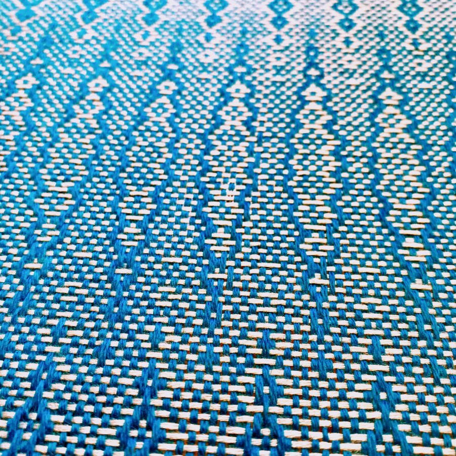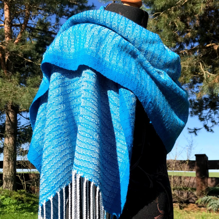 Blue Ice – to świeżo wytkany szal w zimnych kolorach. Wytałam go z miękkiej bawełny – osnowa i merynosa – wątek. Osiągnęłam swój cel – szal jest miękki, cienki i ciepły. Na dodatek można go swobodnie prać i nie martwić się, że się zbiegnie.