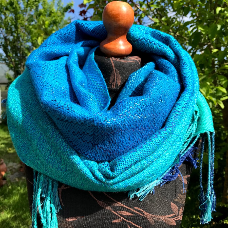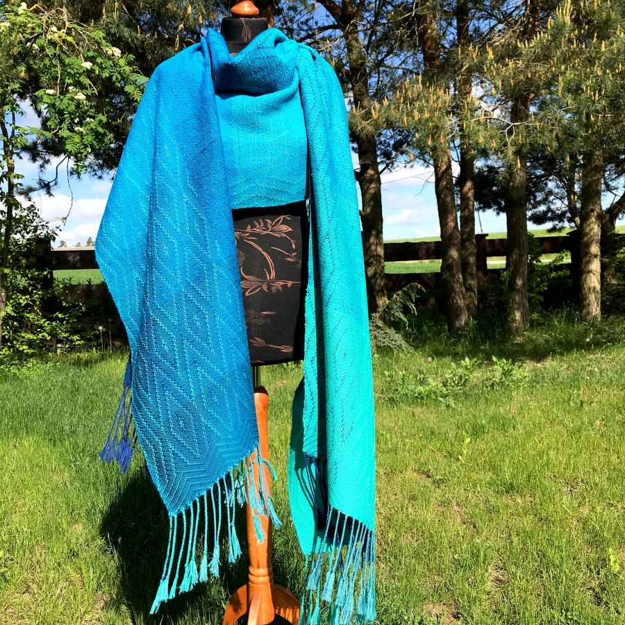 Wymiary 58 cm x 220 cm + frędzle. Przędza- merynos.