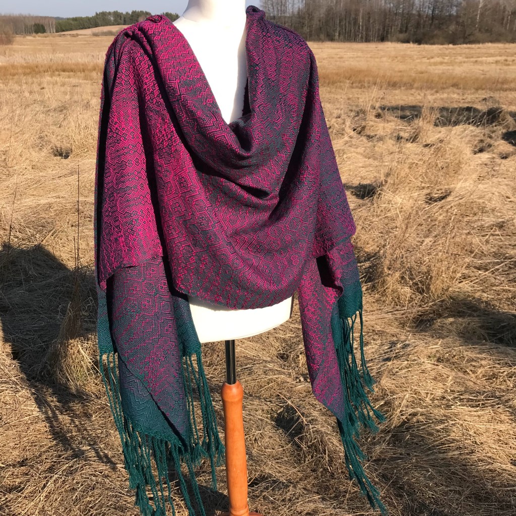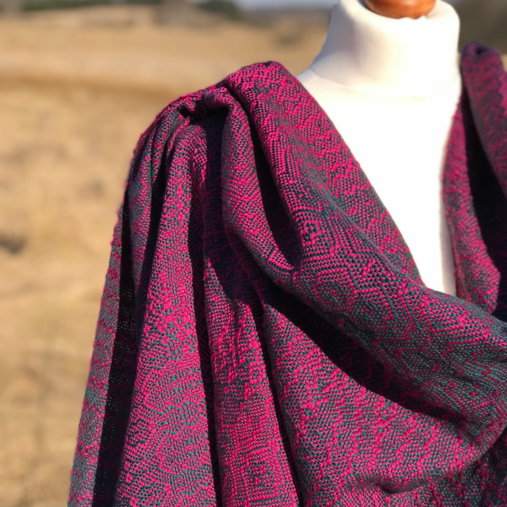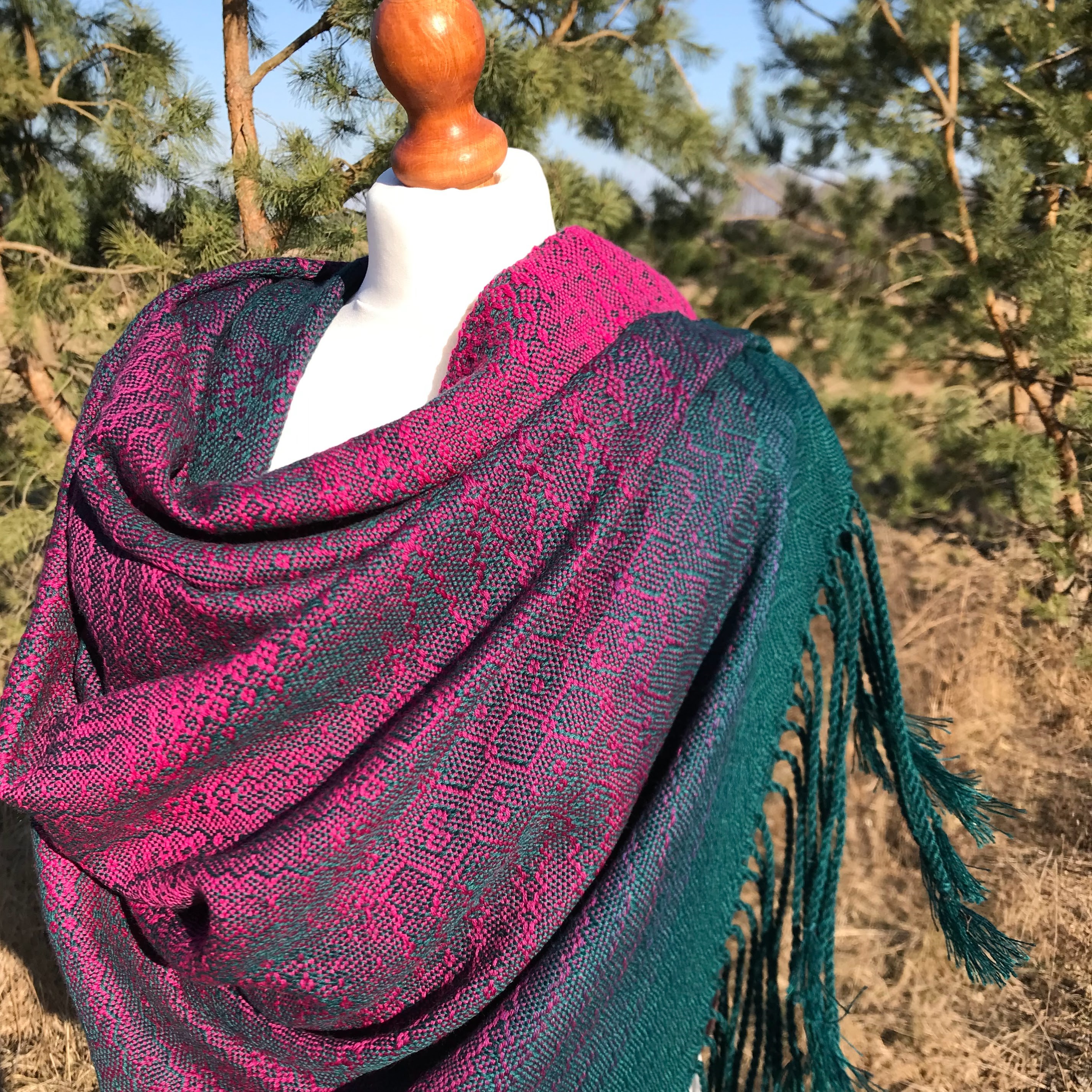 Kolory – osnowa zieleń butelkowa, wątek, odcienie fuksji.