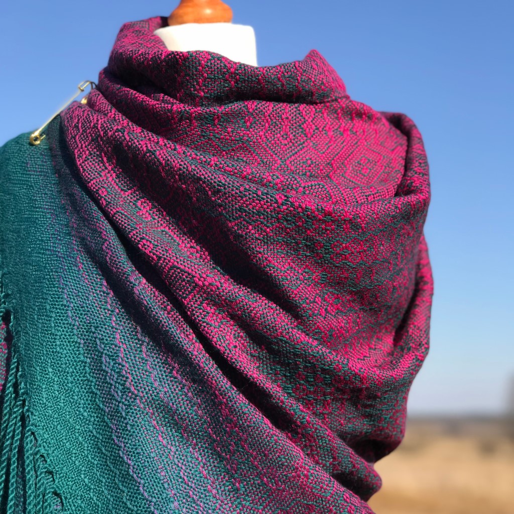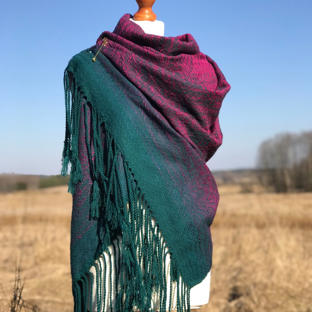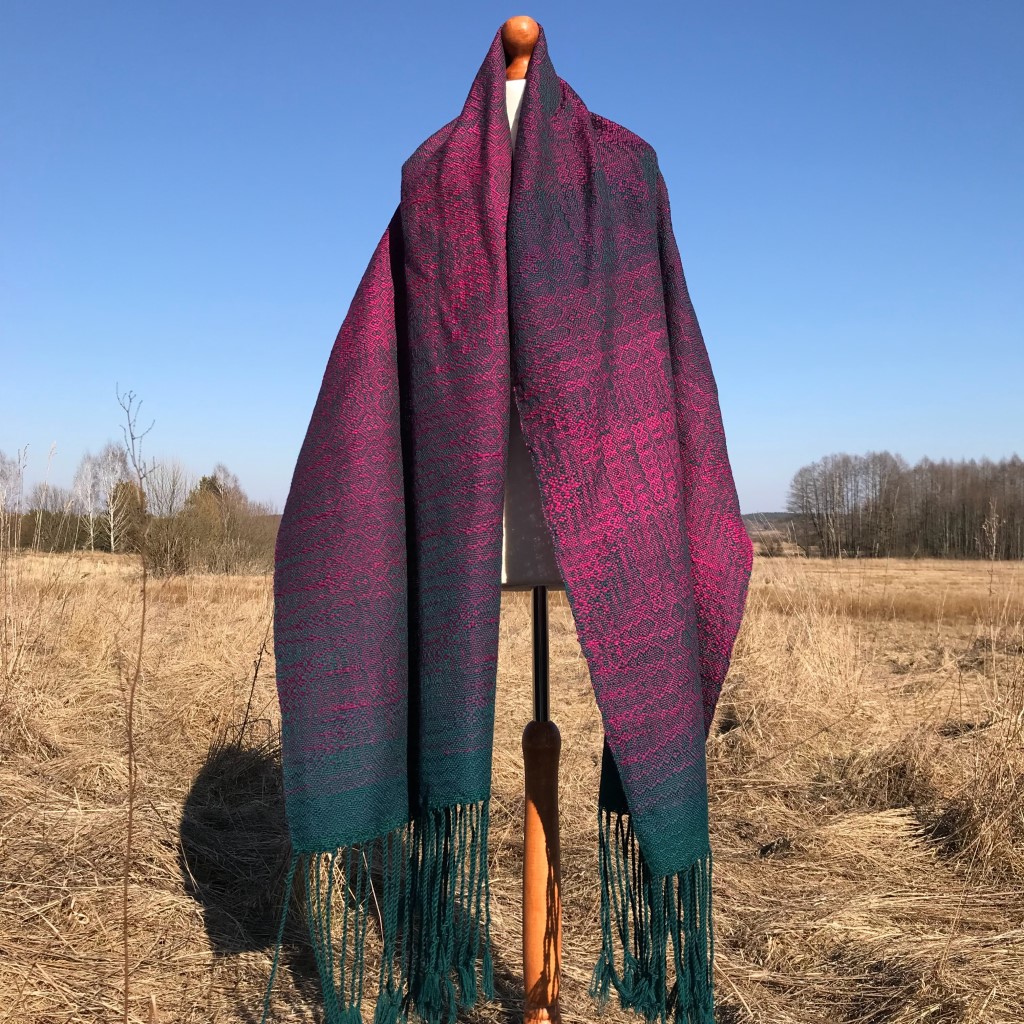Kolory – osnowa zieleń butelkowa, wątek, odcienie fuksji.