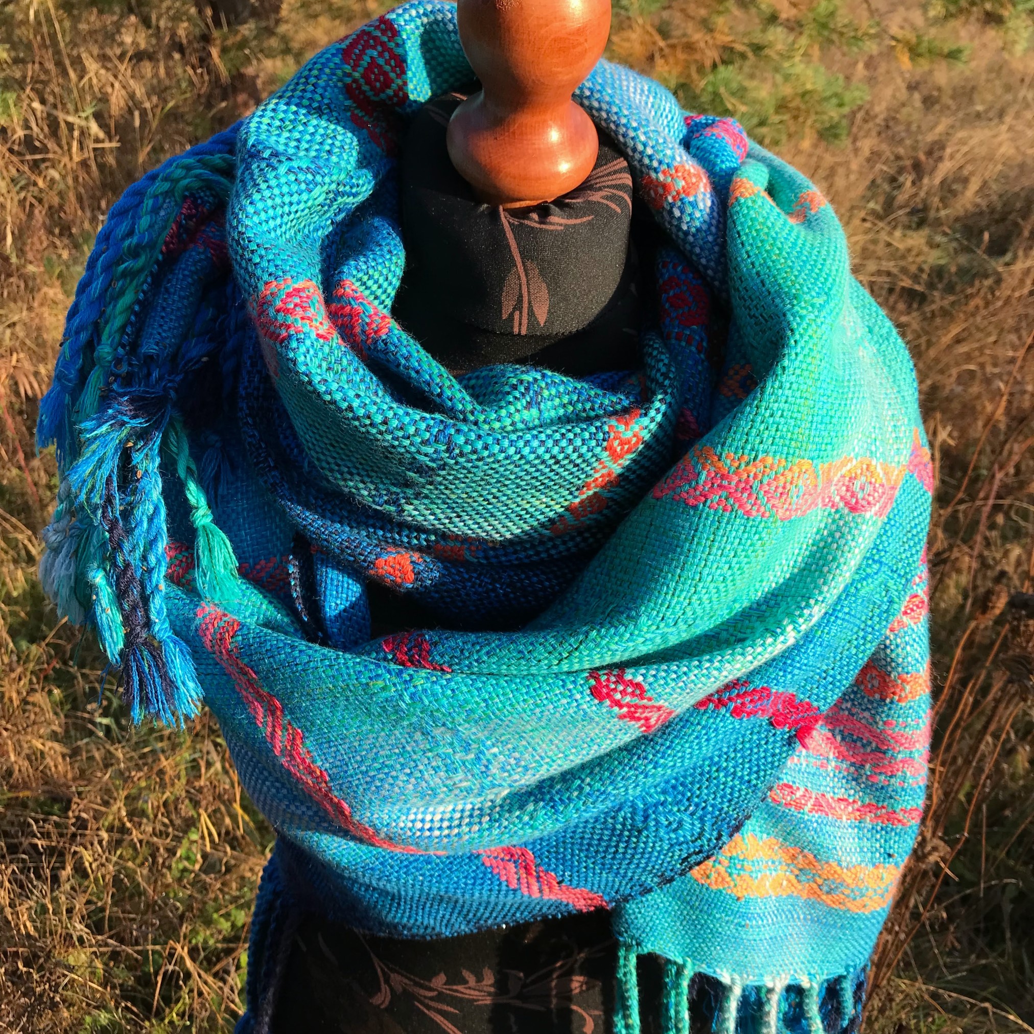Wełna merynos. Kolory – odcienie niebieskiego, turkusu, szmaragdu i czerwono różowo-pomarańczowe wzory inspirowane pereborami nadbużańskimi,