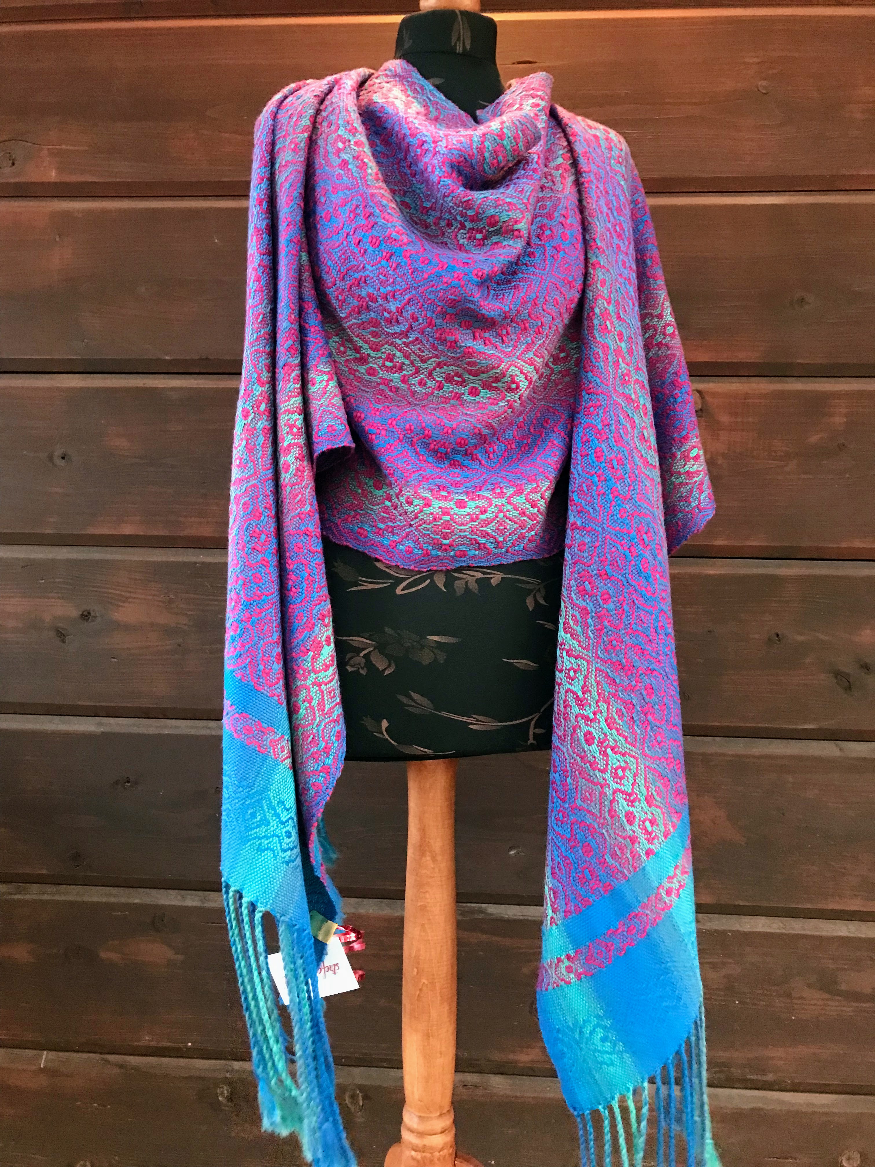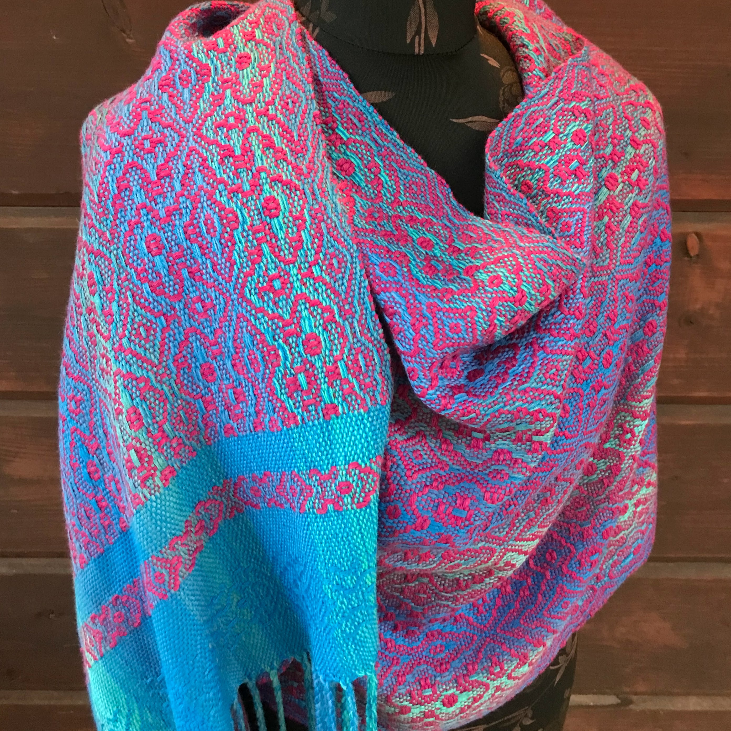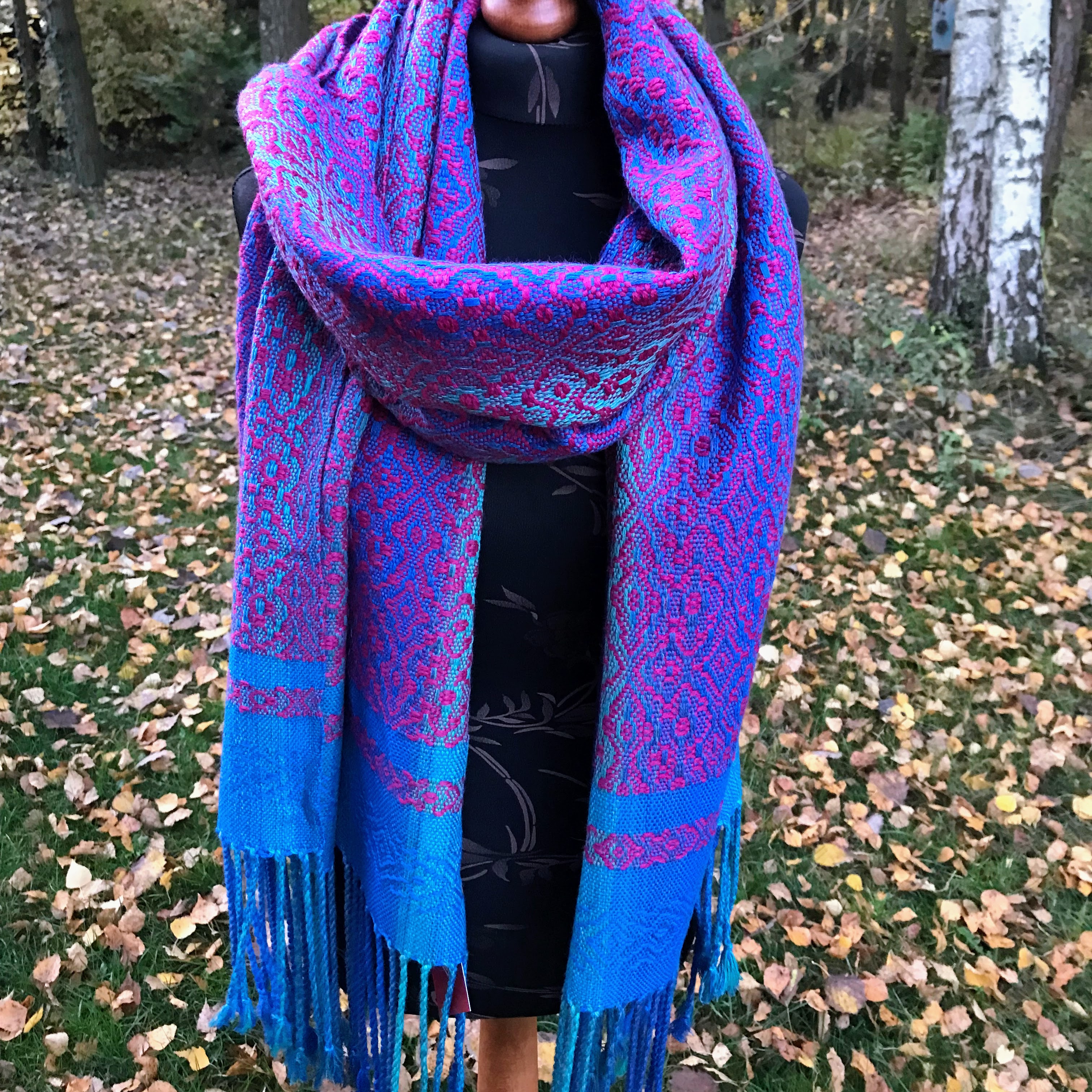 Świat wiruje jak się patrzy na ten szal w kolorach różu i błekitu, które w zależności od oświetlenia wyglądają tak odmiennie. Wzór jak z epoki rococo. Wełna merynos, wymiary 50cm x 260cm.