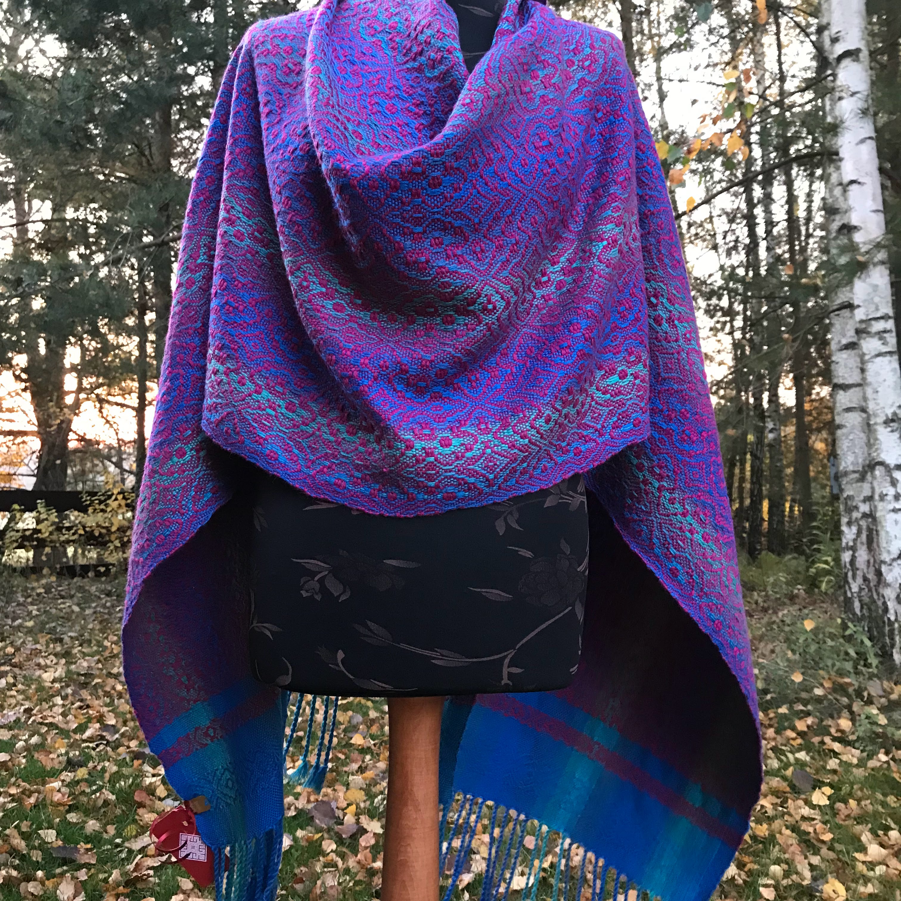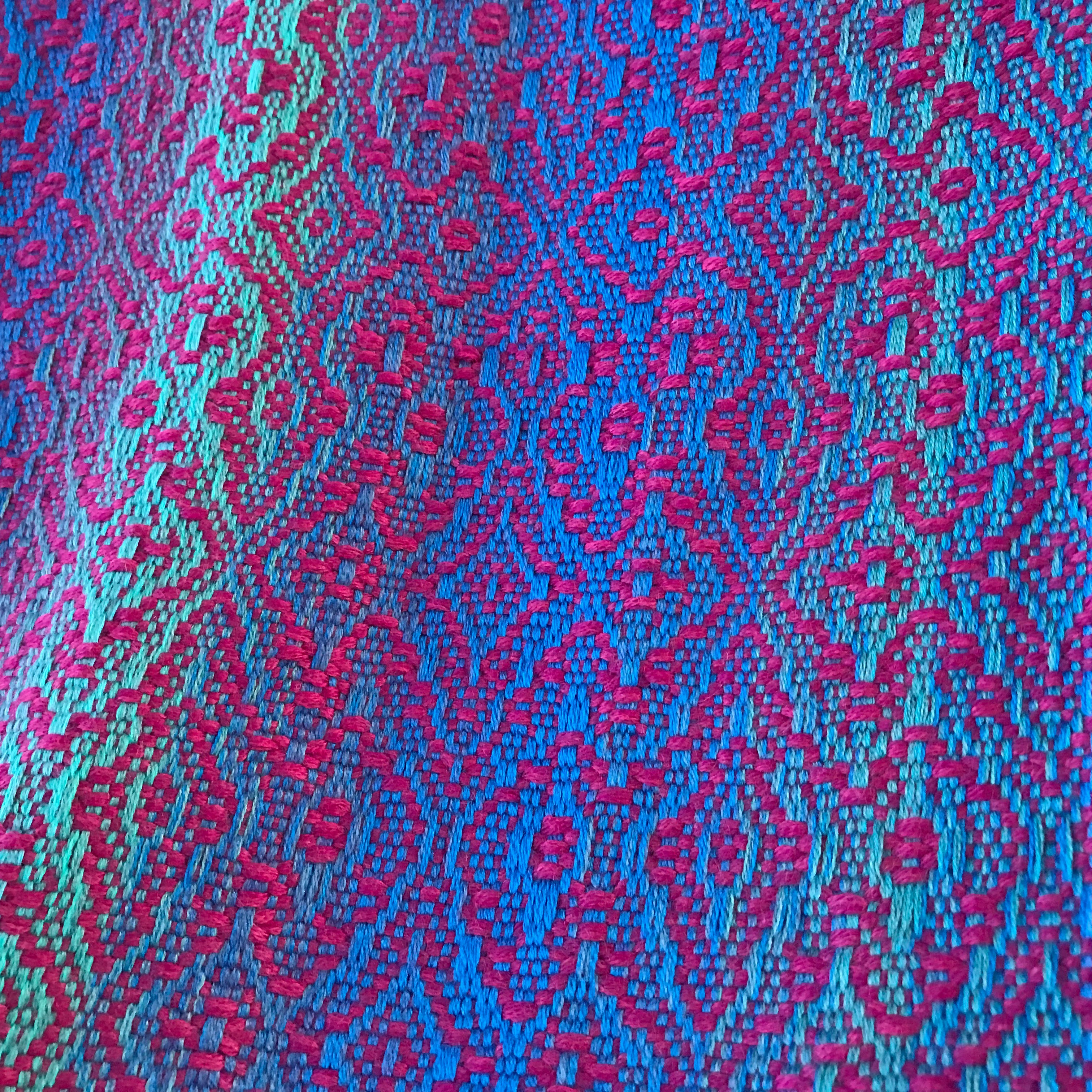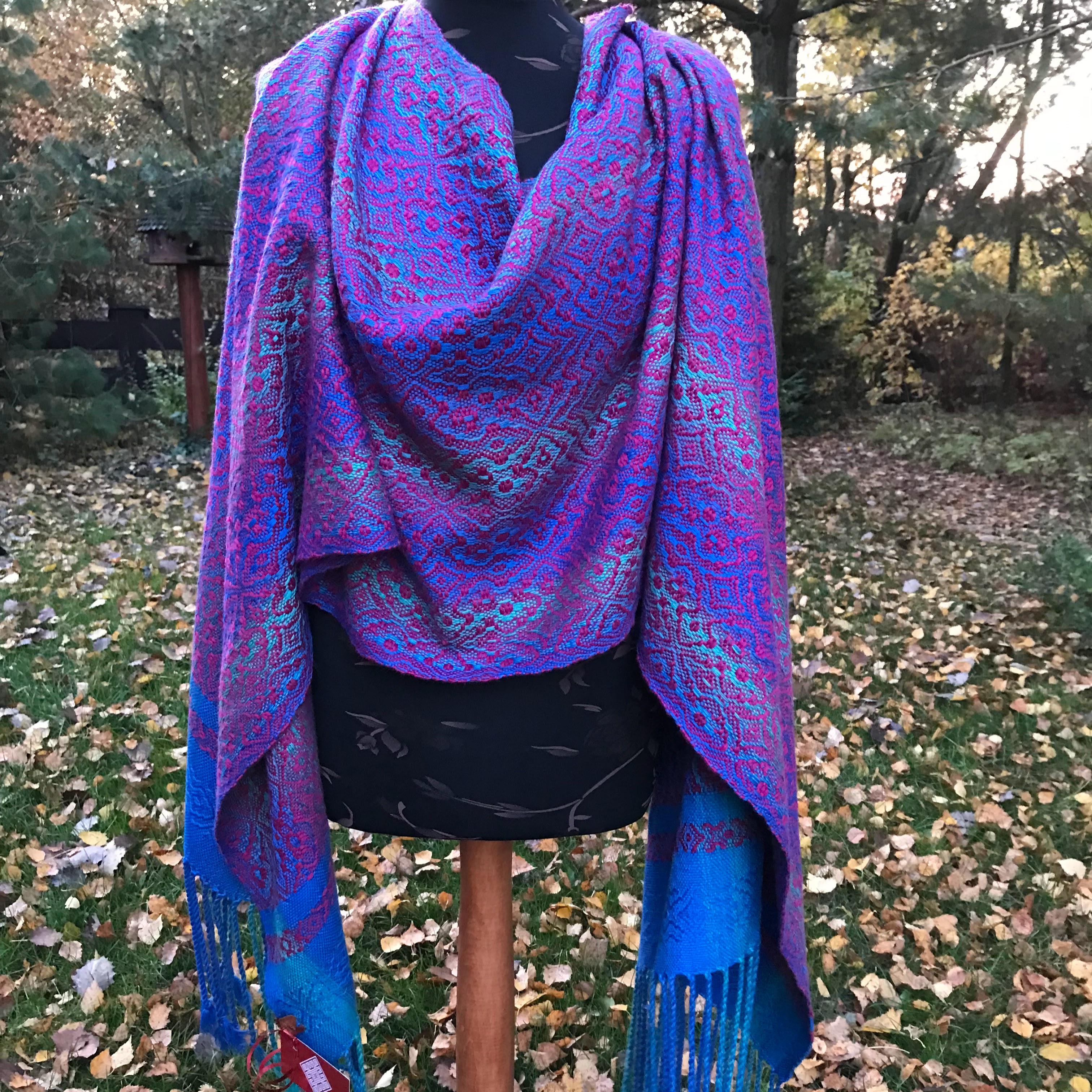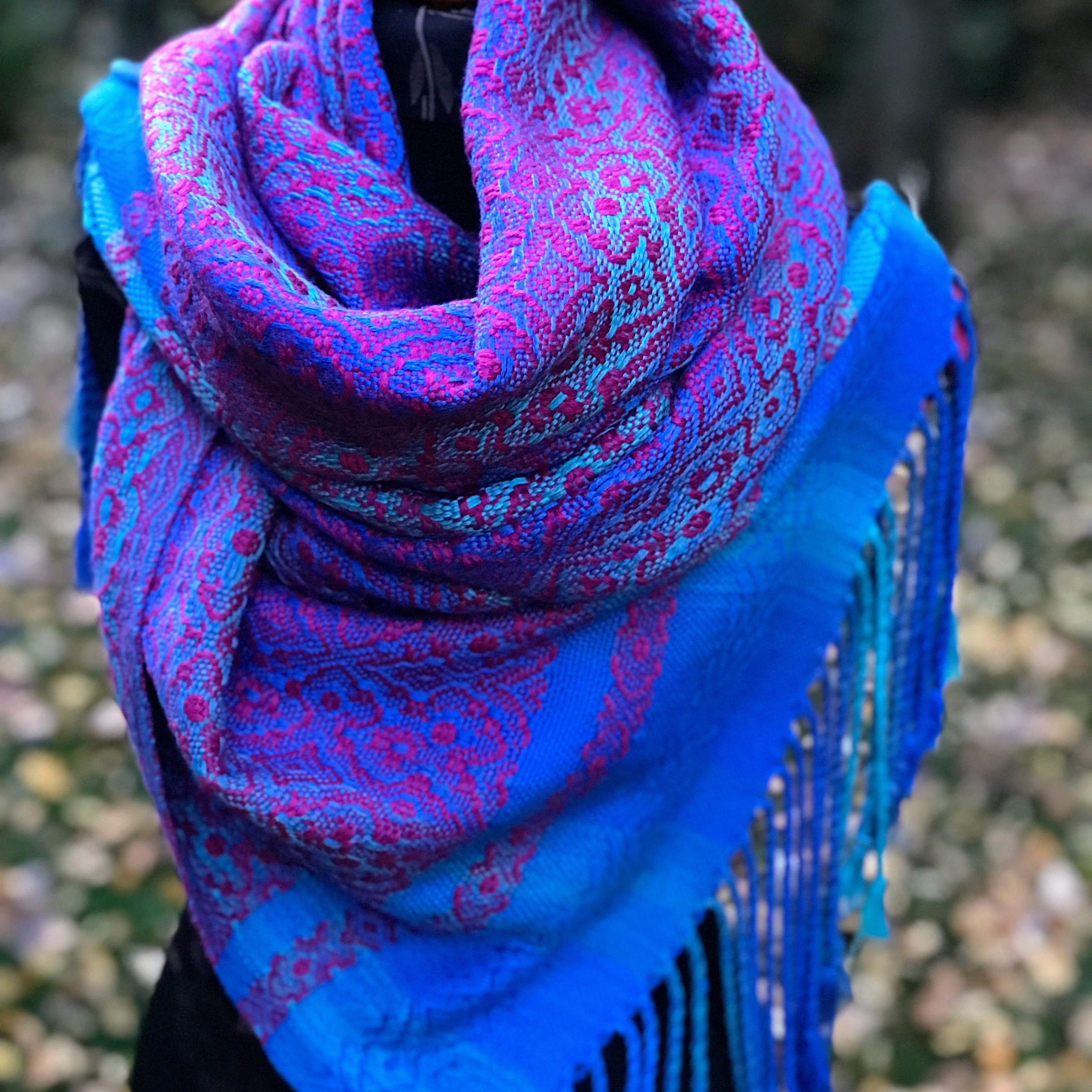 Świat wiruje jak się patrzy na ten szal w kolorach różu i błekitu, które w zależności od oświetlenia wyglądają tak odmiennie. Wzór jak z epoki rococo. Wełna merynos, wymiary 50cm x 260cm.