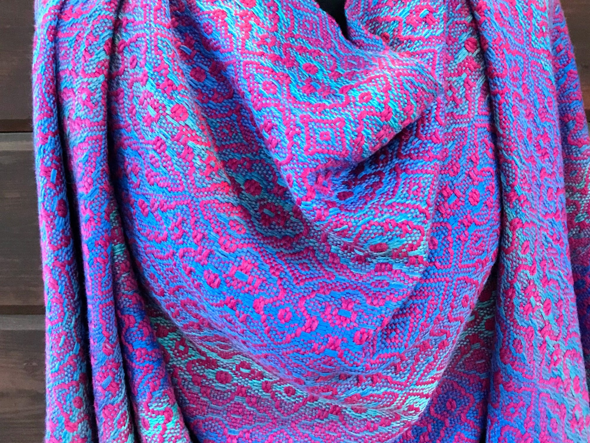 Świat wiruje jak się patrzy na ten szal w kolorach różu i błekitu, które w zależności od oświetlenia wyglądają tak odmiennie. Wzór jak z epoki rococo. Wełna merynos, wymiary 50cm x 260cm.
