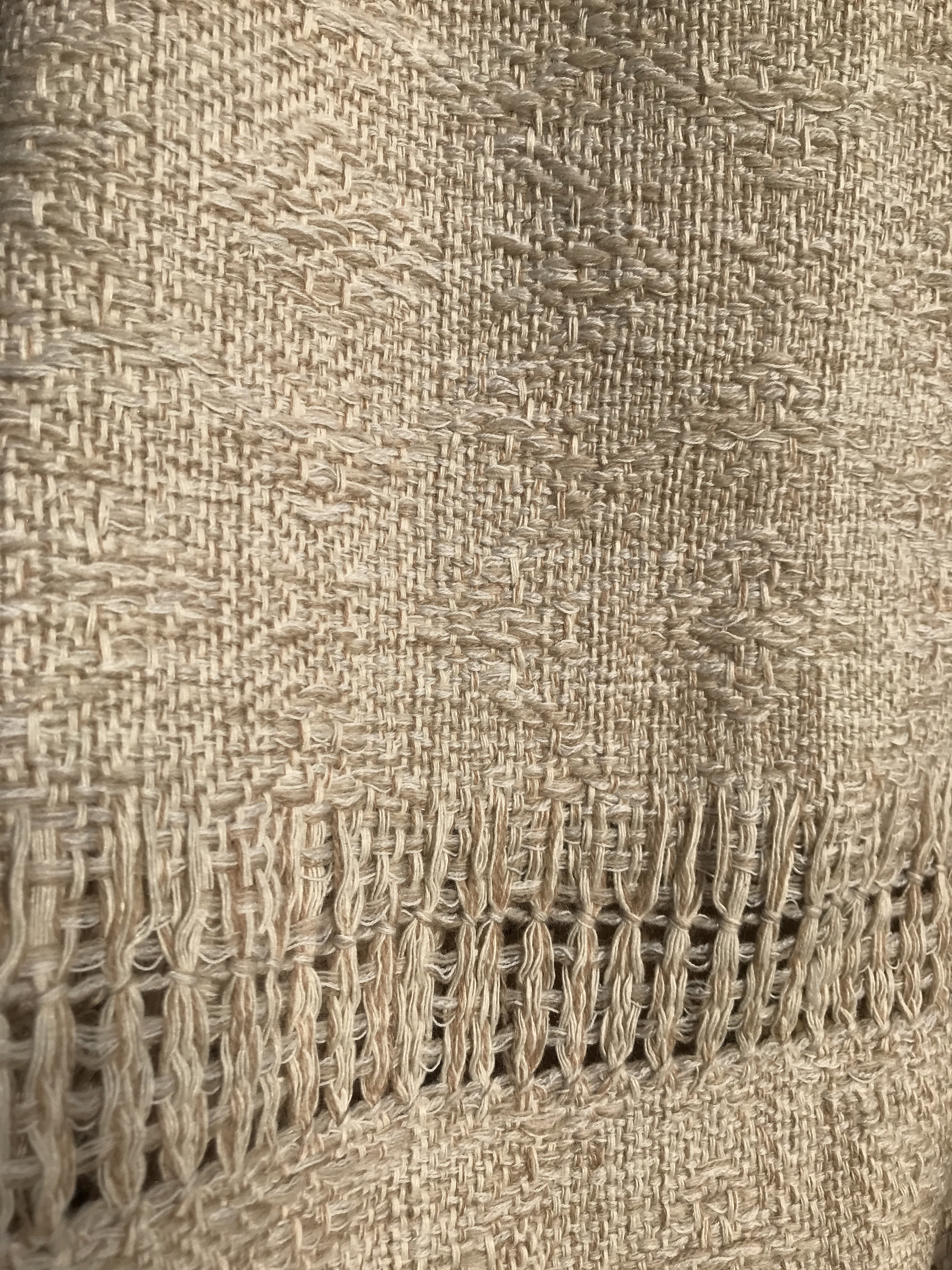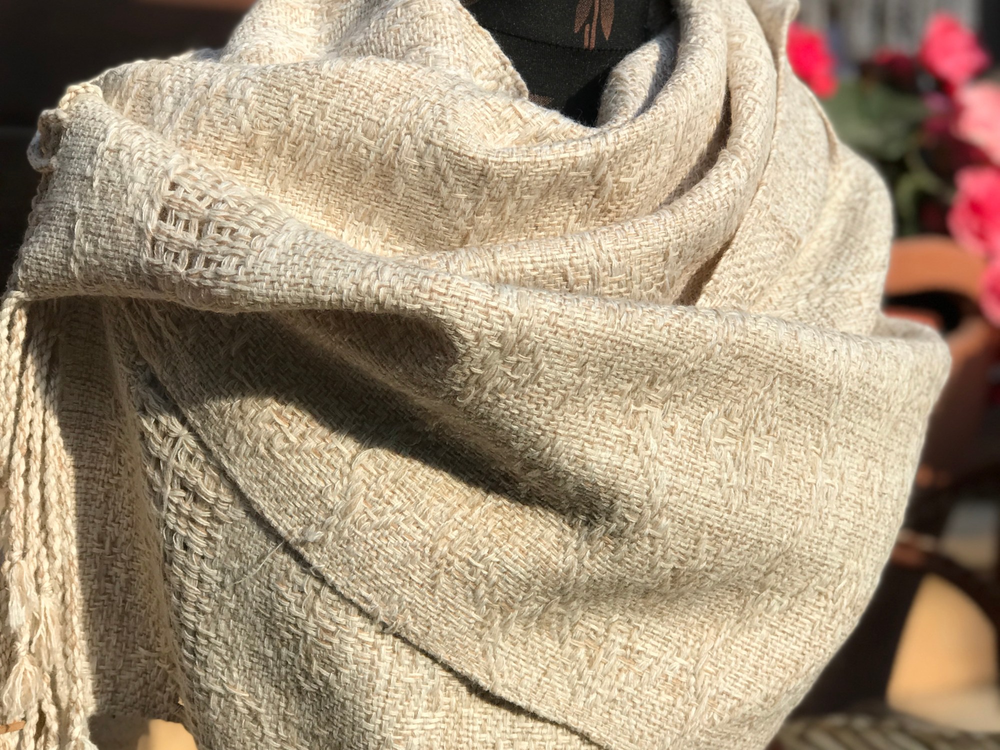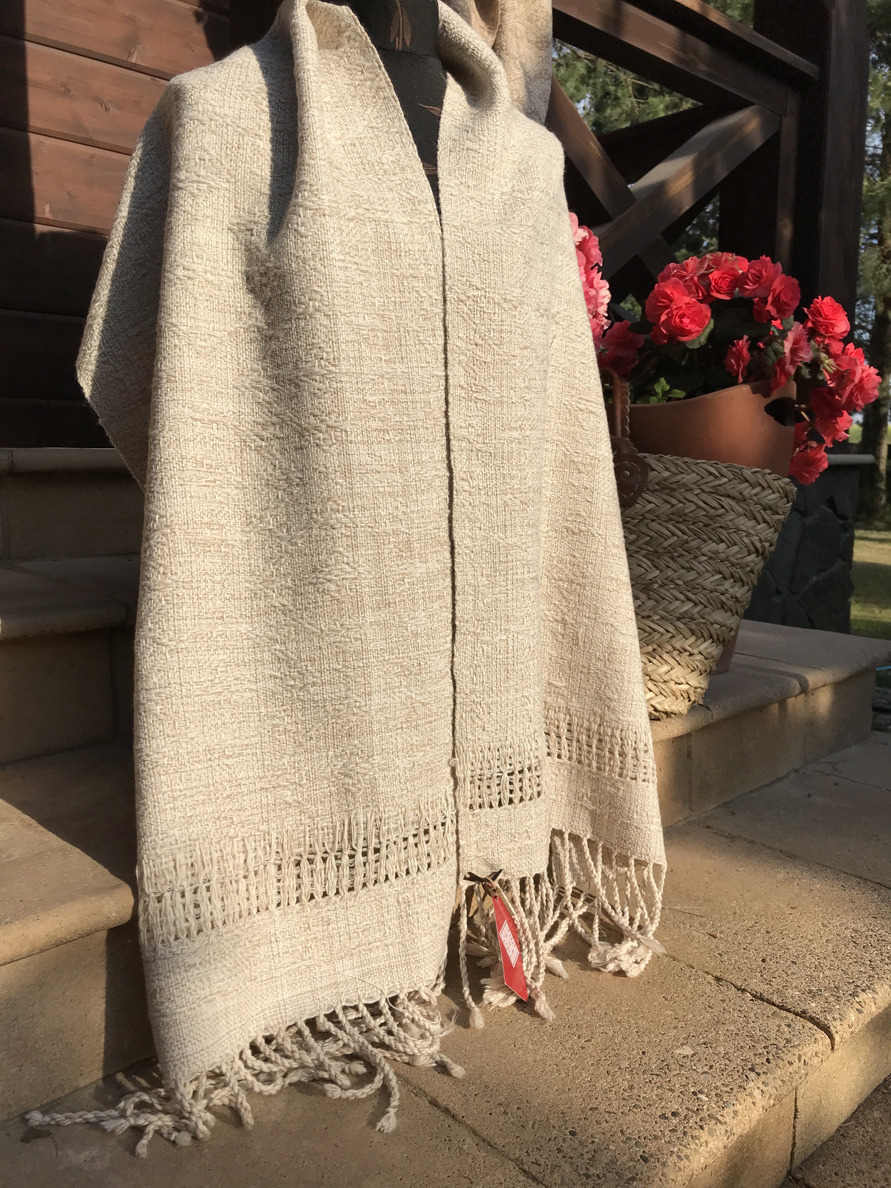 Ręcznie tkany szal w kolorach beżu i kremu. WYtałam go z wełny merynos na bawełnie z jedwabiem. Wykończony mereźką.