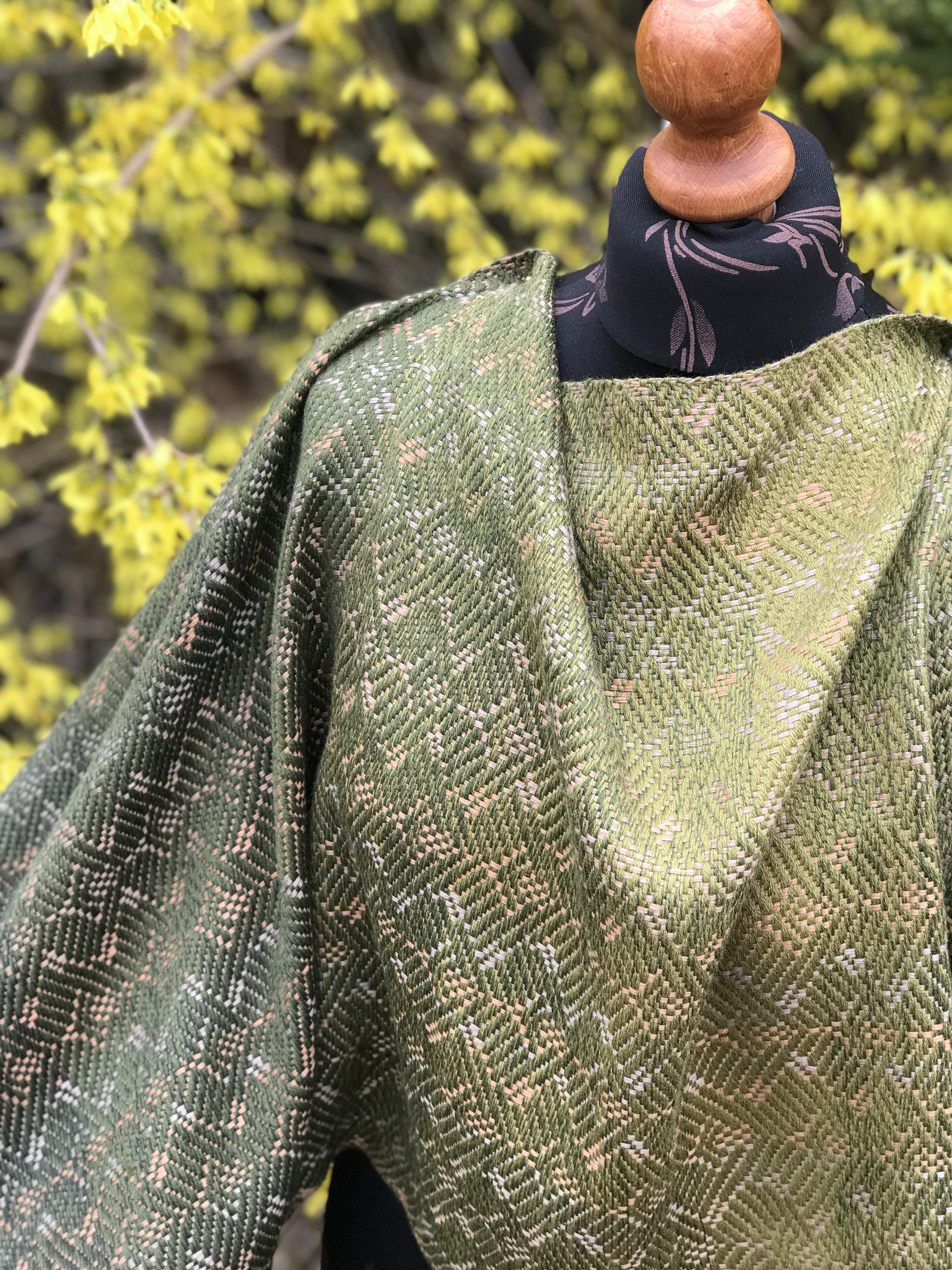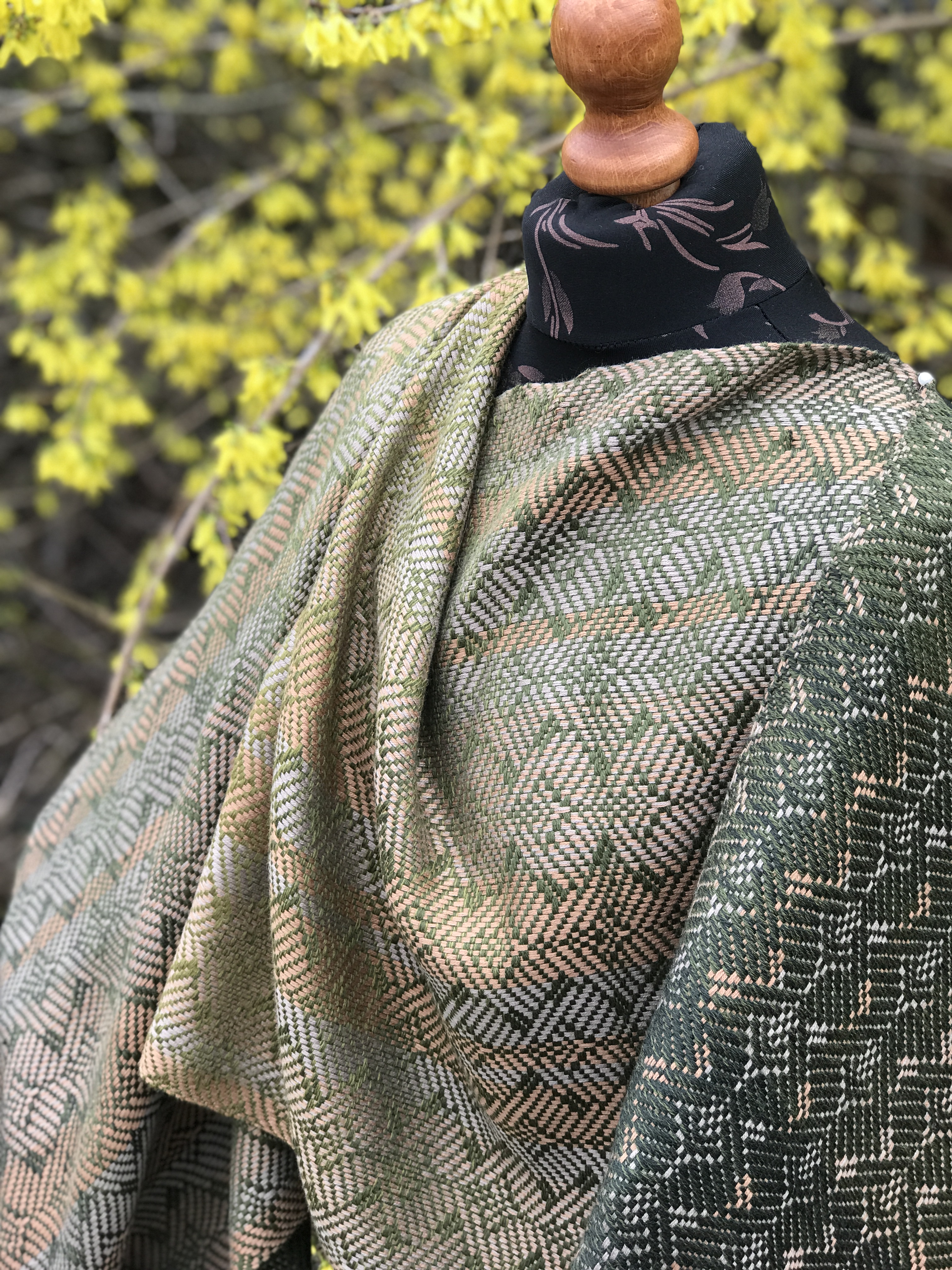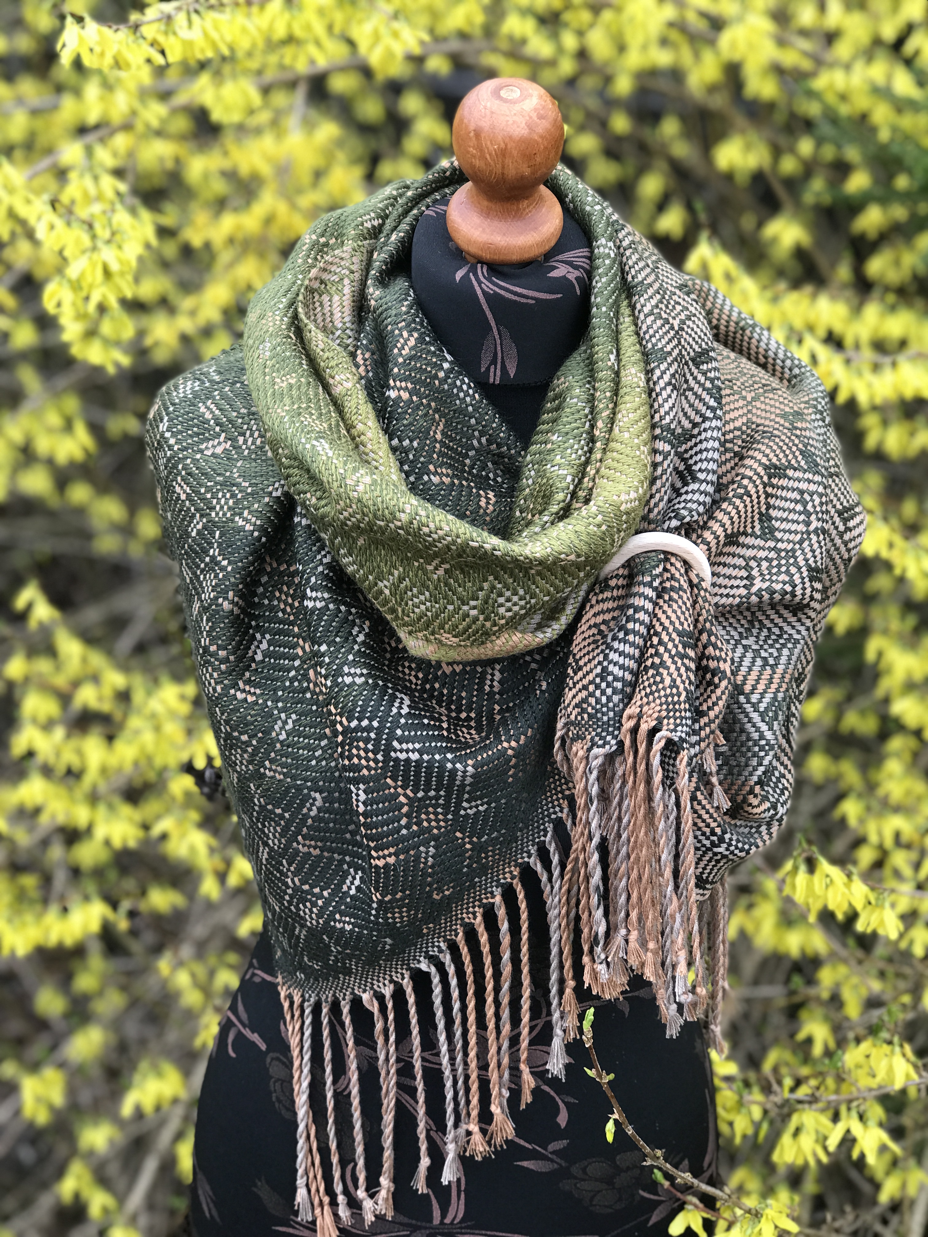 Pinus pinea – osnowa baewłna w odcieniach złotego beżu i chłodnego beżu, wątek wełna merynos w zielonym gradiencie.