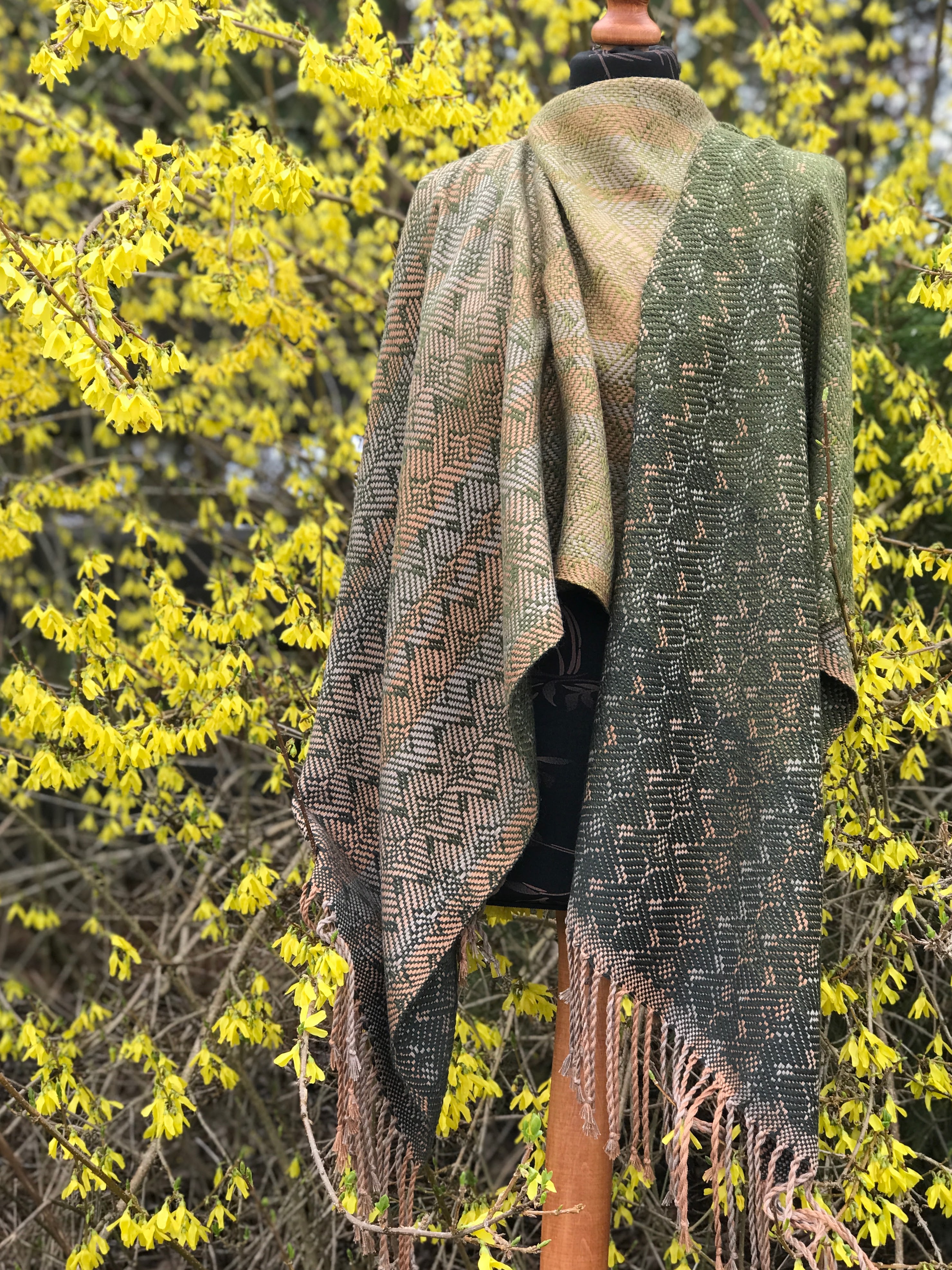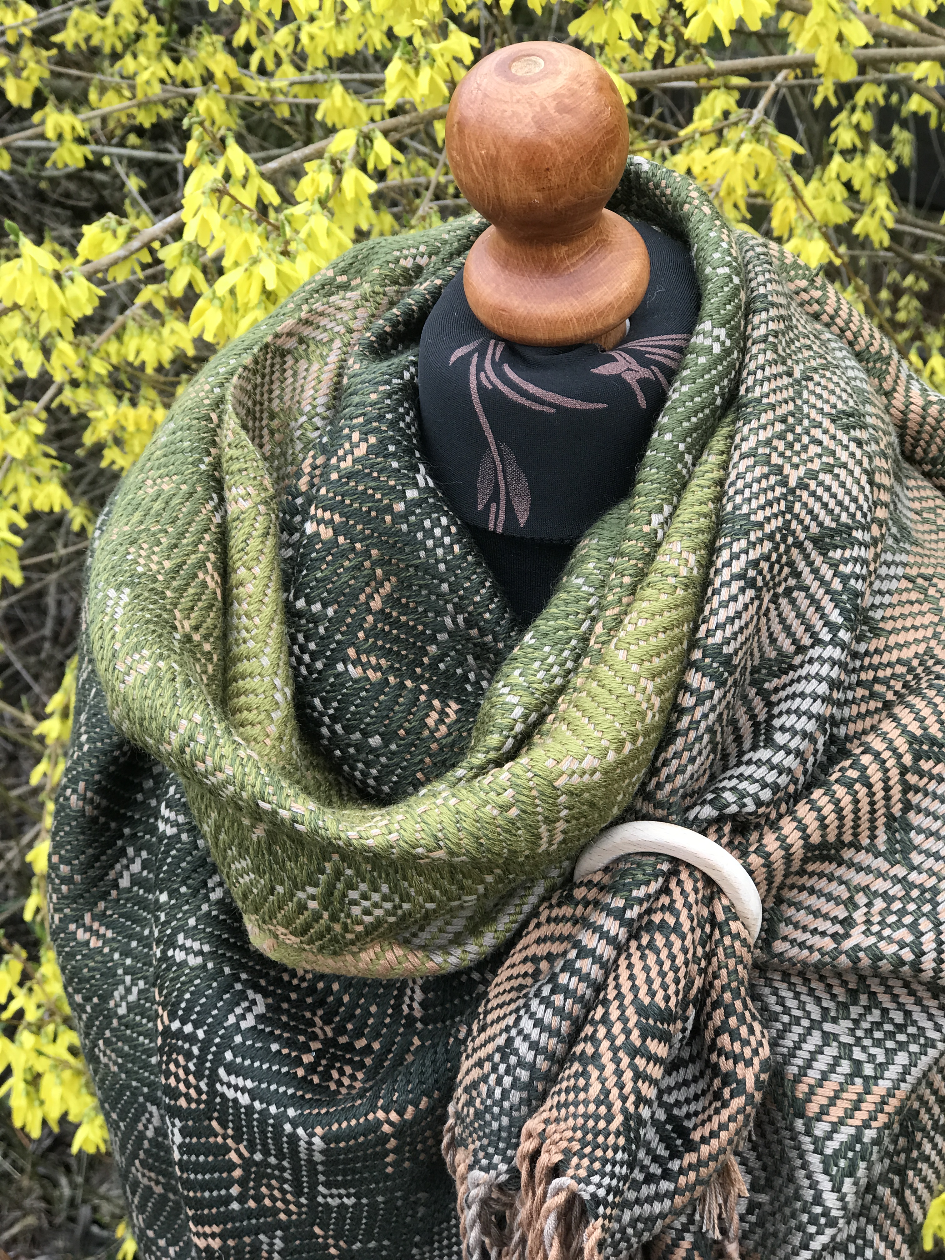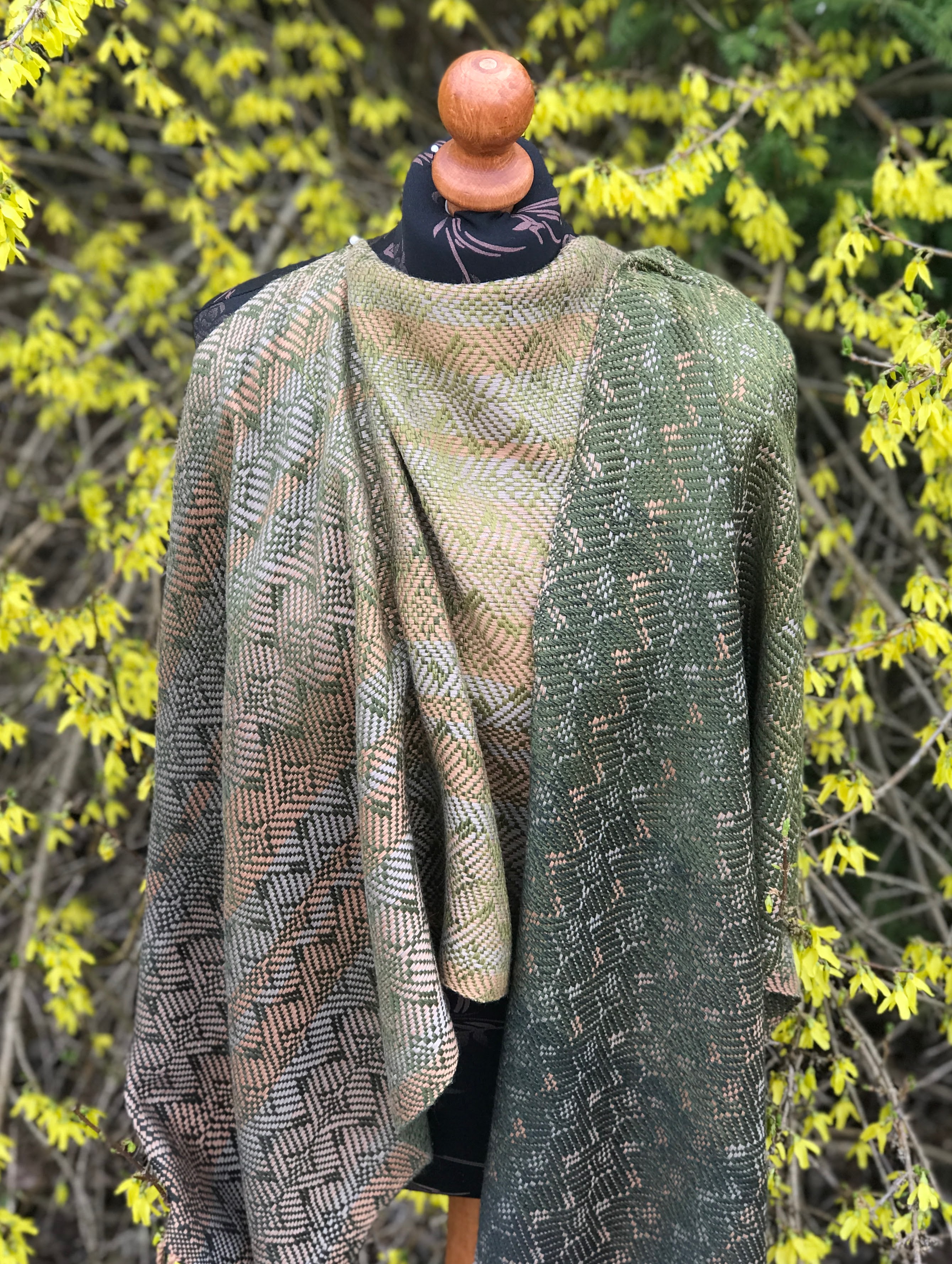Pinus pinea – osnowa baewłna w odcieniach złotego beżu i chłodnego beżu, wątek wełna merynos w zielonym gradiencie.