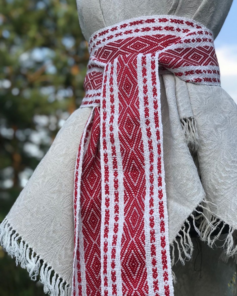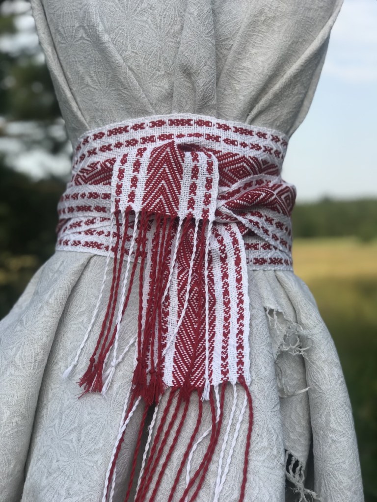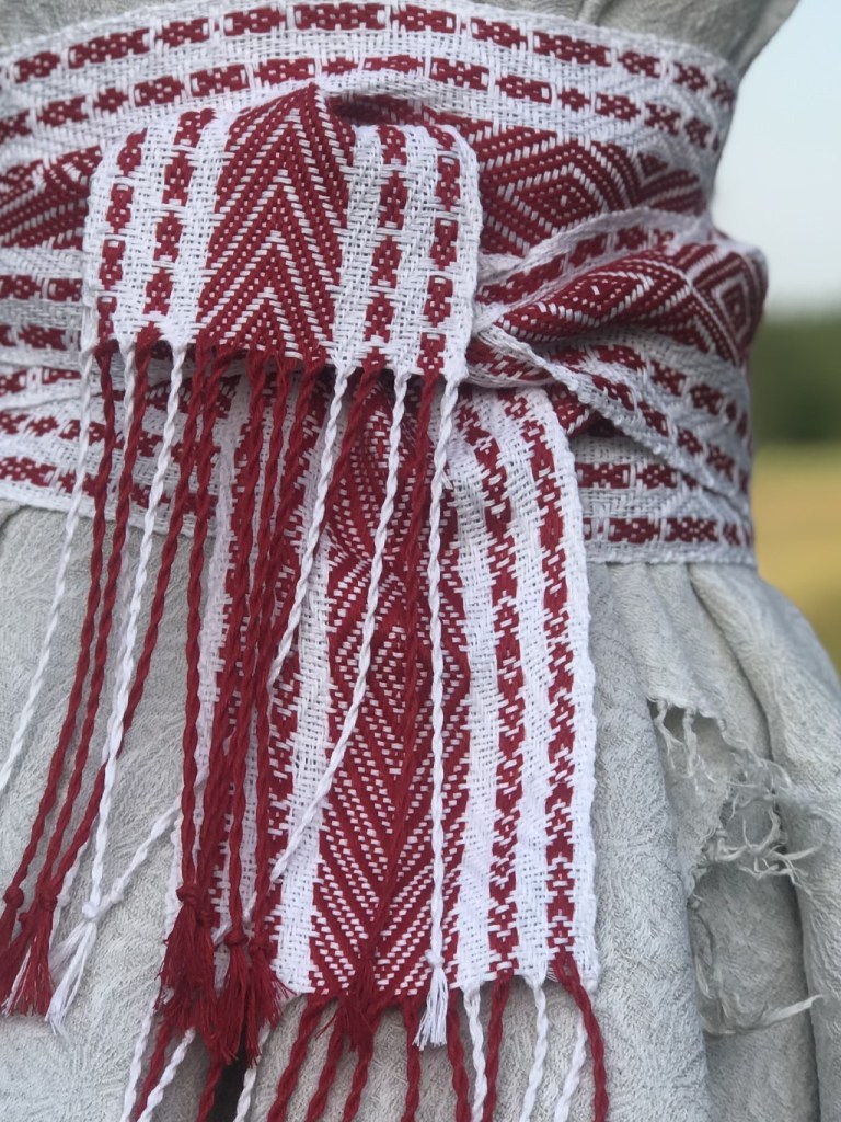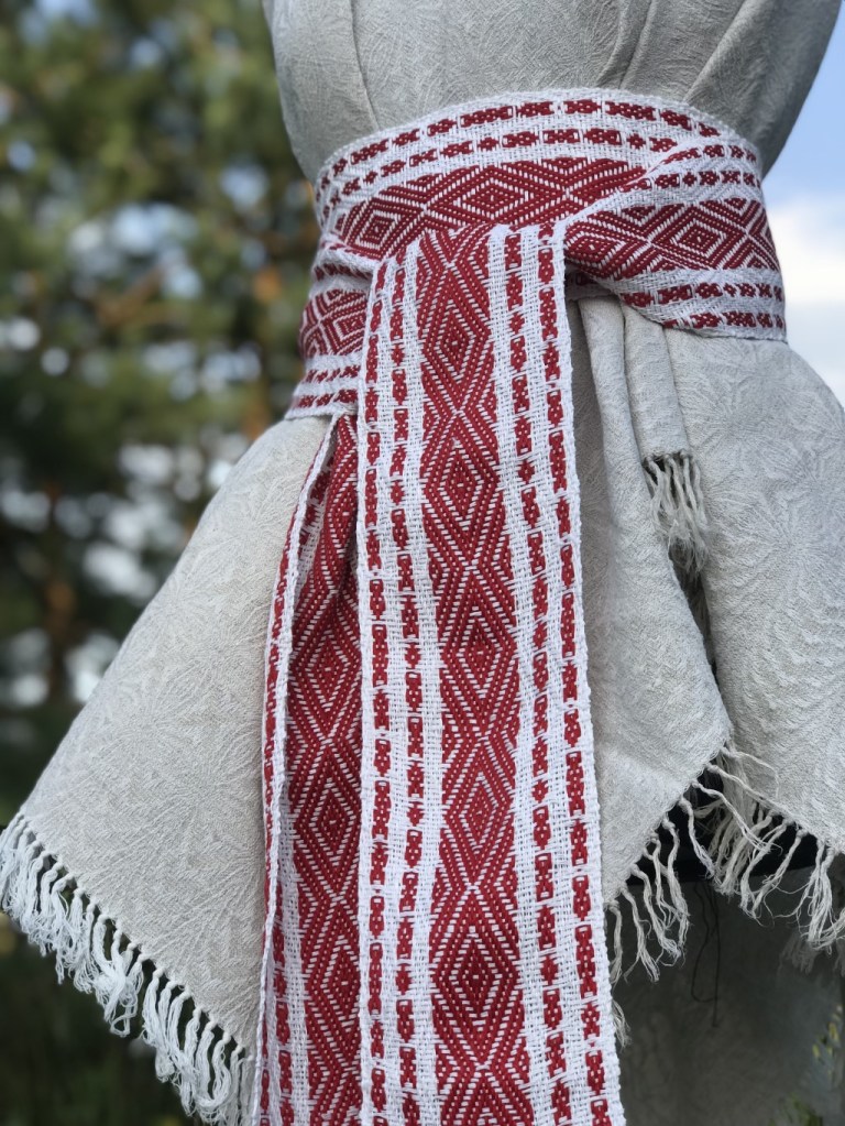 Oto dwie krajki lniane o szerokości 12 cm i długości 300cm. Wytkane ręczne na krośnie. Materiał len w kolorach biel i czerwień.