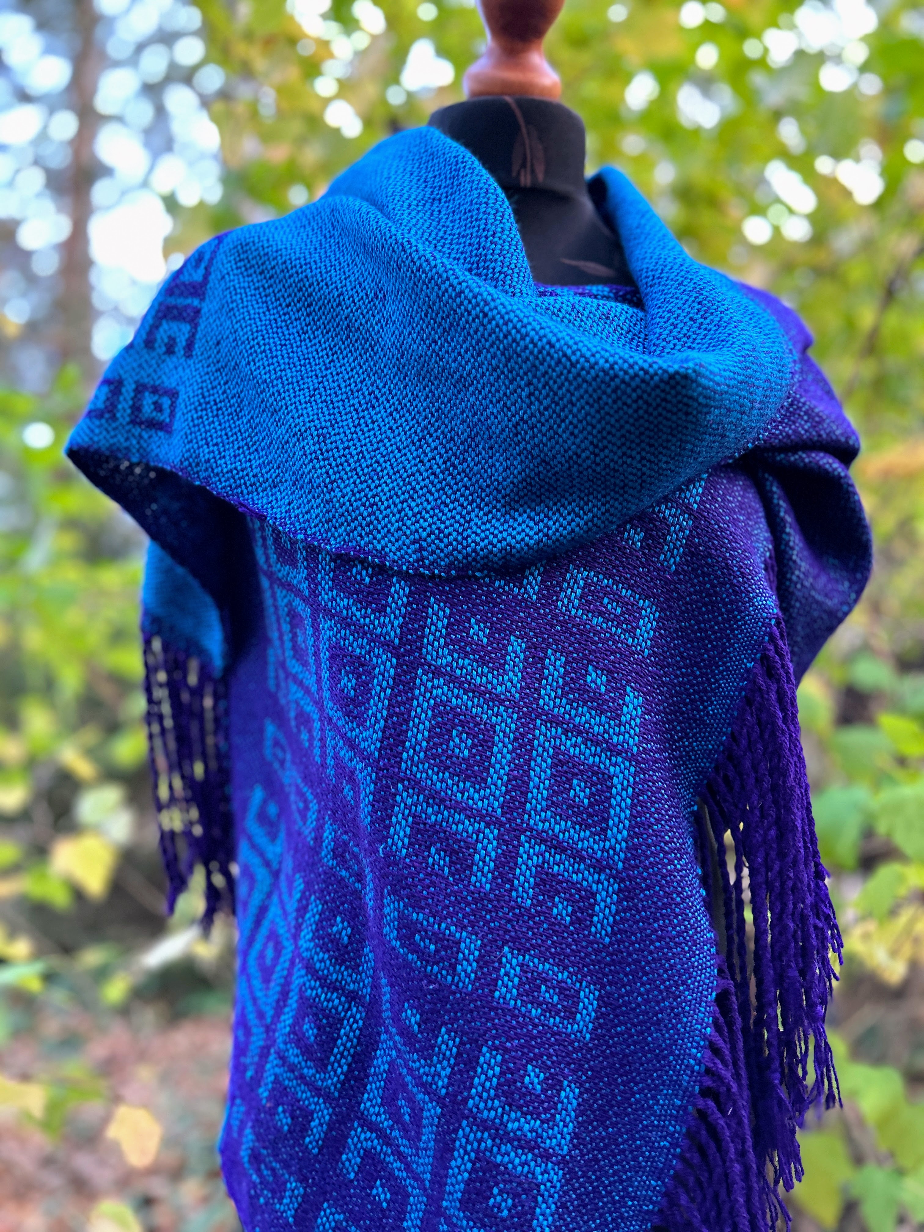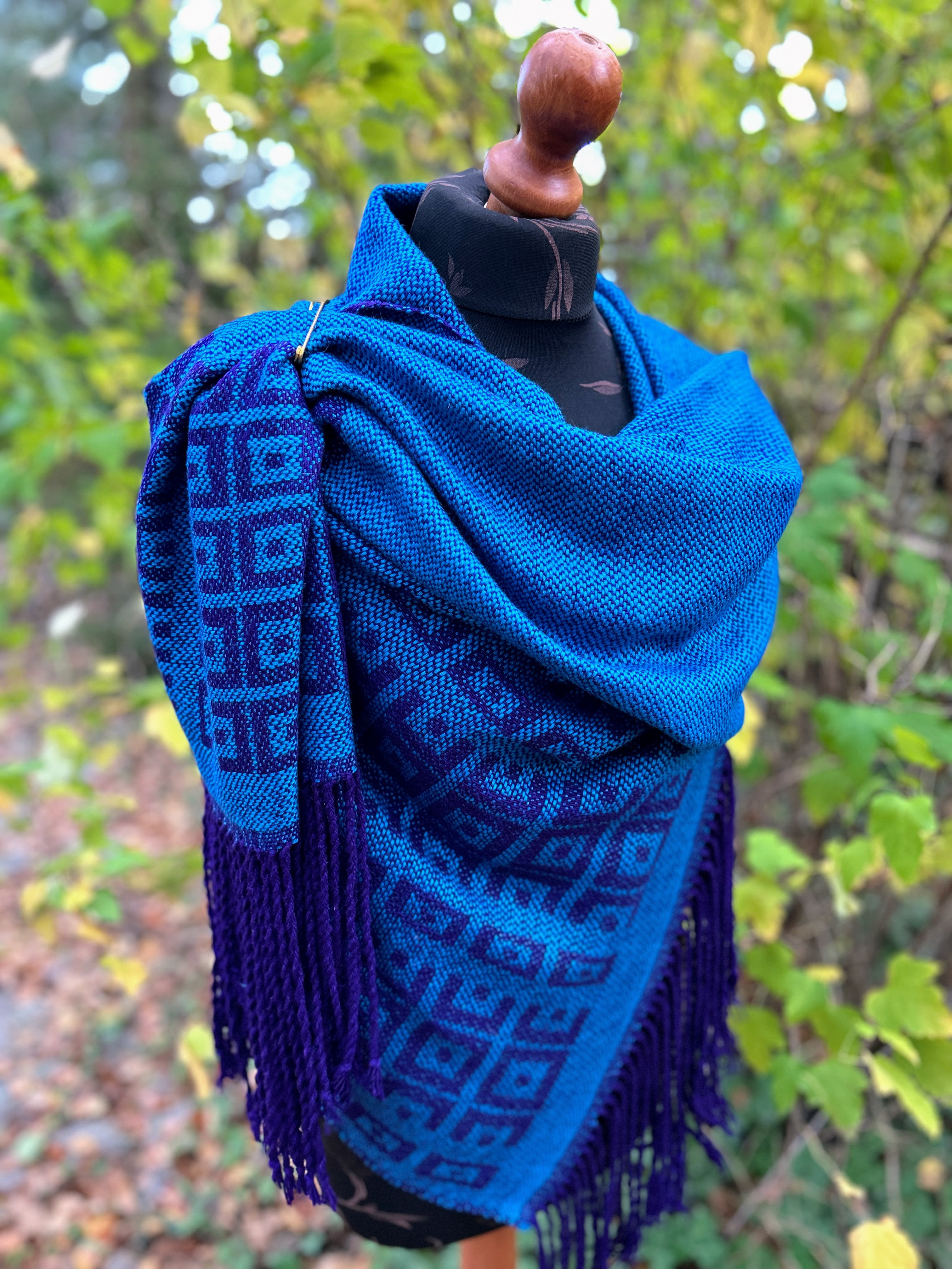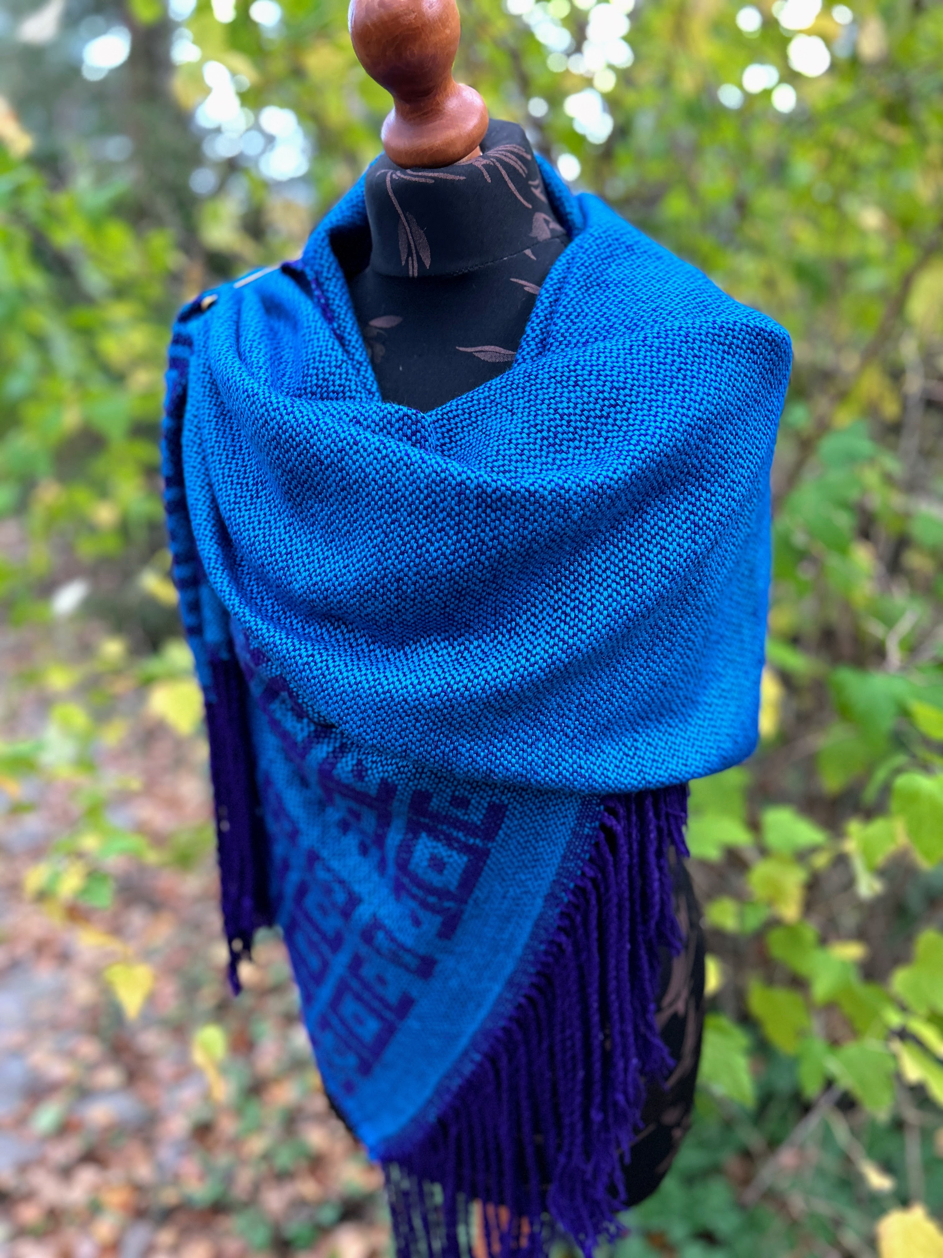 Cenki i zwiewny szal z wełny owczej i wełny merynos. Z jednej strony kobaltowy, z drugiej strony fioletowy. Ozdobiony geometrycznymii wzorami na brzegach. Cały tkany wzorem adamaszkowym.