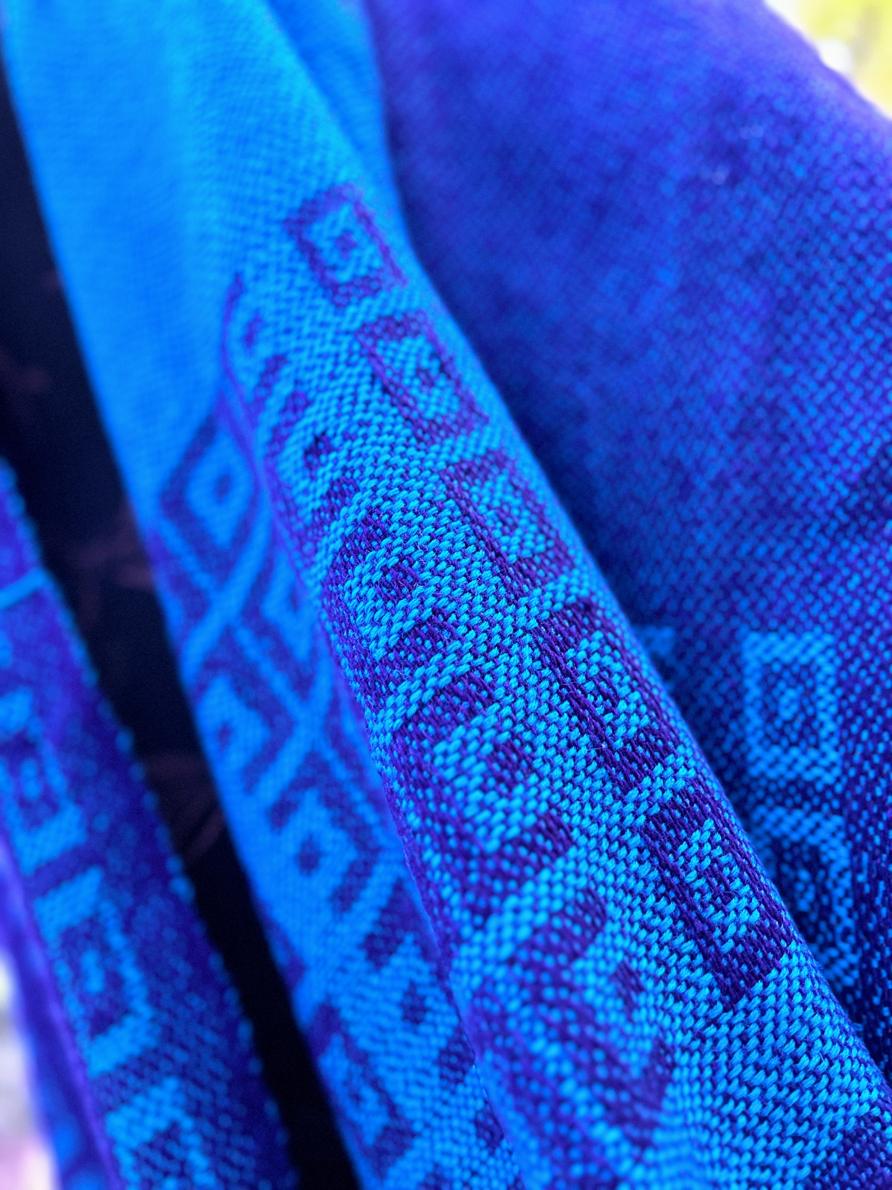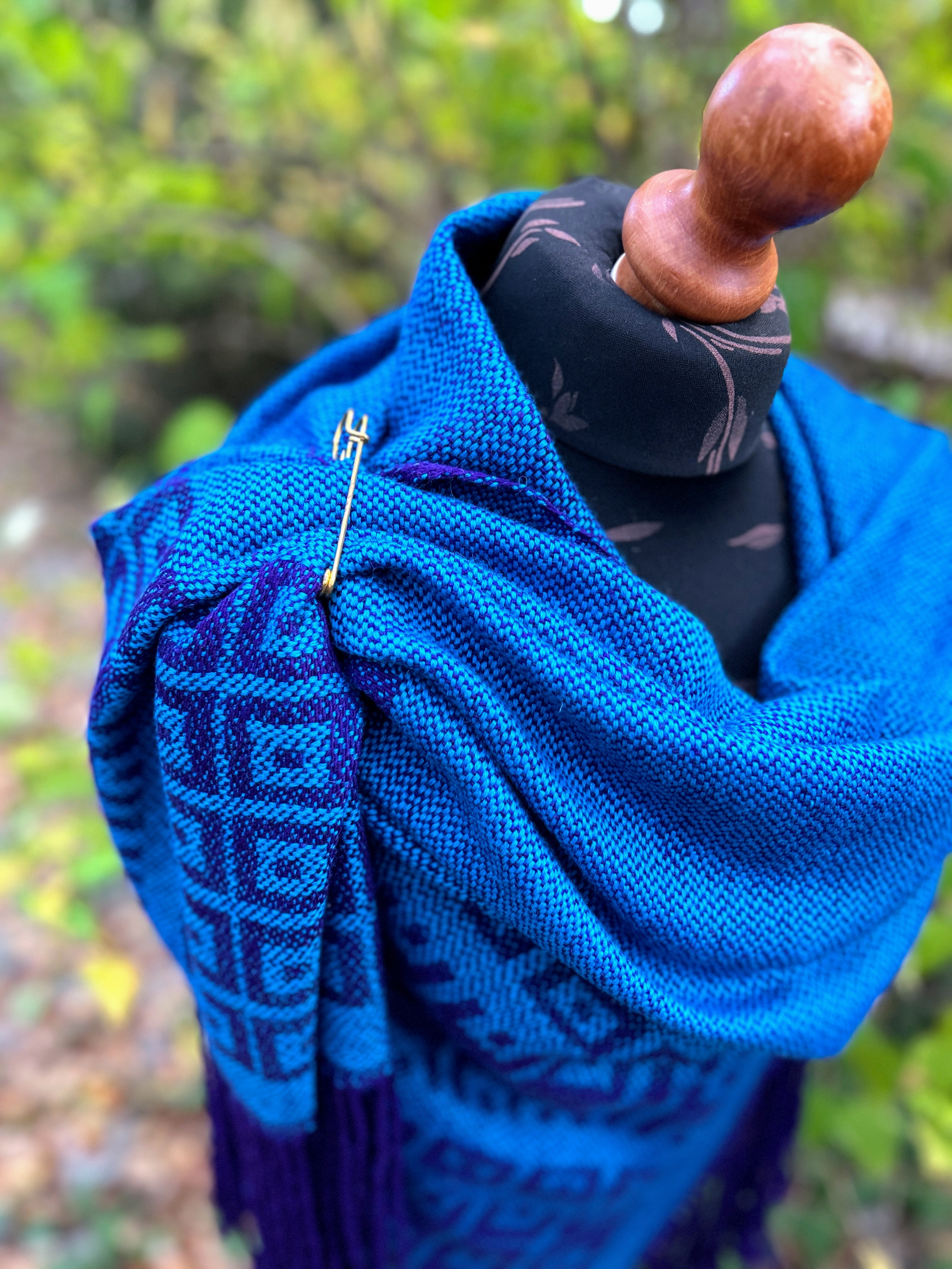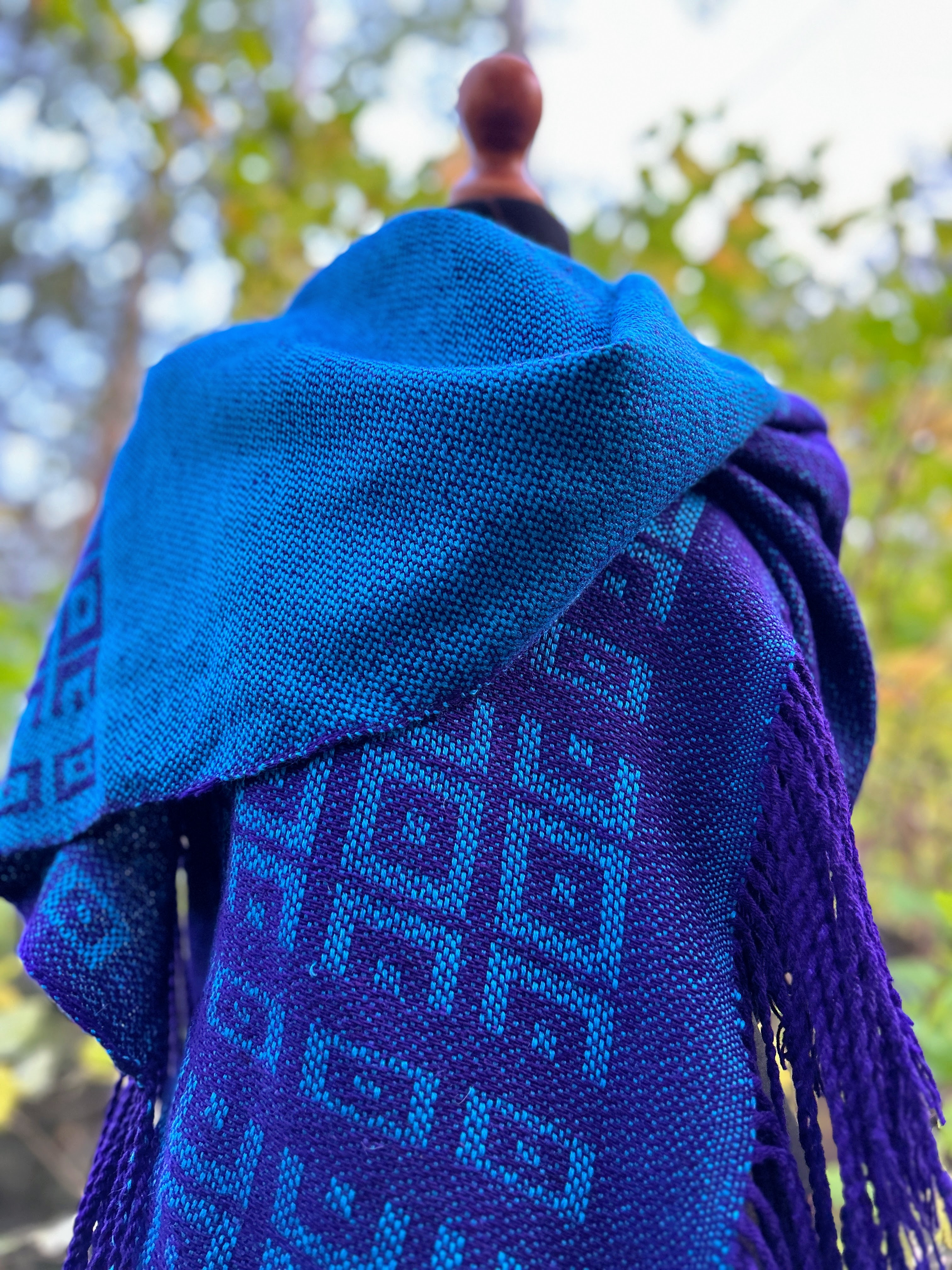 Cenki i zwiewny szal z wełny owczej i wełny merynos. Z jednej strony kobaltowy, z drugiej strony fioletowy. Ozdobiony geometrycznymii wzorami na brzegach. Cały tkany wzorem adamaszkowym.