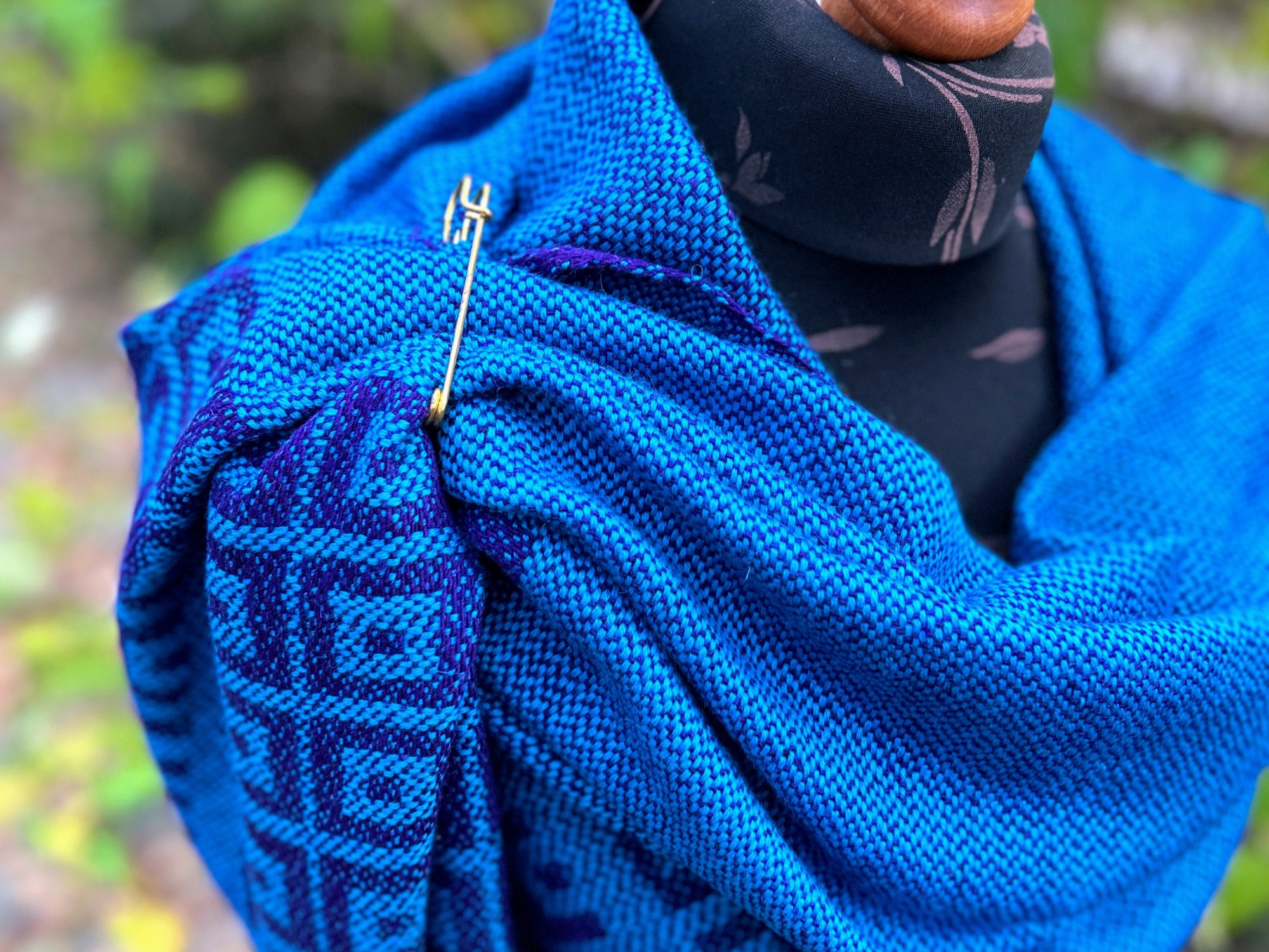 Cenki i zwiewny szal z wełny owczej i wełny merynos. Z jednej strony kobaltowy, z drugiej strony fioletowy. Ozdobiony geometrycznymii wzorami na brzegach. Cały tkany wzorem adamaszkowym.