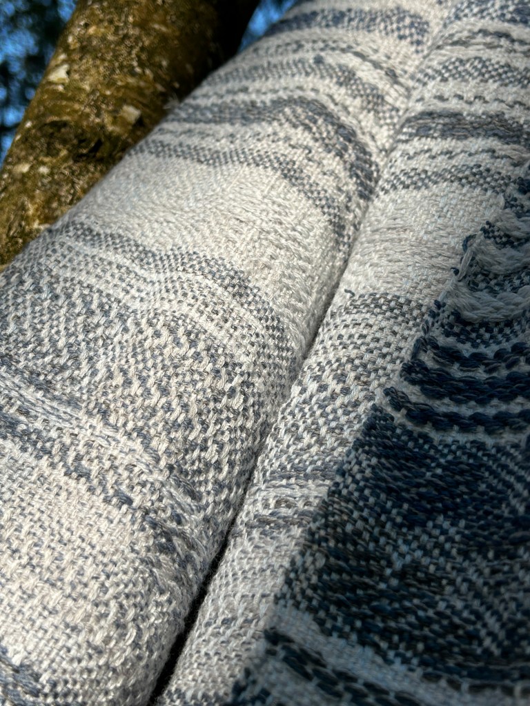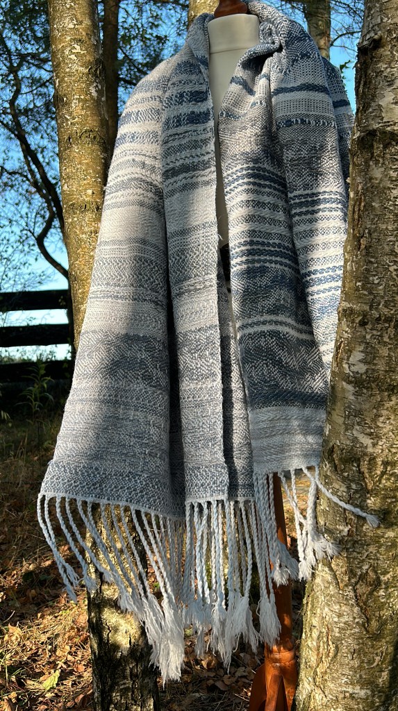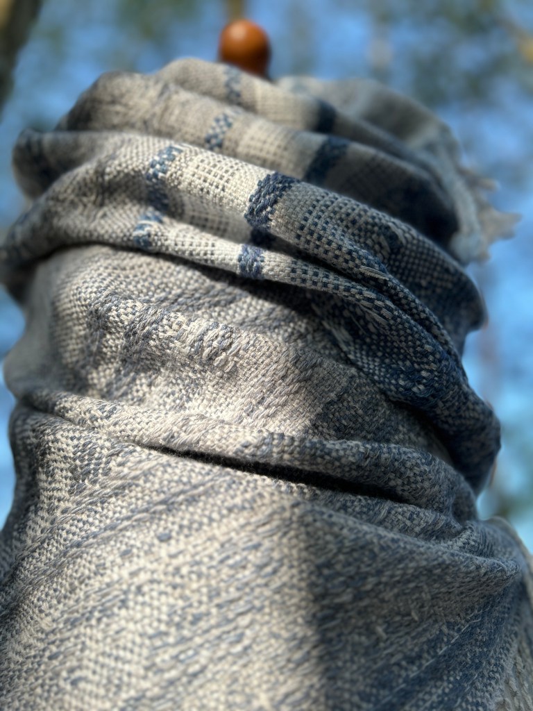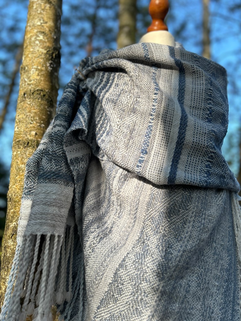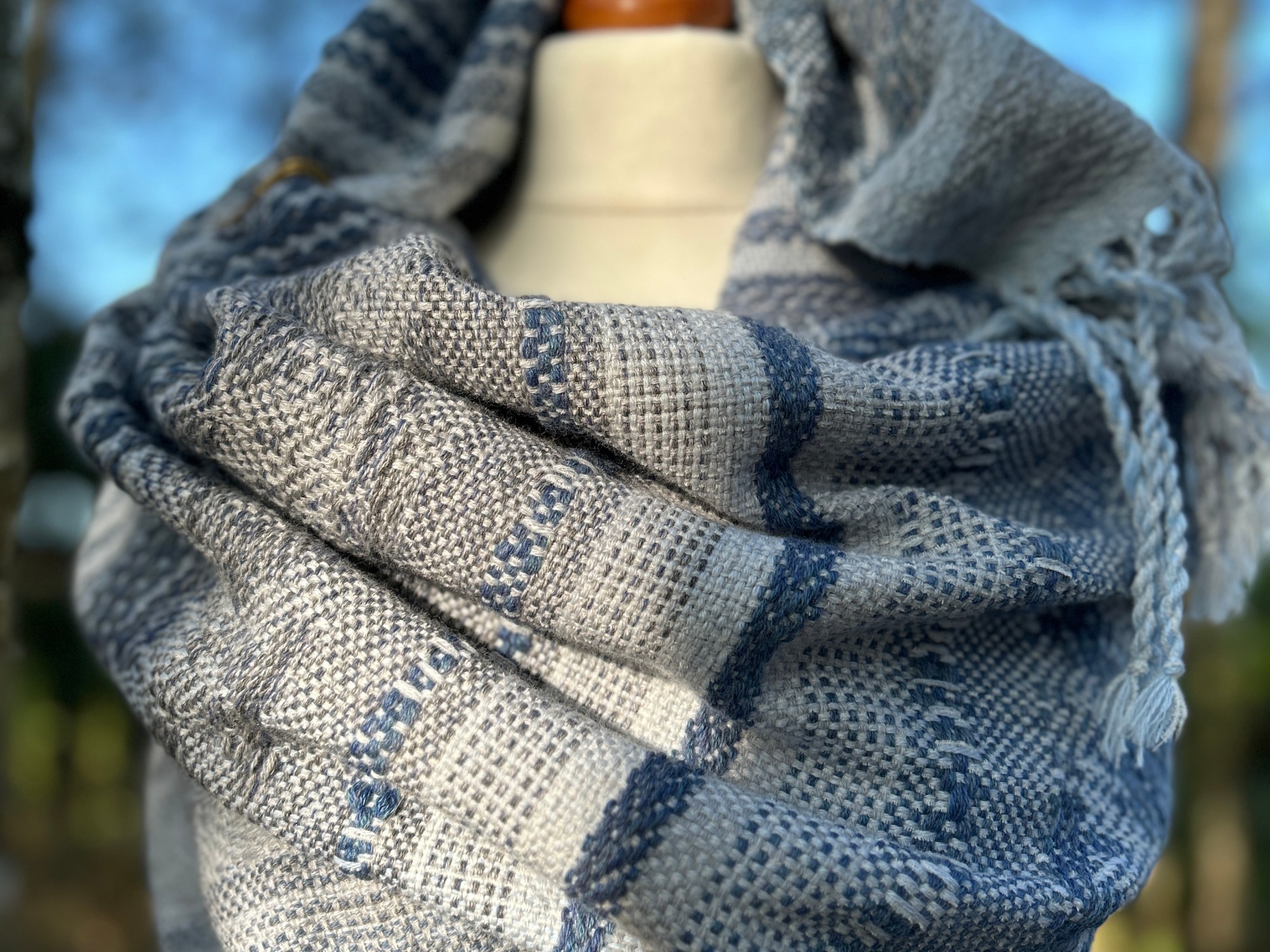 Szal jest wykonany z wyjątkowo miękkiej przędzy – bawełny z delikatnym dodatkiem jedwabiu, co nadaje mu niepowtarzalną gładkość i lekkość. Osnowa została utkana w odcieniach subtelnej bieli, błękitu oraz szarości, które pięknie komponują się ze sobą, tworząc harmonijną całość. Wątek natomiast został użyty w niebieskich odcieniach przypominających odcienie jeansu, co nadaje szalowi modnego i stylowego charakteru. Ten unikatowy dodatek do Twojej garderoby będzie nie tylko przyjemny w dotyku, ale także wspaniale uzupełni wiele różnych stylizacji, dodając im wyjątkowego uroku i ponadczasowego eleganckiego akcentu.
