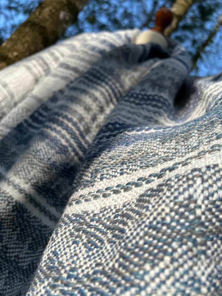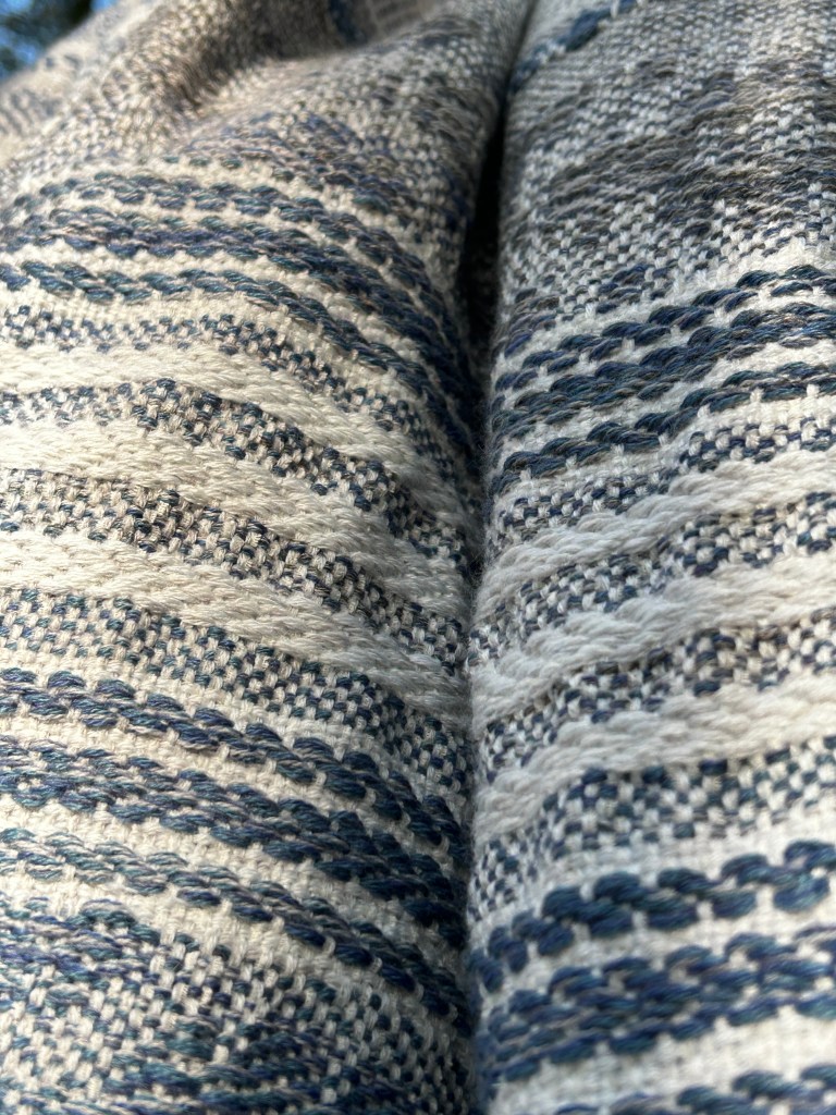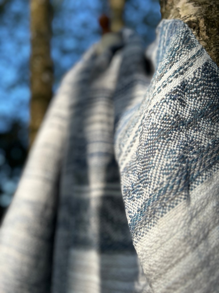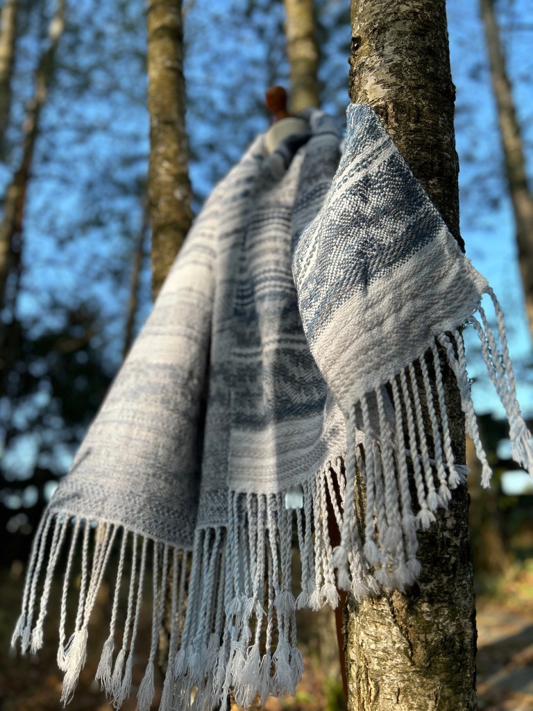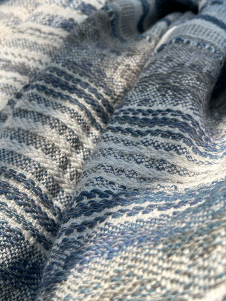 Szal jest wykonany z wyjątkowo miękkiej przędzy – bawełny z delikatnym dodatkiem jedwabiu, co nadaje mu niepowtarzalną gładkość i lekkość. Osnowa została utkana w odcieniach subtelnej bieli, błękitu oraz szarości, które pięknie komponują się ze sobą, tworząc harmonijną całość. Wątek natomiast został użyty w niebieskich odcieniach przypominających odcienie jeansu, co nadaje szalowi modnego i stylowego charakteru. Ten unikatowy dodatek do Twojej garderoby będzie nie tylko przyjemny w dotyku, ale także wspaniale uzupełni wiele różnych stylizacji, dodając im wyjątkowego uroku i ponadczasowego eleganckiego akcentu.