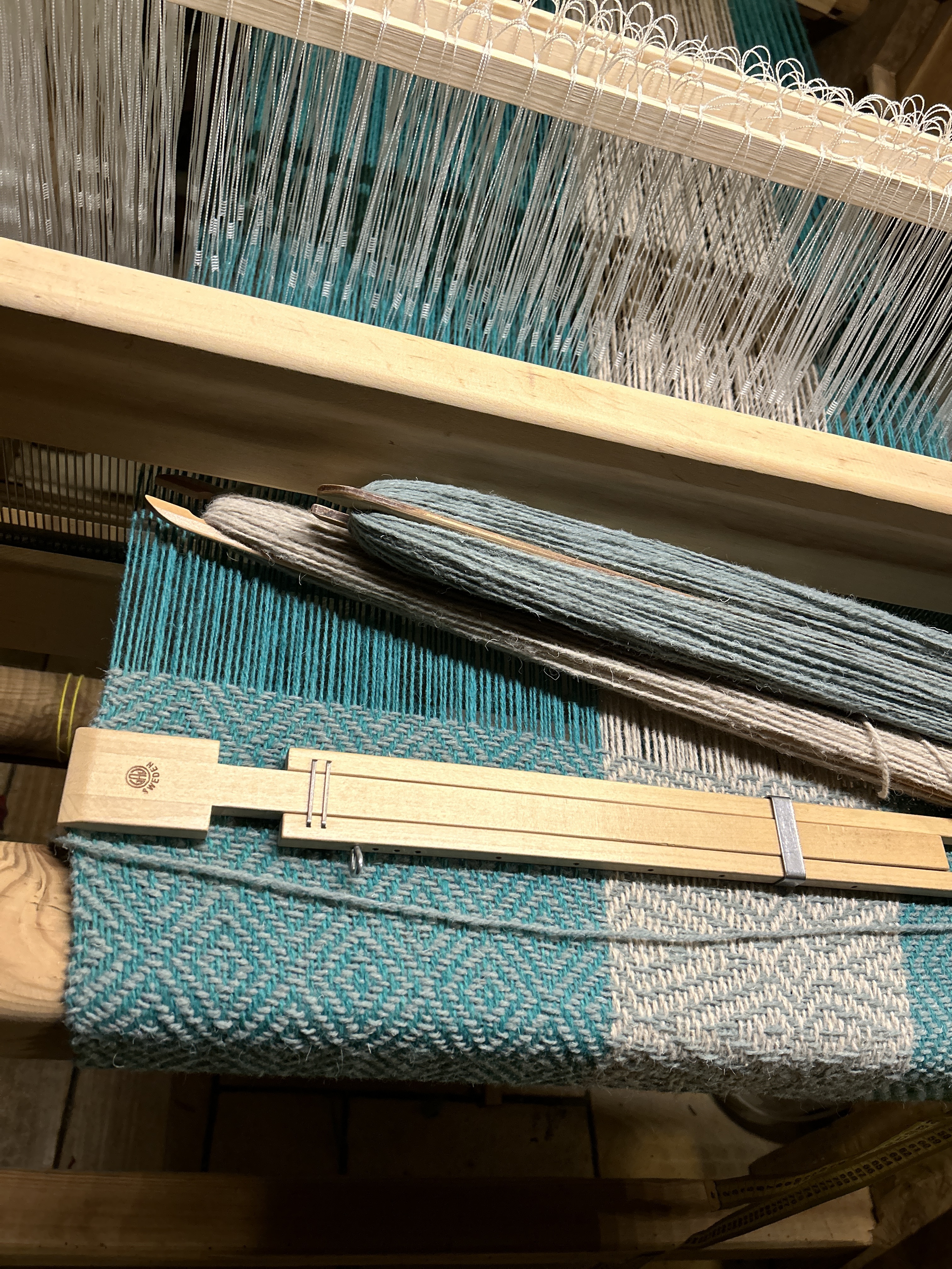 Kolory: szmaragdowa zieleń i kremowy pasek, w osnowie, wątek – delikatna mięta