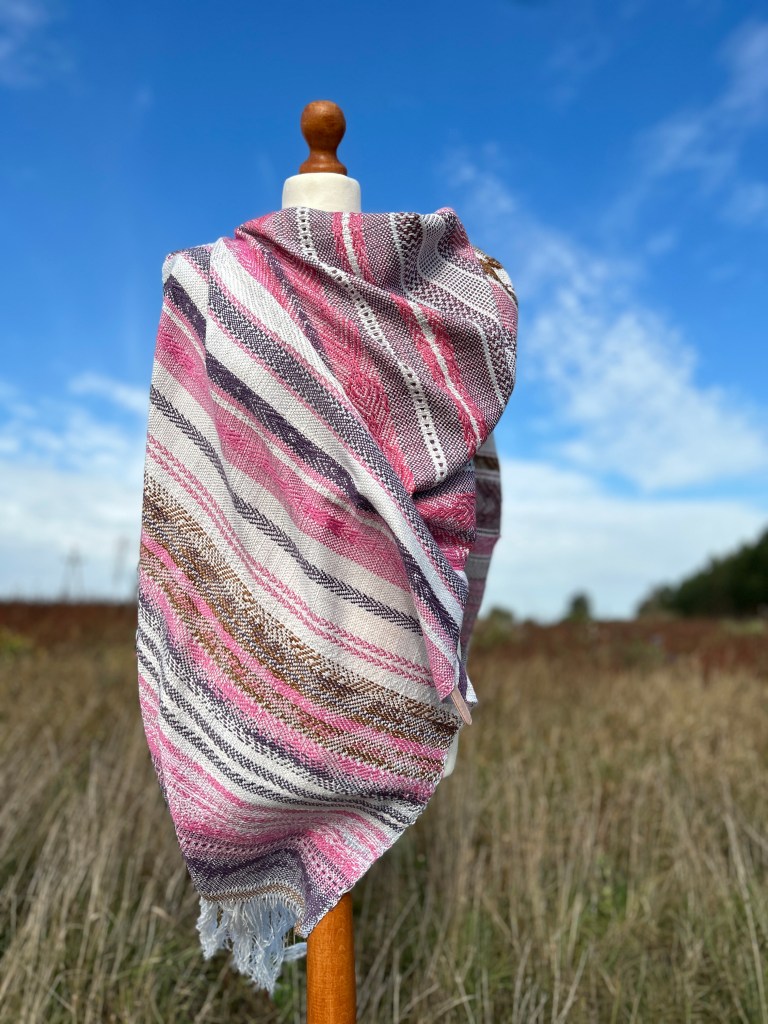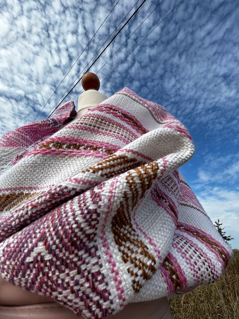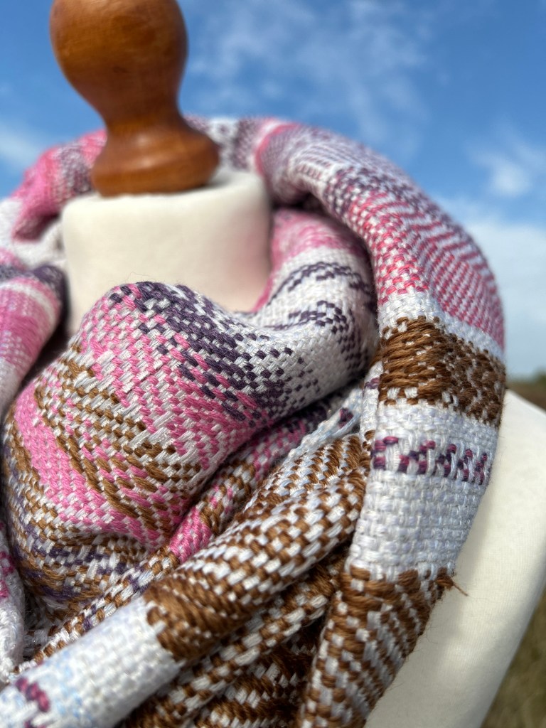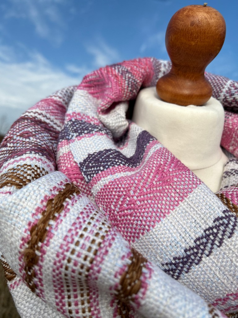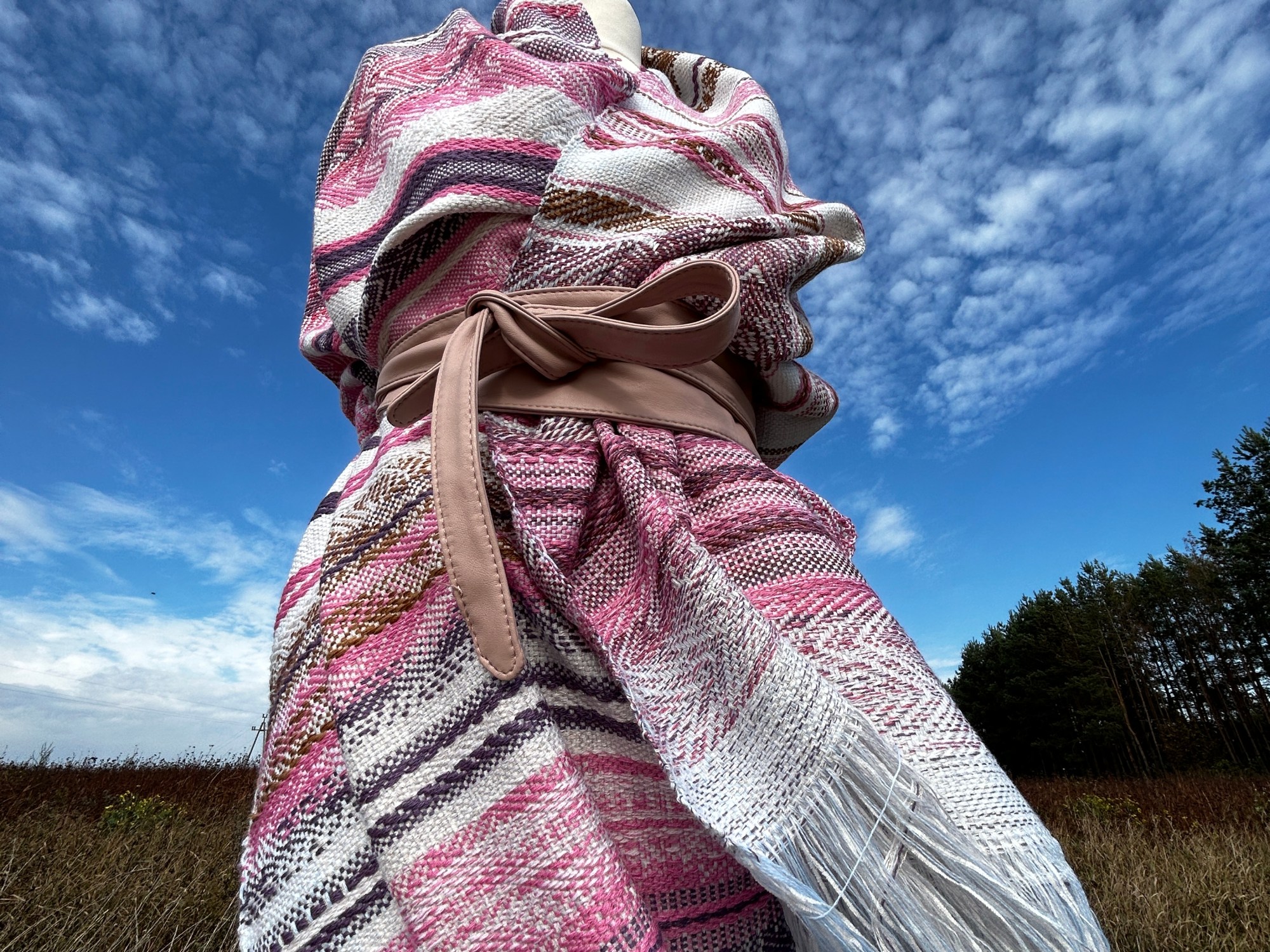 Przedstawiona chusta jest wykonana z niezwykle miękkiego materiału. Jej osnowa została stworzona z wysokiej jakości bawełny, wzbogaconej o delikatne włókna jedwabiu, co nadaje jej wyjątkowy komfort noszenia. Wzór chusty składa się głównie z odcieni bieli, który przeplata się z eleganckim fioletem, różemm i złotym breżem .