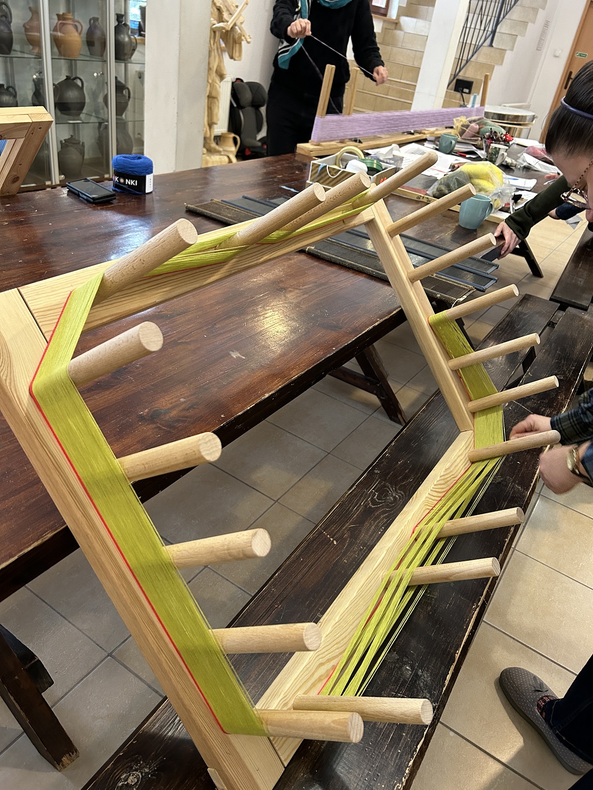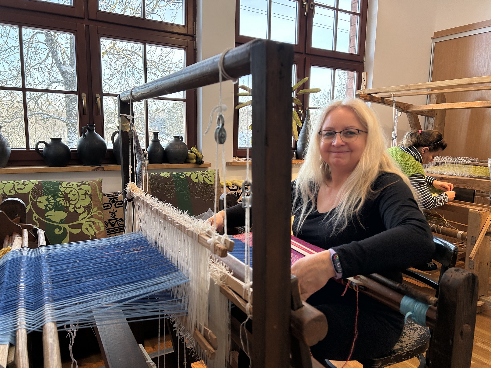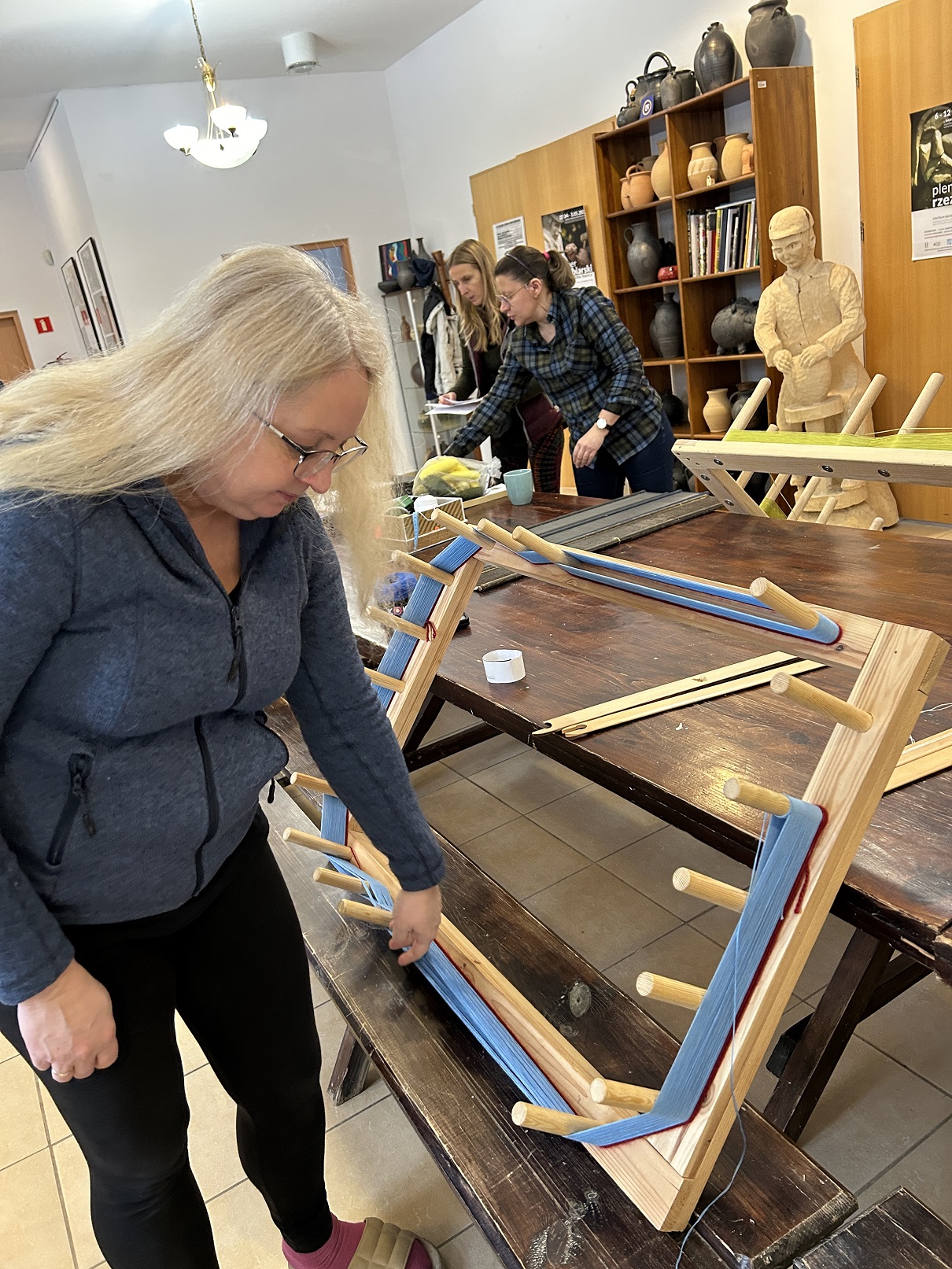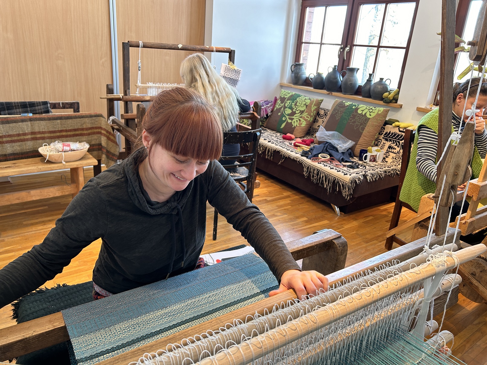 Dodatkowym atutem były warunki atmosferyczne – idealna zimowa aura, która udzieliła się wszystkim. Słońce rozświetlające krystalicznie błyszczący śnieg oraz lekki szron, dodawały magicznego nastroju zwłaszcza w momencie odwiedzin lokalnych artystów. Wizyty u garncarza i łyżkarza wyraźnie wzbogaciły program, otwierając uczestnikom okno na inne formy rzemiosła artystycznego i pozwoliły na docenienie umiejętności i tradycji rzemieślniczych tej okolicy. Warto zauważyć, że zarówno tworzenie ceramiki, jak i rzeźbienie w drewnie to umiejętności wymagające nie tylko precyzji, ale i cierpliwości, tak więc były idealnym uzupełnieniem działań tkackich.