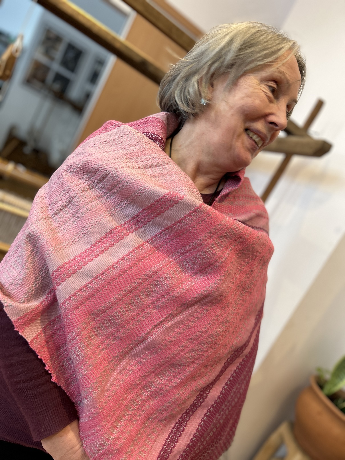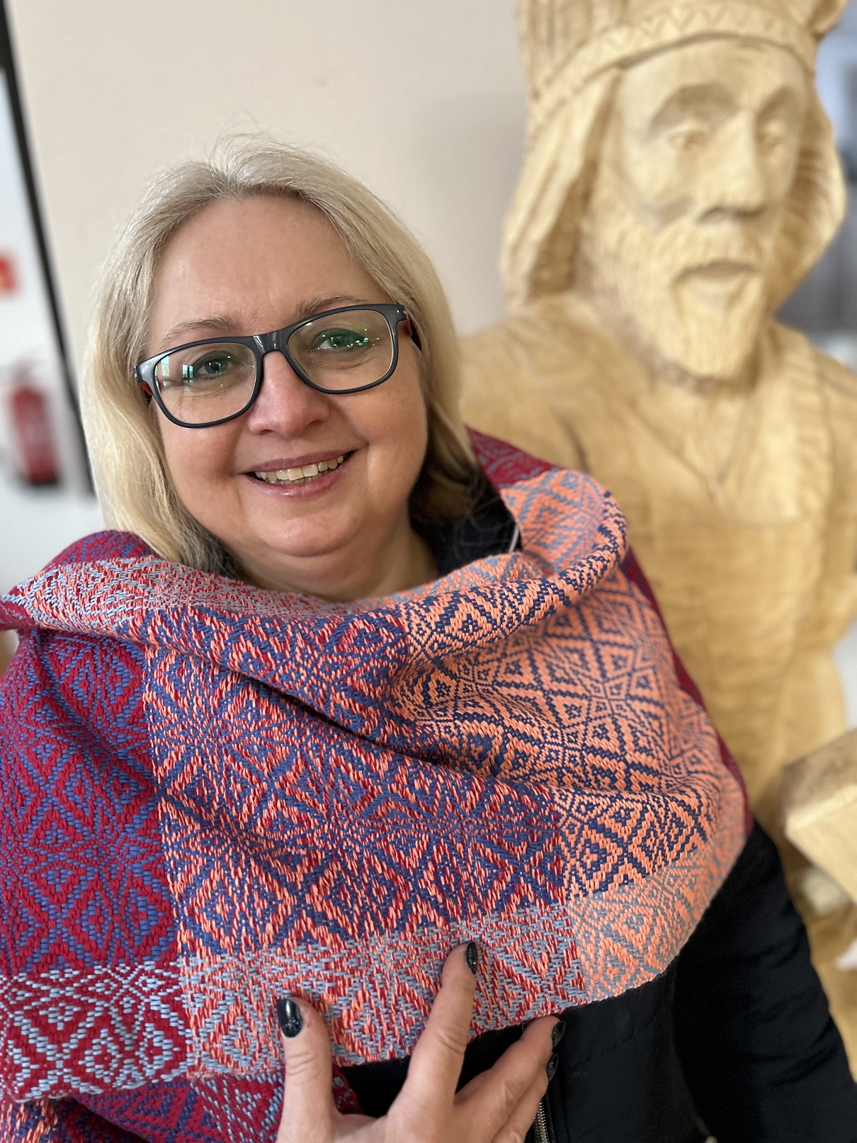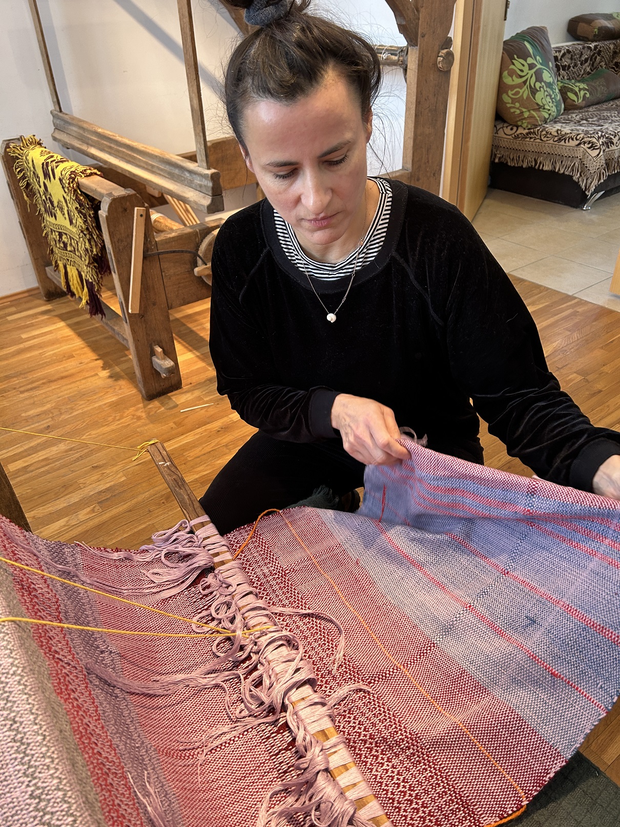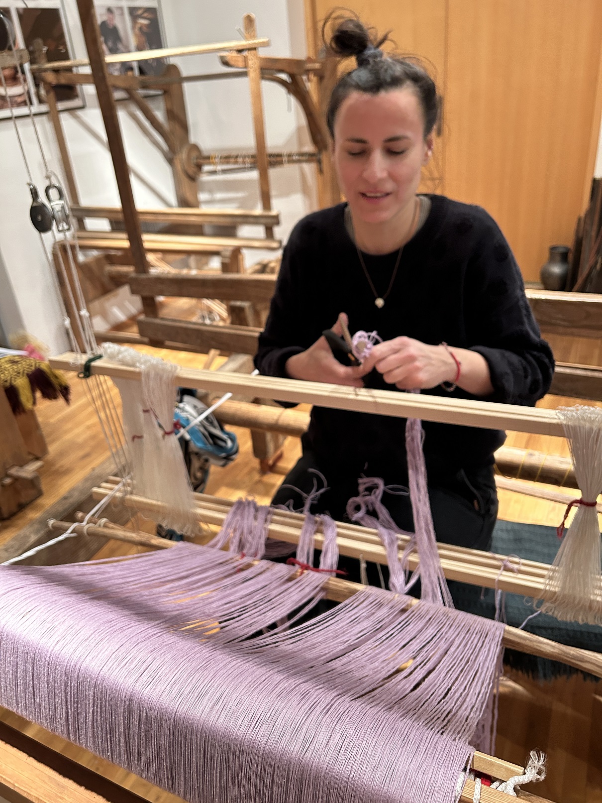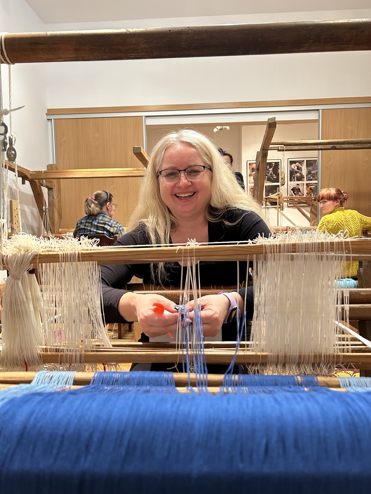 Dodatkowym atutem były warunki atmosferyczne – idealna zimowa aura, która udzieliła się wszystkim. Słońce rozświetlające krystalicznie błyszczący śnieg oraz lekki szron, dodawały magicznego nastroju zwłaszcza w momencie odwiedzin lokalnych artystów. Wizyty u garncarza i łyżkarza wyraźnie wzbogaciły program, otwierając uczestnikom okno na inne formy rzemiosła artystycznego i pozwoliły na docenienie umiejętności i tradycji rzemieślniczych tej okolicy. Warto zauważyć, że zarówno tworzenie ceramiki, jak i rzeźbienie w drewnie to umiejętności wymagające nie tylko precyzji, ale i cierpliwości, tak więc były idealnym uzupełnieniem działań tkackich.