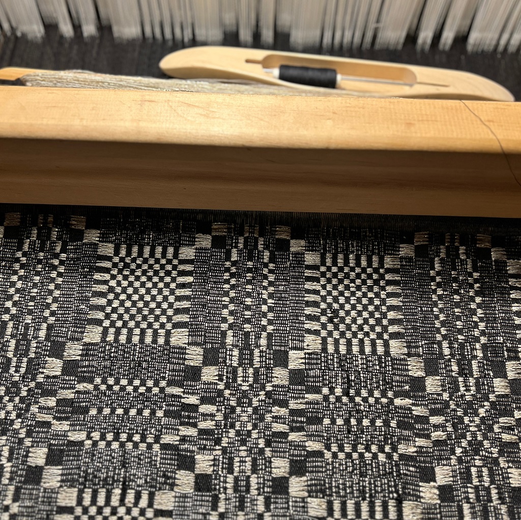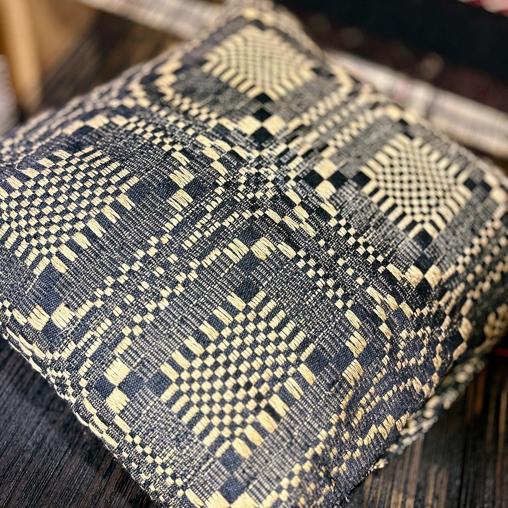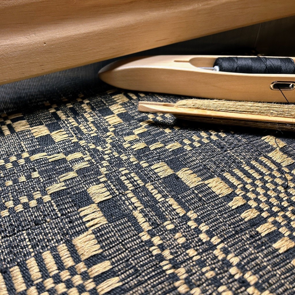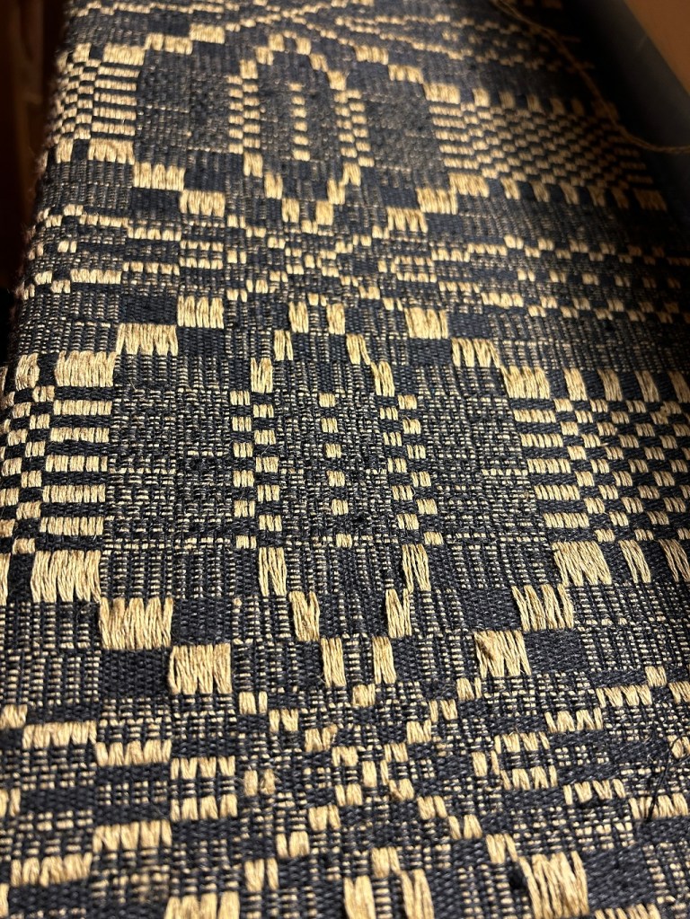Tkanina dekoracyjna – tkana na ludowych krosnach o 4 nicielnicach. Wykonana z lnu w dwóch kolorach: czarny i miodowo-złoty. Zastosowania bieżniki, poduszki.