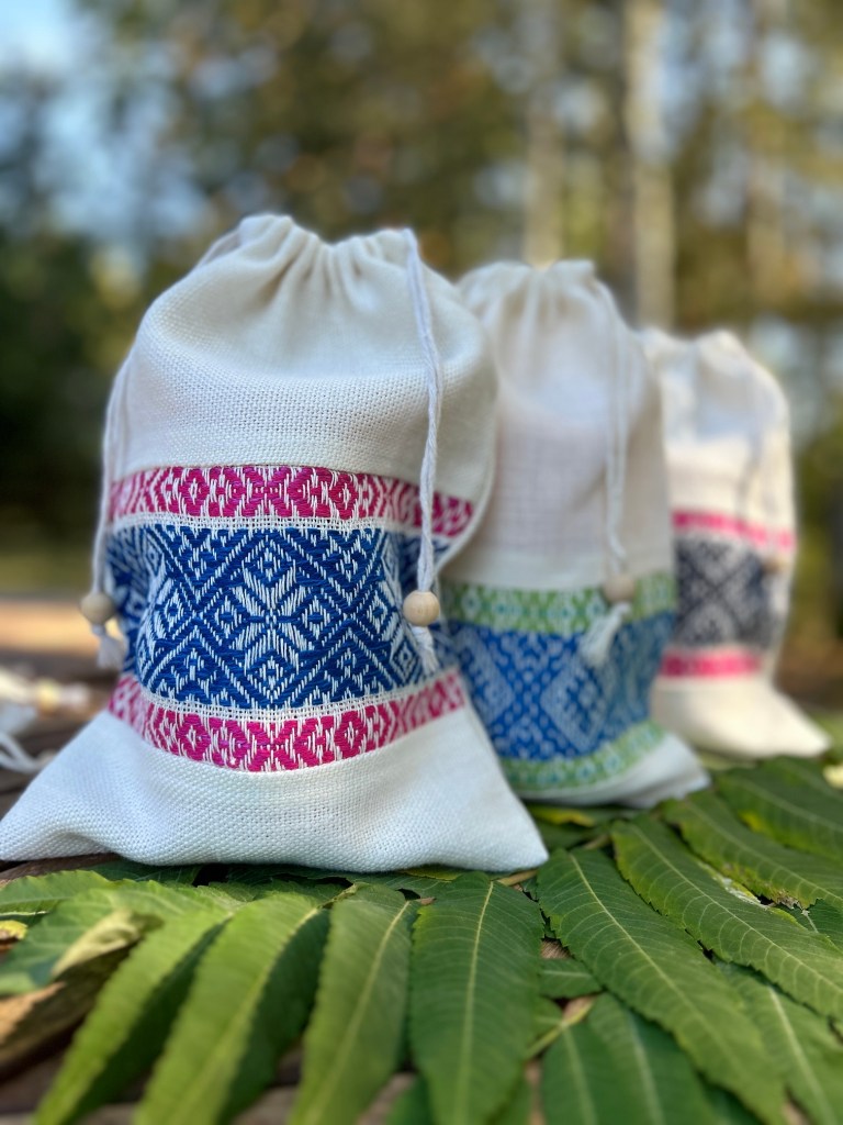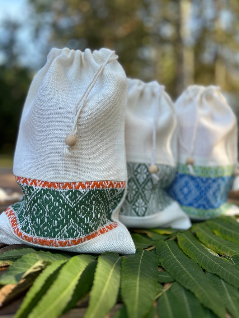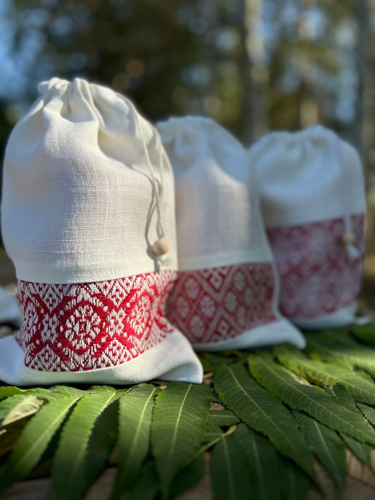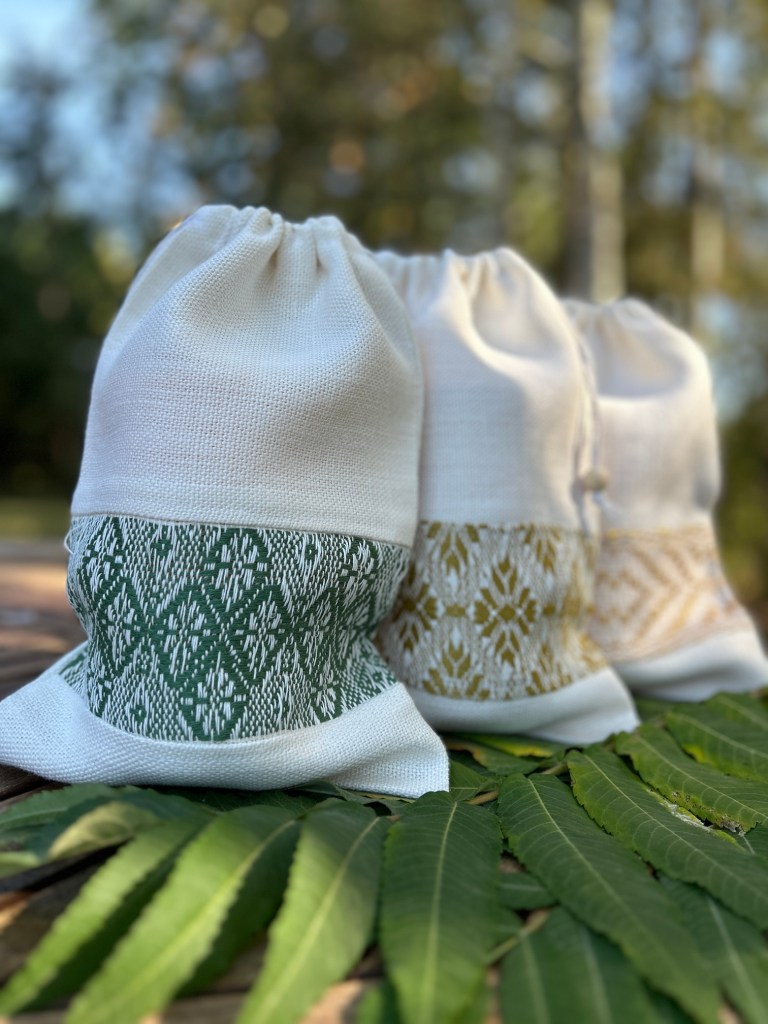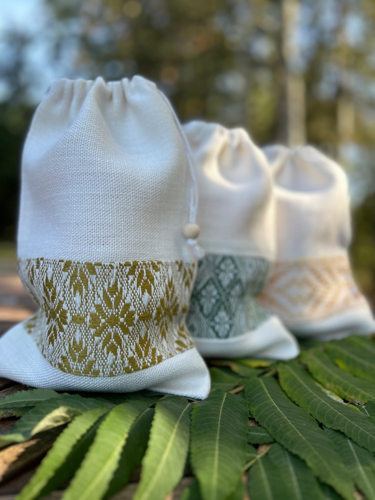 Lniane woreczki z paskiem tkaniny ręcznie tkanym to ekologiczny, trwały, funkcjonalny i piękny produkt, który łączy w sobie tradycję rękodzieła z nowoczesnym podejściem do zrównoważonego stylu życia.