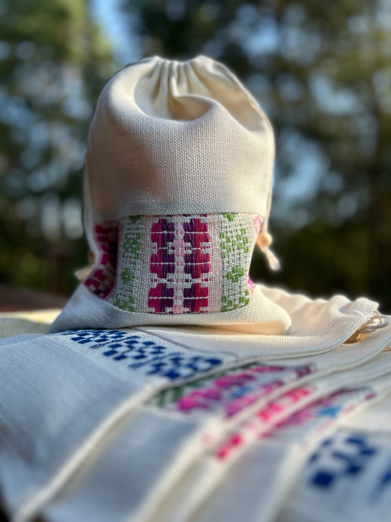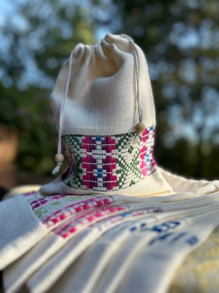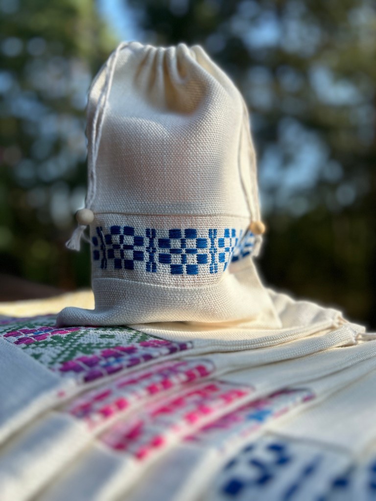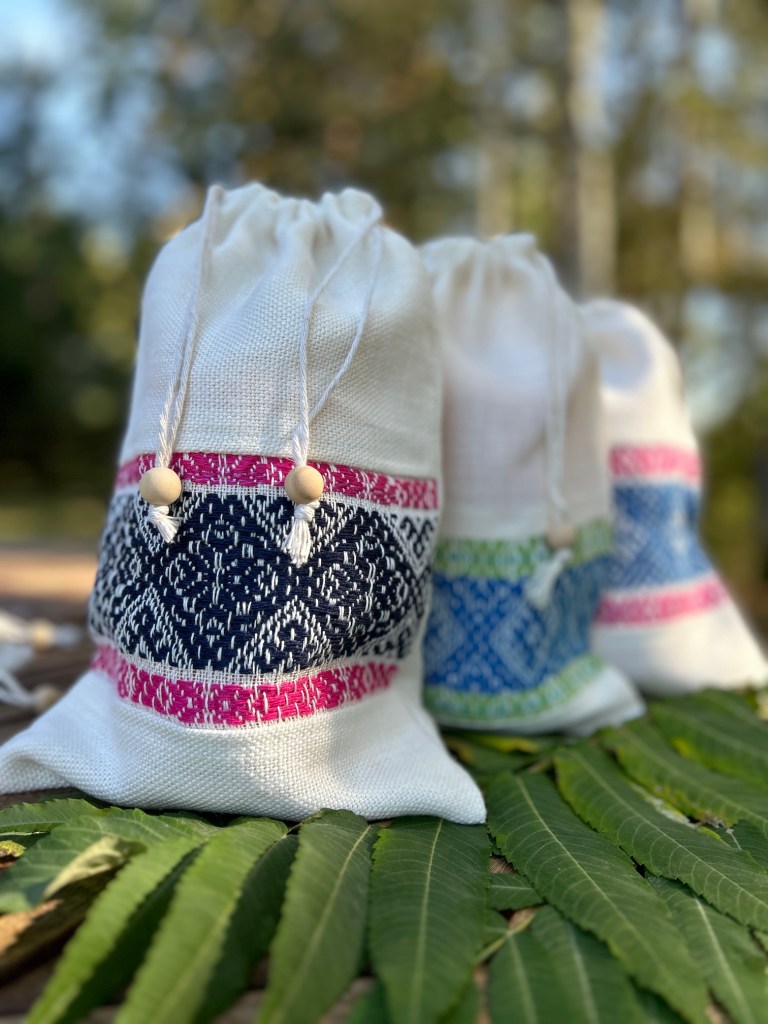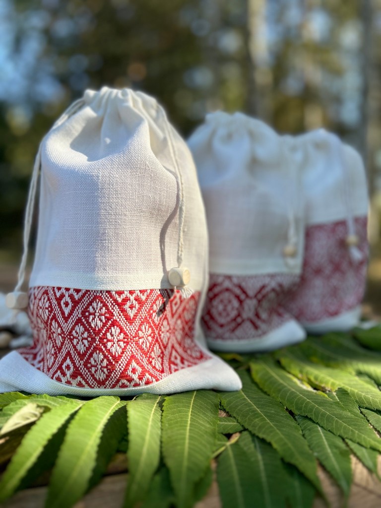 Lniane woreczki z paskiem tkaniny ręcznie tkanym to ekologiczny, trwały, funkcjonalny i piękny produkt, który łączy w sobie tradycję rękodzieła z nowoczesnym podejściem do zrównoważonego stylu życia.