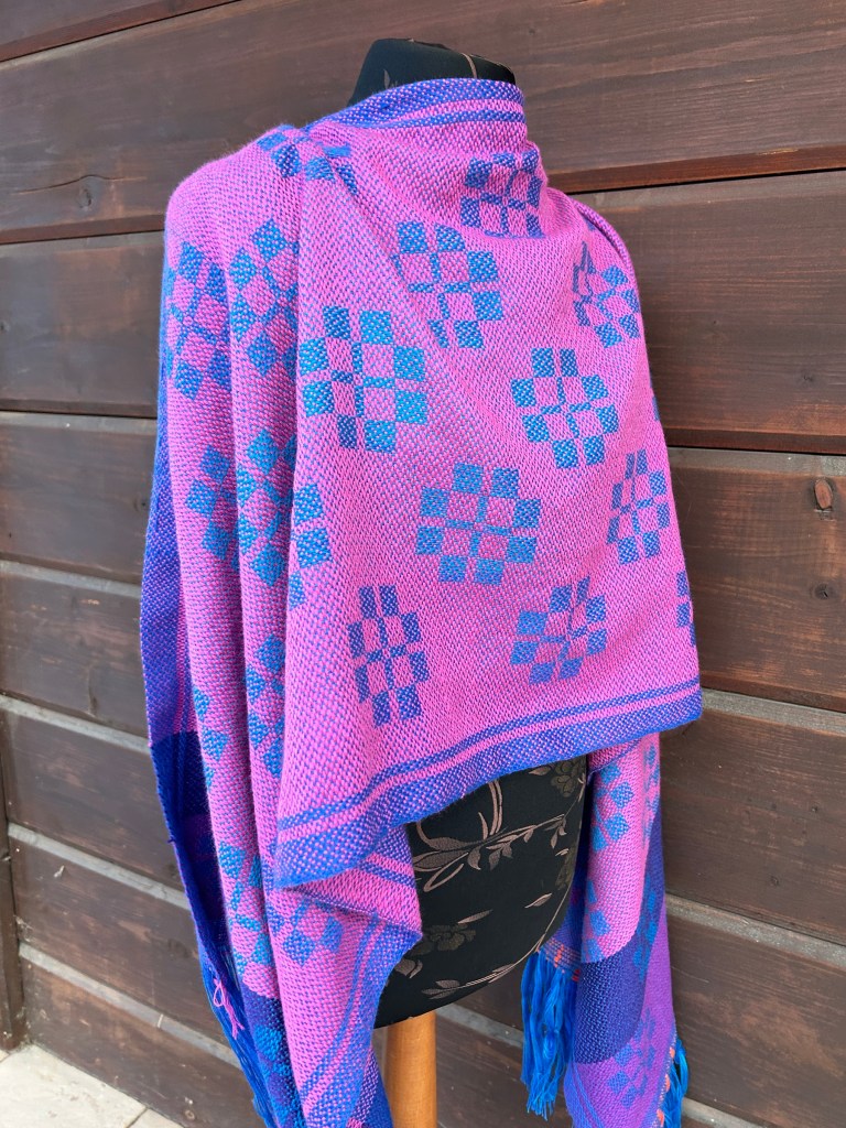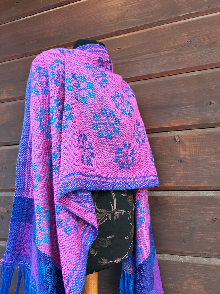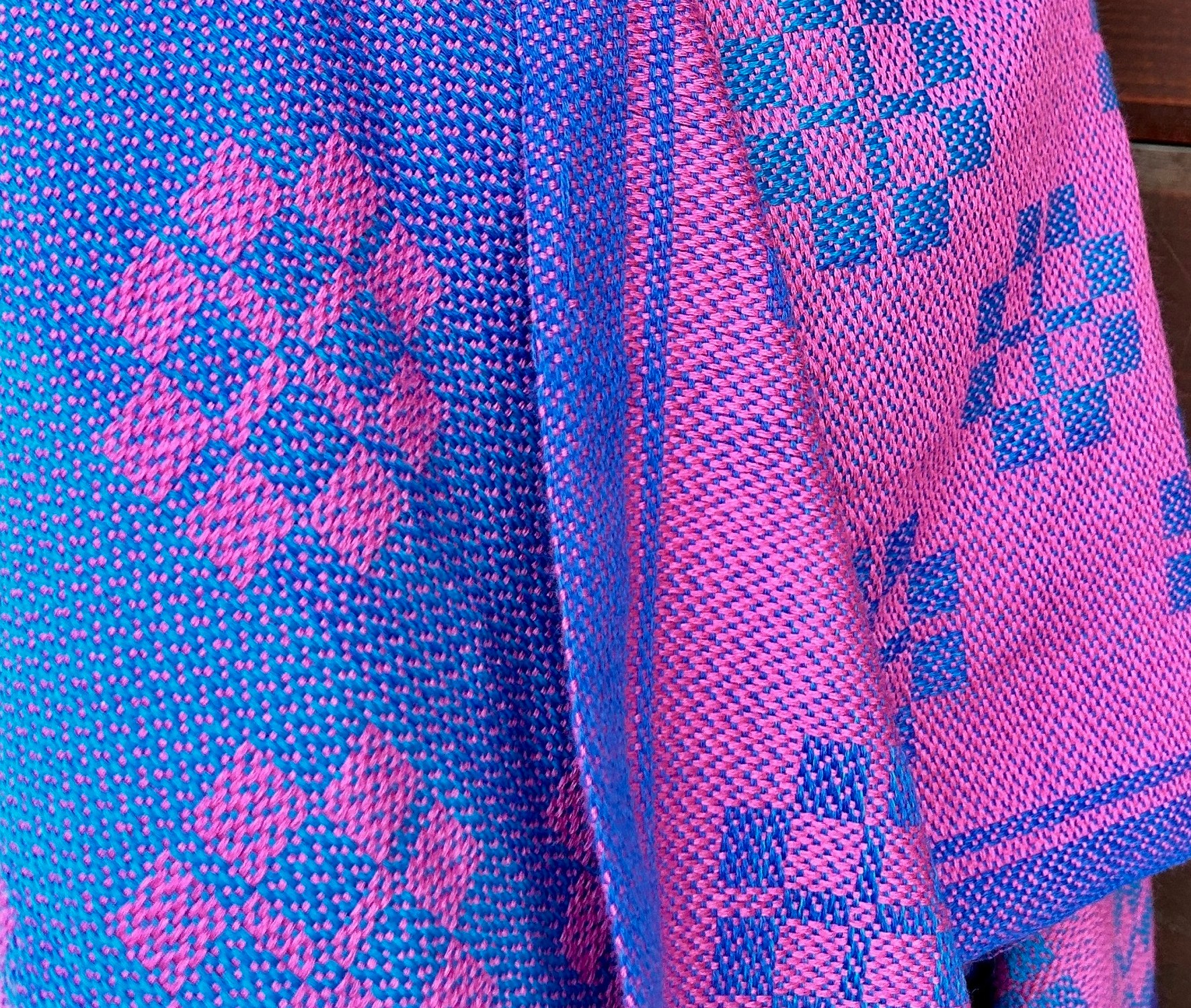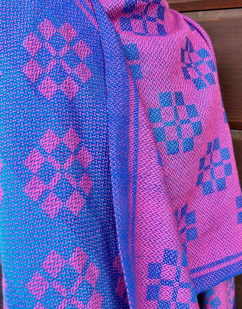 Adamaszkowa Róża Nocy to wyjątkowy, ręcznie tkany szal z luksusowej wełny merynosów, stworzony z niezwykłą dbałością o każdy detal. Ten szal zachwyca bogatym adamaszkowym splotem, który nadaje mu głębię i subtelny połysk, tworząc misterny wzór o motywie gwiazdy. Połączenie różowych i niebieskich odcieni sprawia, że przywodzi na myśl piękno nocnego nieba rozświetlonego gwiazdami.