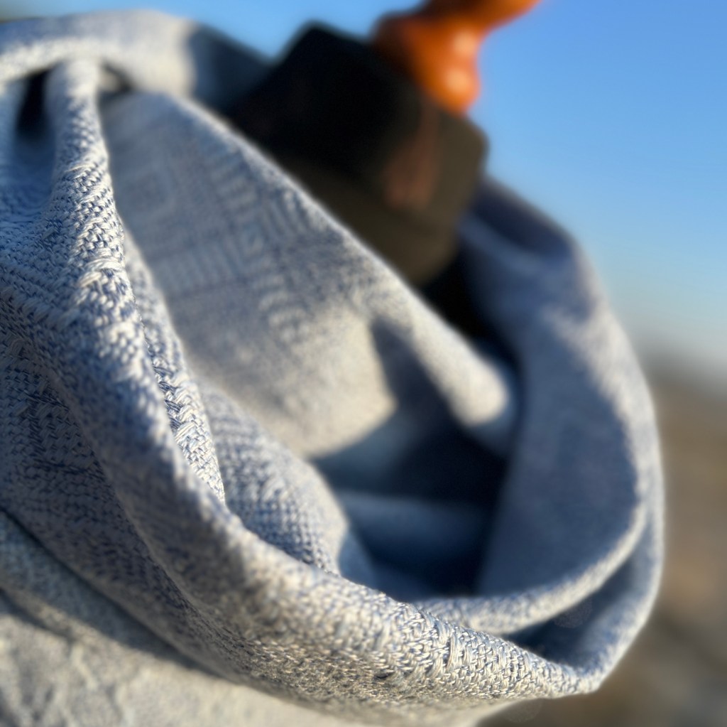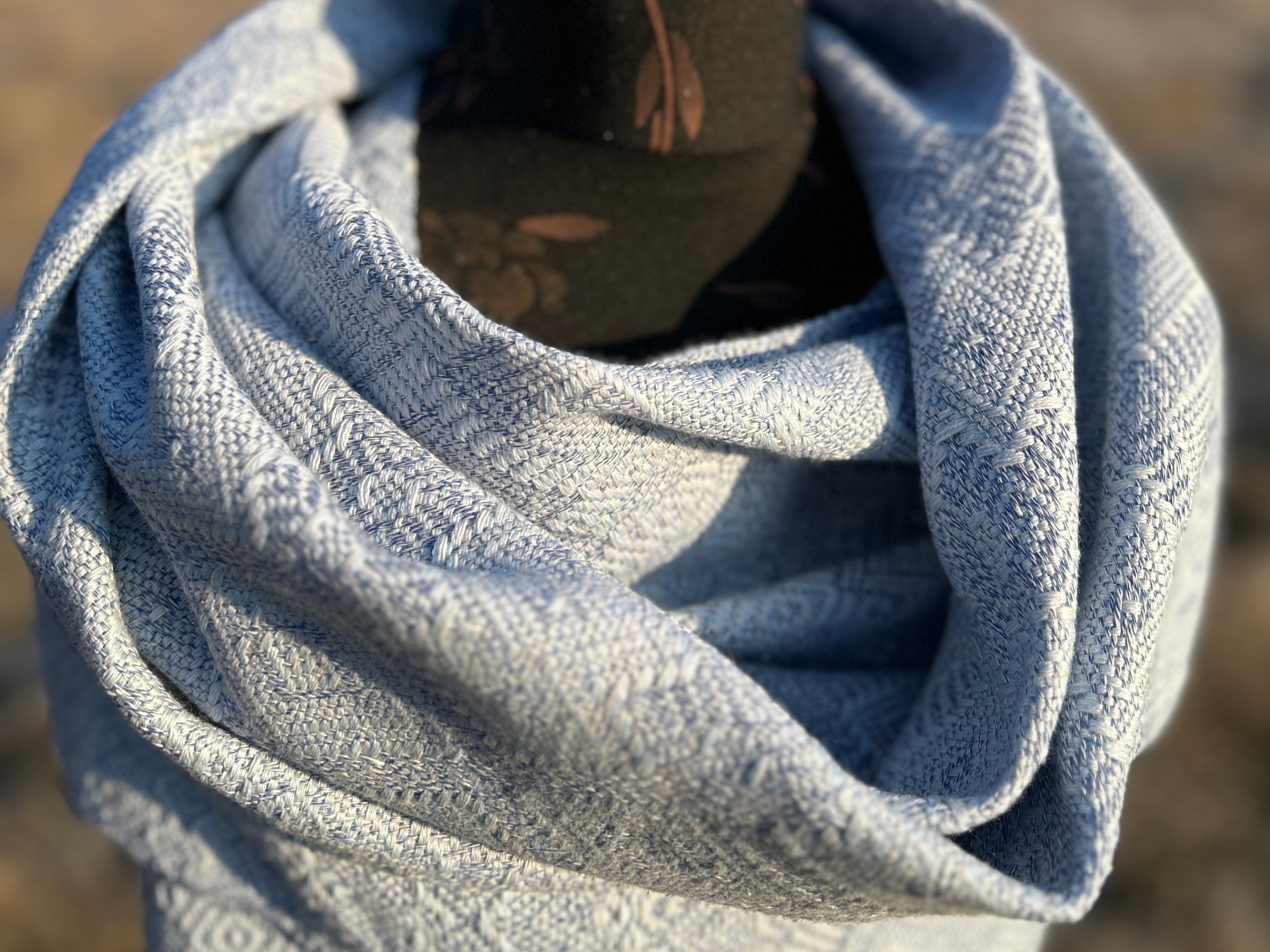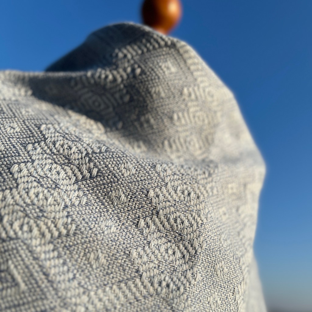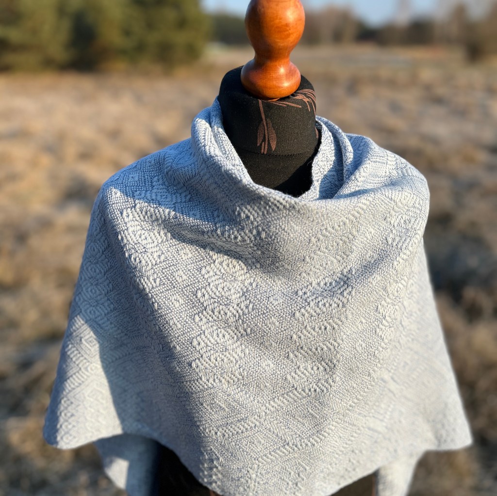 Szal lniano-wełniany „Szron na oknie” to dzieło, które oddaje magię zimowego poranka zamkniętą w delikatnej, ciepłej tkaninie. Inspirowany naturalnymi wzorami szronu na szybach, szal łączy subtelne odcienie bieli, srebra i bladego błękitu, tworząc harmonijną, niemal eteryczną paletę. Delikatne wzory przypominające mroźne pióra lub filigranowe gałązki zostały starannie wplecione w strukturę tkaniny, dodając jej wyjątkowego charakteru.