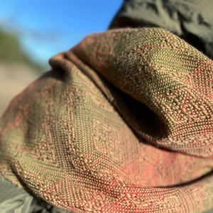 Ręcznie tkany komin, idealny na chłodniejsze dni, doskonały do noszenia na wierzchnie okrycie. Kolorystyka wątku, która płynnie przechodzi od ceglastej pomarańczy, przez ciepły brąz, aż po zgaszoną zieleń, oparta jest na karmelowej osnowie. To dodatek, który zapewni komfort i elegancję każdej stylizacji. Wymiary: 55 x 100(w obwodzie)