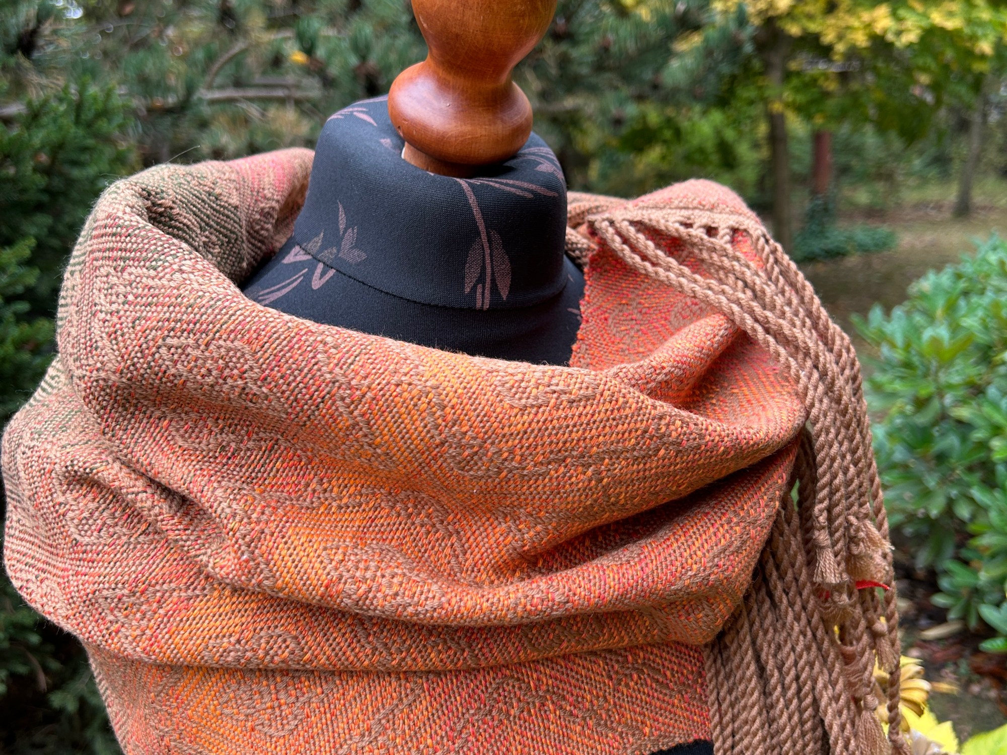 Ręcznie tkany komin, idealny na chłodniejsze dni, doskonały do noszenia na wierzchnie okrycie. Kolorystyka wątku, która płynnie przechodzi od ceglastej pomarańczy, przez ciepły brąz, aż po zgaszoną zieleń, oparta jest na karmelowej osnowie. To dodatek, który zapewni komfort i elegancję każdej stylizacji. Wymiary: 55 x 100(w obwodzie)