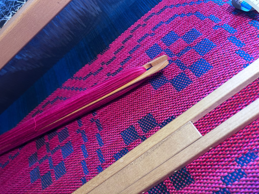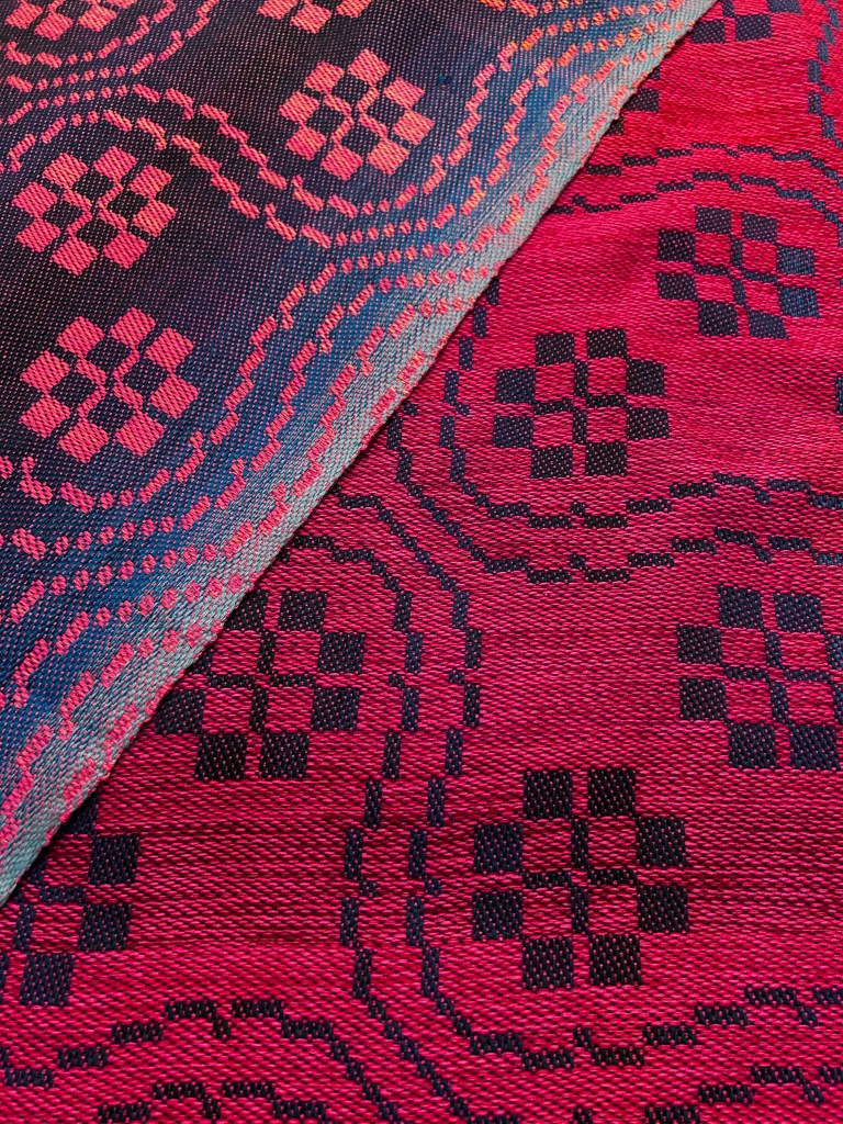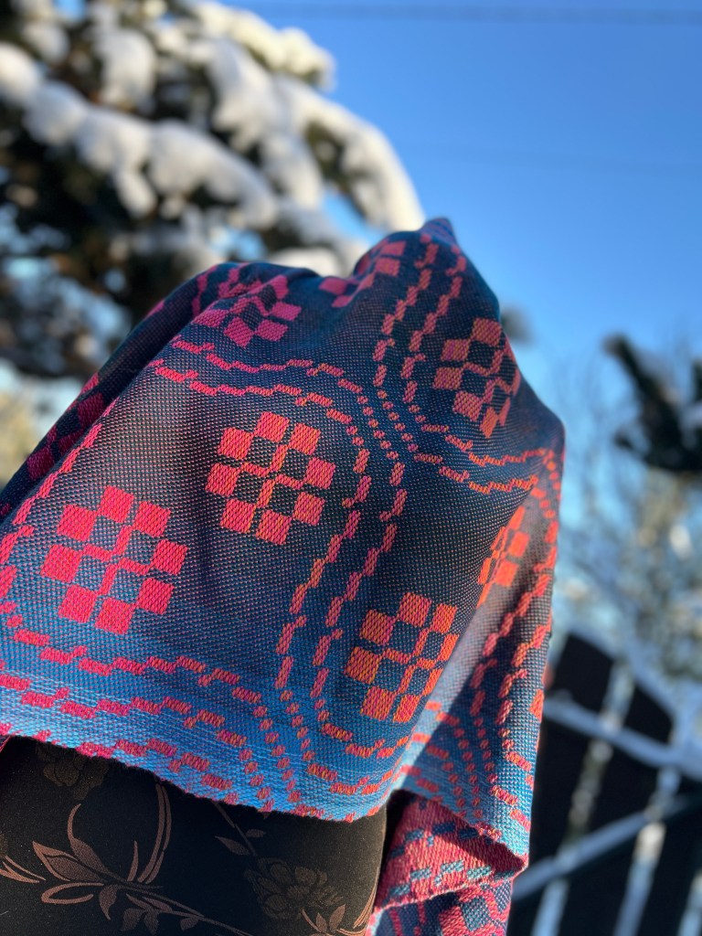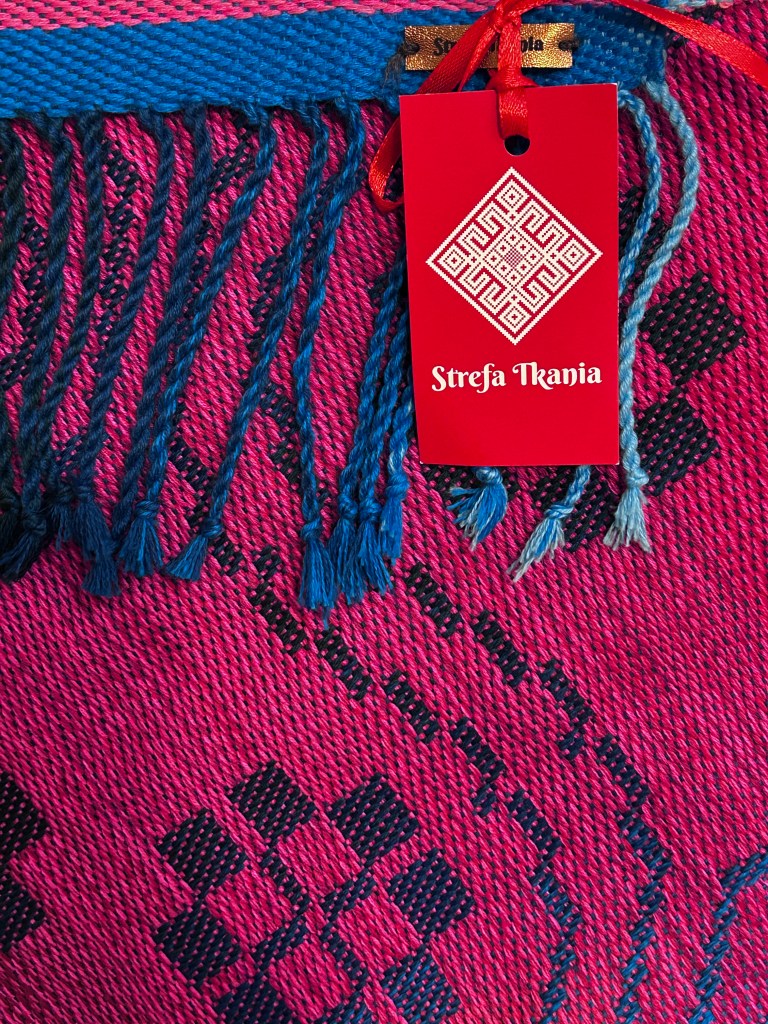 Szal przyciąga wzrok głęboką paletą barw: od szlachetnego granatu i błękitu, aż po energetyczny róż karminowy. Wykorzystany splot adamaszkowy sprawia, że szal jest całkowicie dwustronny, oferując dwa różne oblicza: