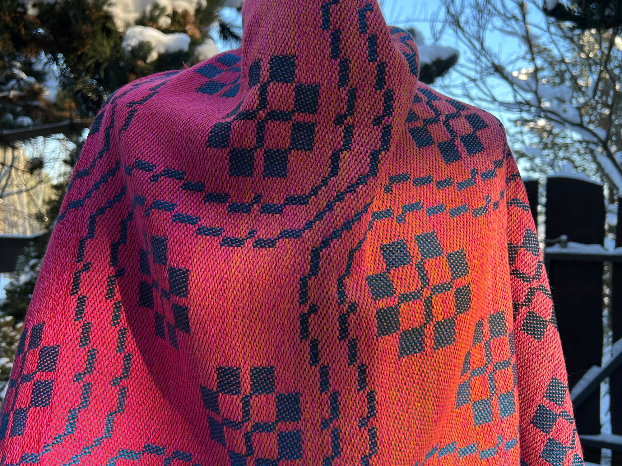 Szal przyciąga wzrok głęboką paletą barw: od szlachetnego granatu i błękitu, aż po energetyczny róż karminowy. Wykorzystany splot adamaszkowy sprawia, że szal jest całkowicie dwustronny, oferując dwa różne oblicza: